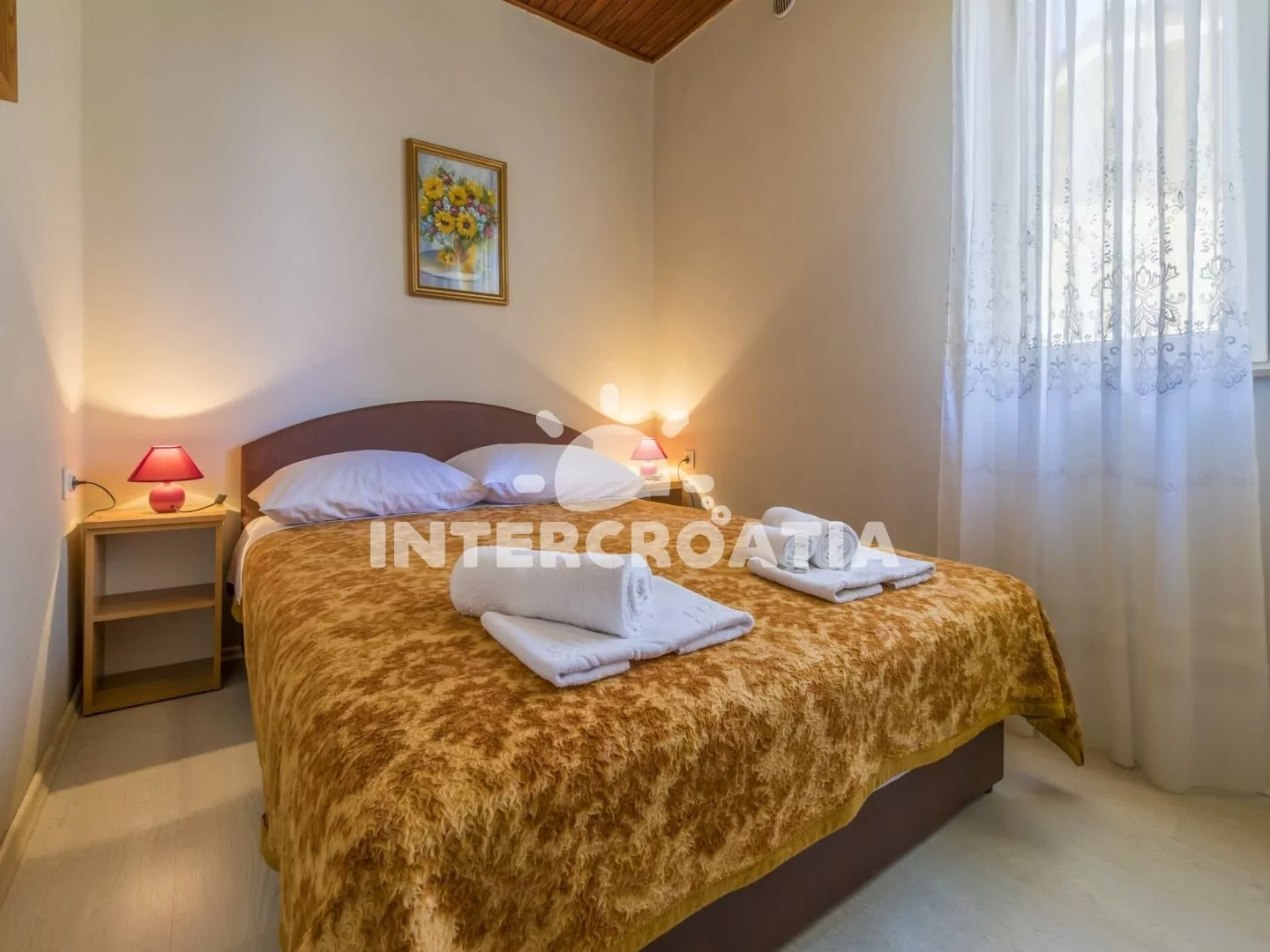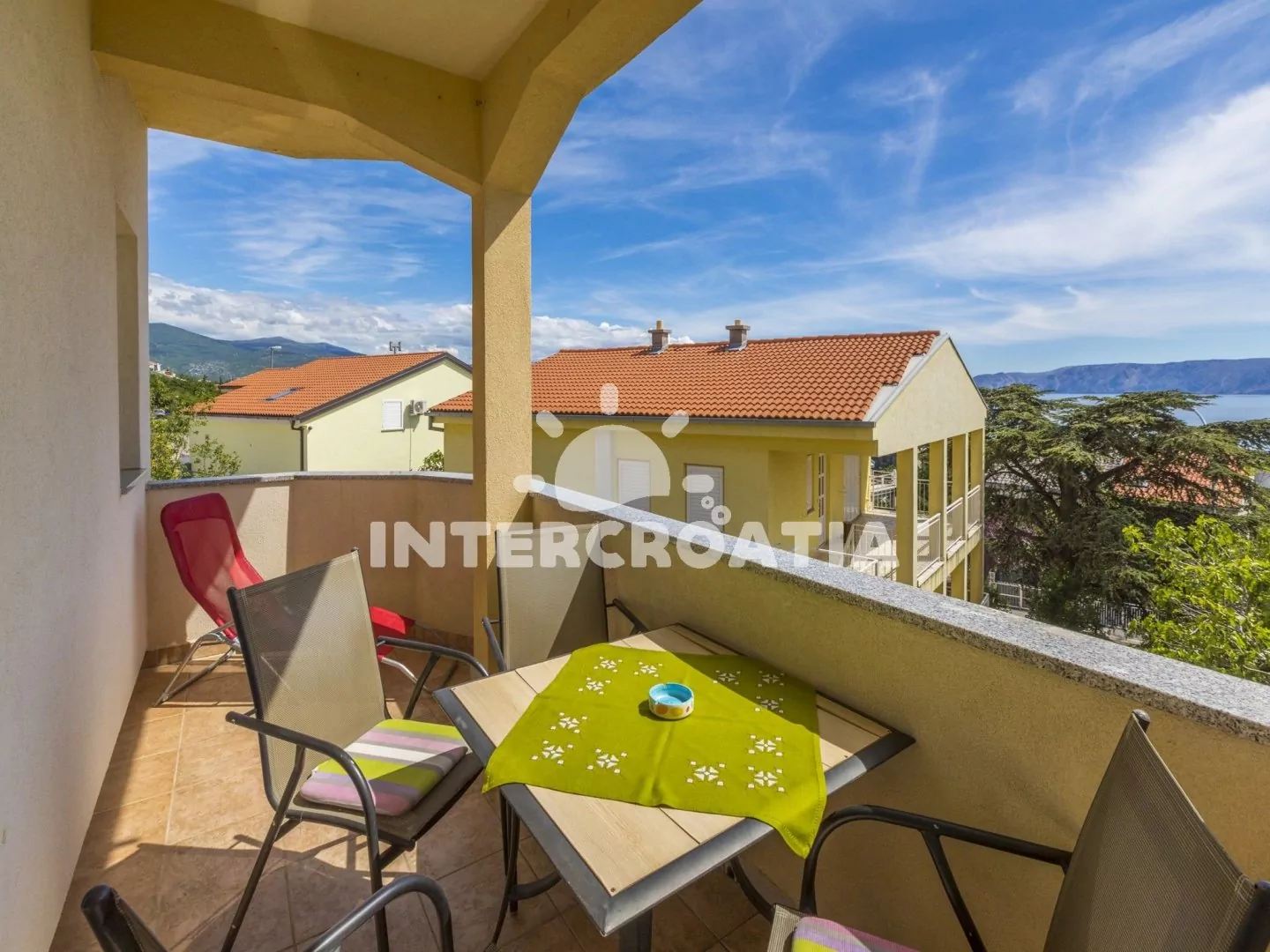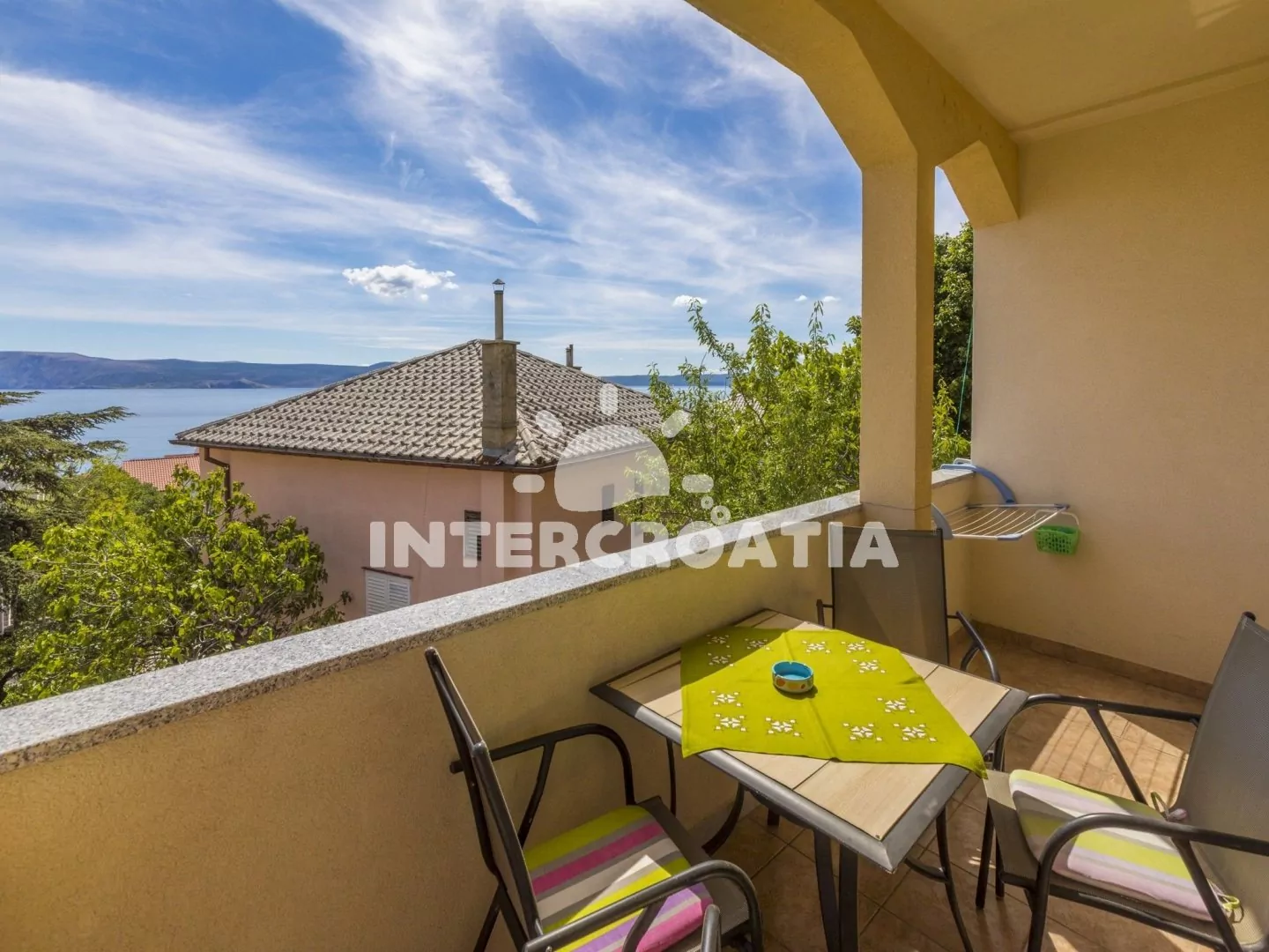 Apartmán s terasou a výhledem na moře se nachází v prvním patře domu a je vhodný pro 2 až 4 osoby. Obývací pokoj je spojený s kuchyní. Kuchyňská linka je vybavena dvouplotýnkovým sporákem, rychlovarnou konvicí, kávovarem, toustovačem, nádobím a lednicí s mrazákem. Obývací pokoj s jídelním stolem pro 4 osoby, pohovkou (rozložitelná na extra lůžko pro 2 osoby), televizí se satelitním programem, klimatizací a vstupem na terasu. Ložnice je vybavena dvoulůžkem. Koupelna se sprchovým koutem, umyvadlem a wc. Hostům je k dispozici parkování u objektu zdarma.