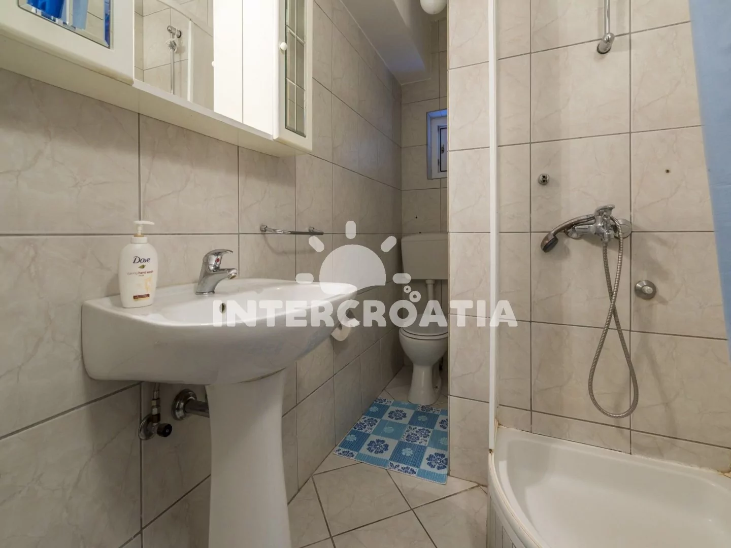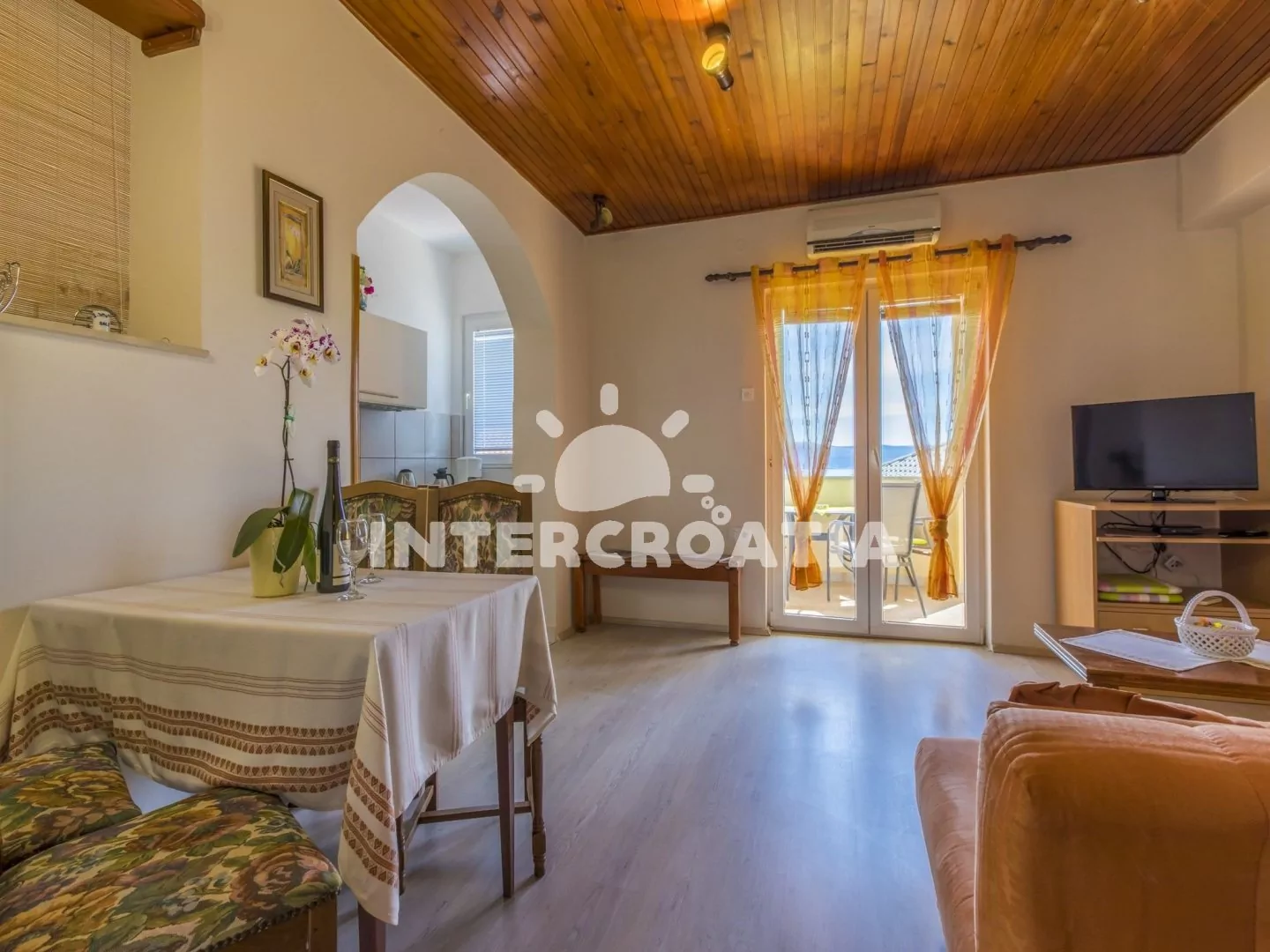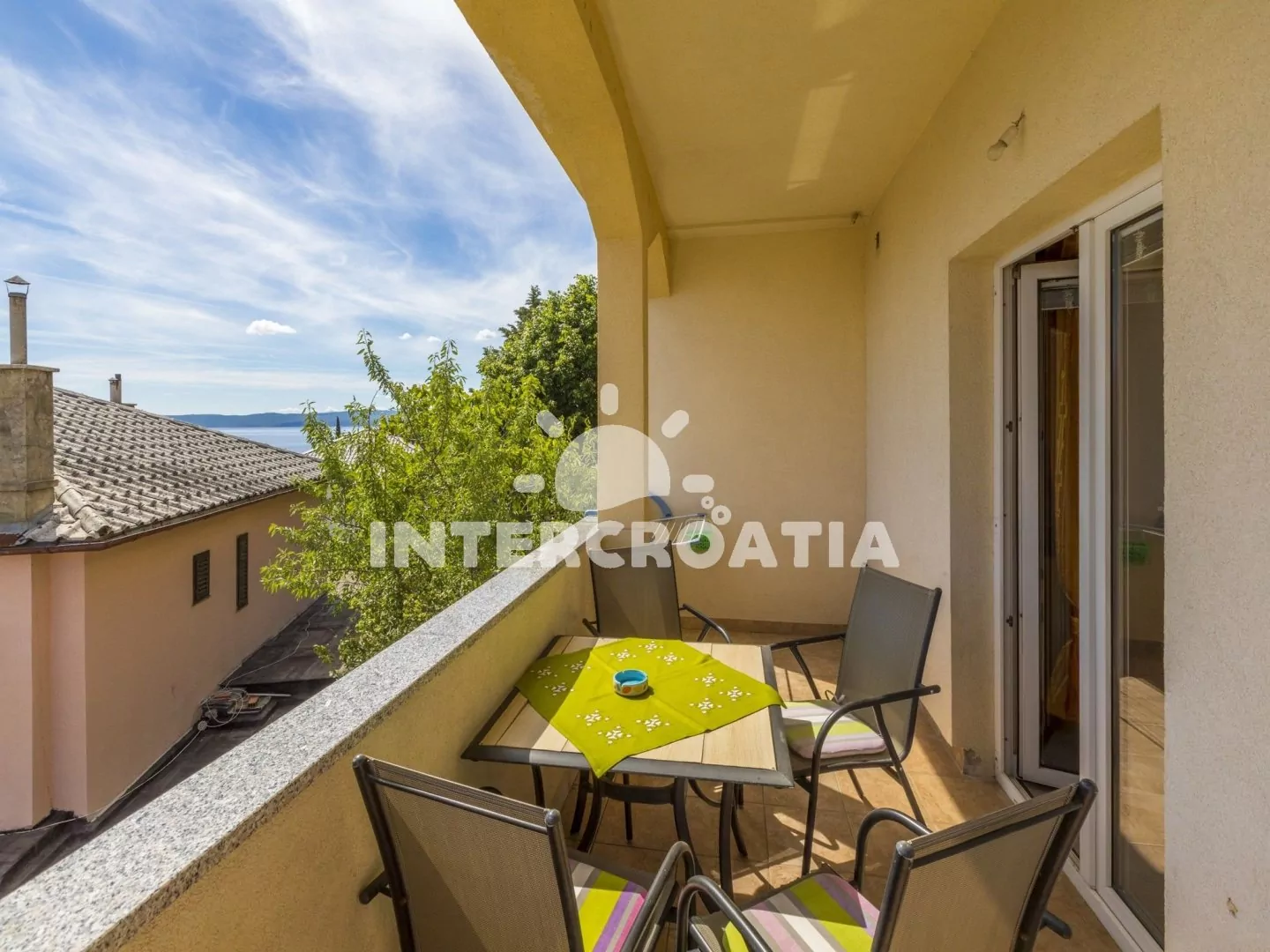 Apartmán s terasou a výhledem na moře se nachází v prvním patře domu a je vhodný pro 2 až 4 osoby. Obývací pokoj je spojený s kuchyní. Kuchyňská linka je vybavena dvouplotýnkovým sporákem, rychlovarnou konvicí, kávovarem, toustovačem, nádobím a lednicí s mrazákem. Obývací pokoj s jídelním stolem pro 4 osoby, pohovkou (rozložitelná na extra lůžko pro 2 osoby), televizí se satelitním programem, klimatizací a vstupem na terasu. Ložnice je vybavena dvoulůžkem. Koupelna se sprchovým koutem, umyvadlem a wc. Hostům je k dispozici parkování u objektu zdarma.