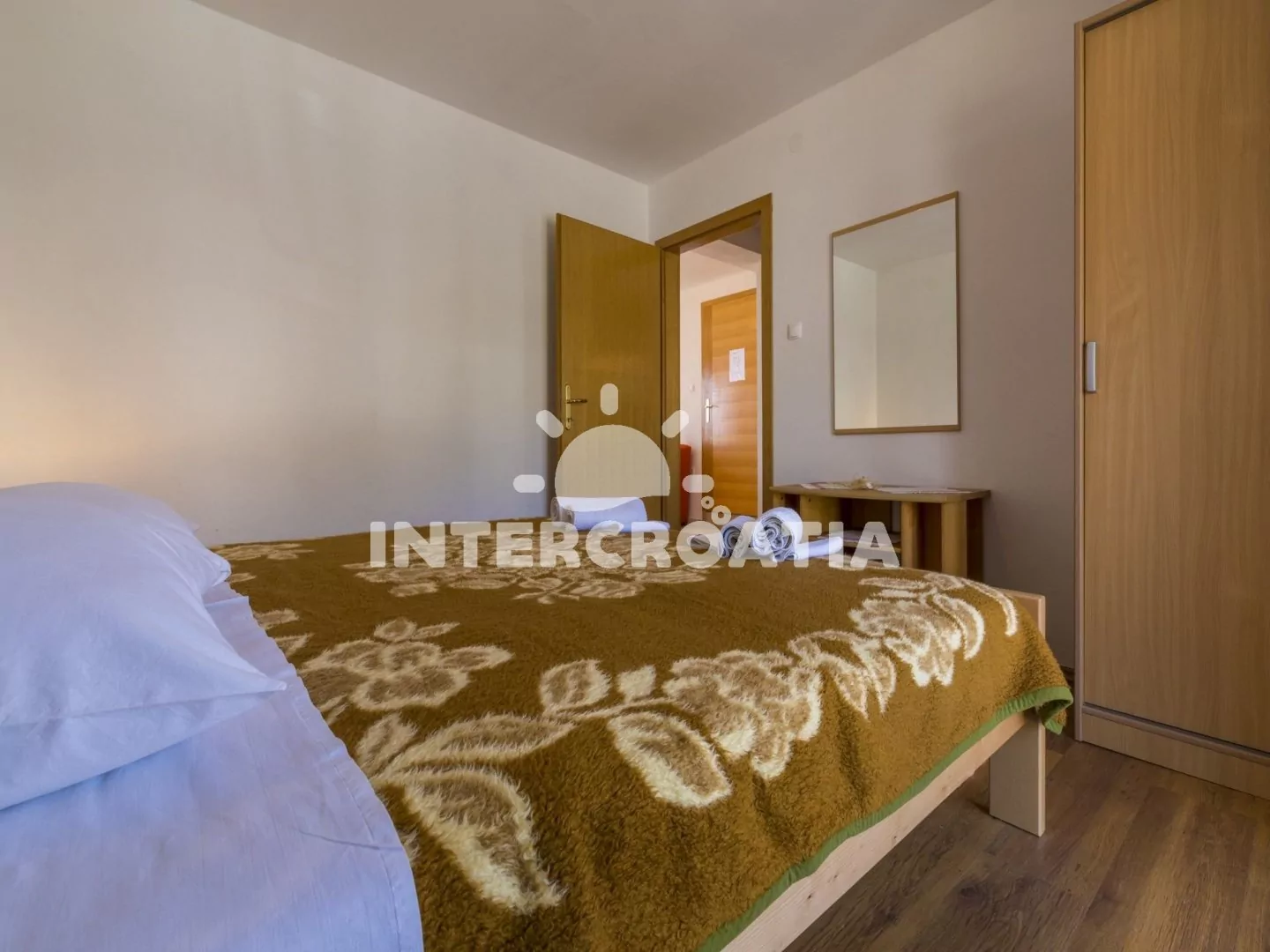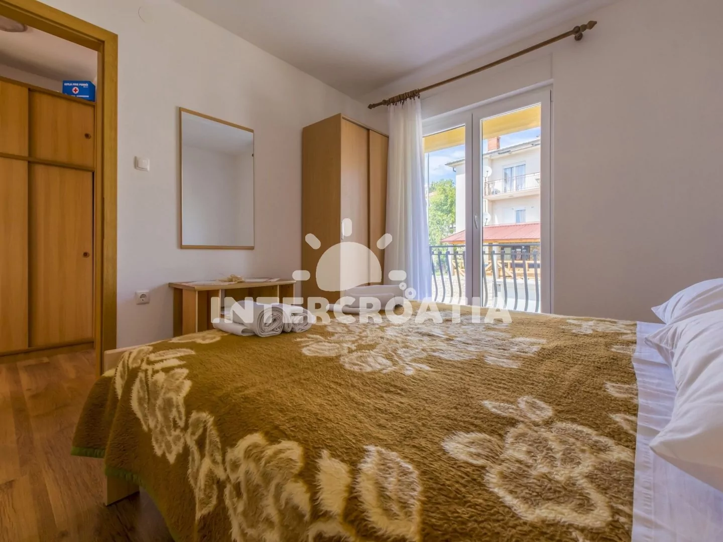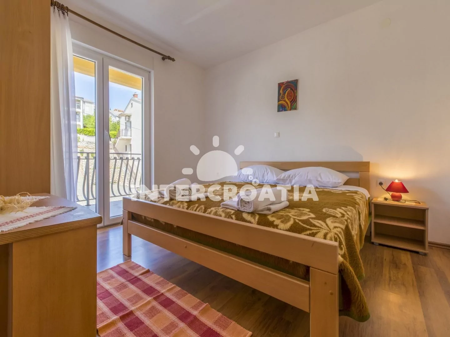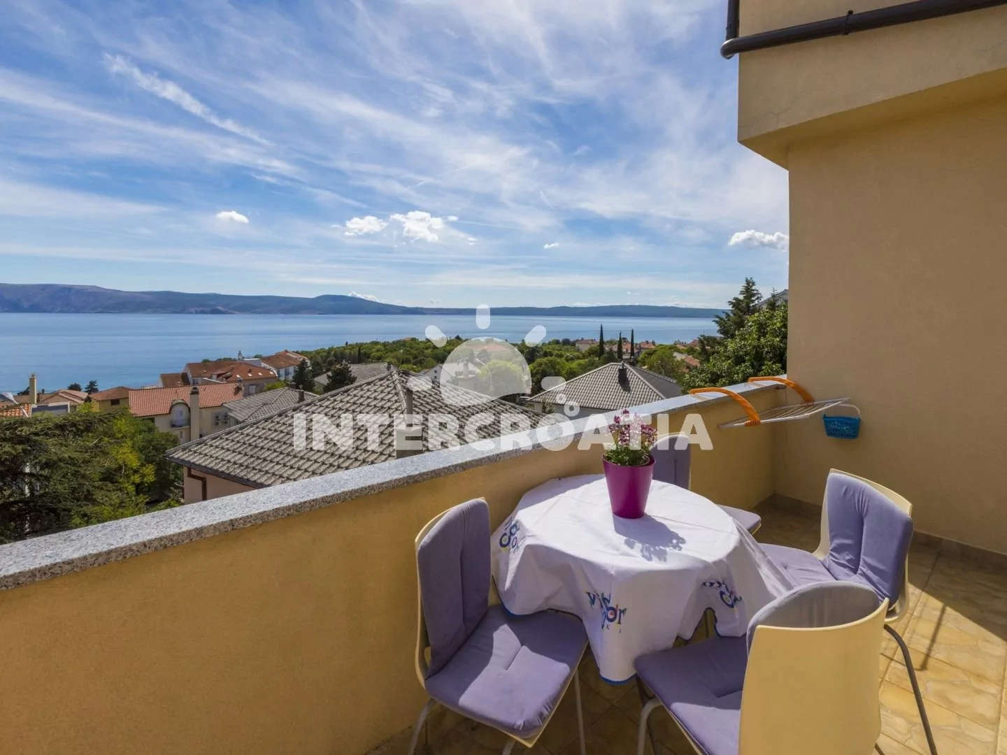 Apartmán s terasou a výhledem na moře se nachází v druhém patře domu a je vhodný pro 2 až 4 osoby. Obývací pokoj je spojený s kuchyní. Kuchyňská linka je vybavena sporákem, rychlovarnou konvicí, kávovarem, nádobím a lednicí s mrazákem. Obývací pokoj s jídelním stolem pro 4 osoby, pohovkou (rozložitelná na extra lůžko pro 2 osoby), televizí se satelitním programem, klimatizací a vstupem na terasu. Ložnice je vybavena dvoulůžkem. Koupelna se sprchovým koutem, umyvadlem a wc. Hostům je k dispozici parkování u objektu zdarma.
