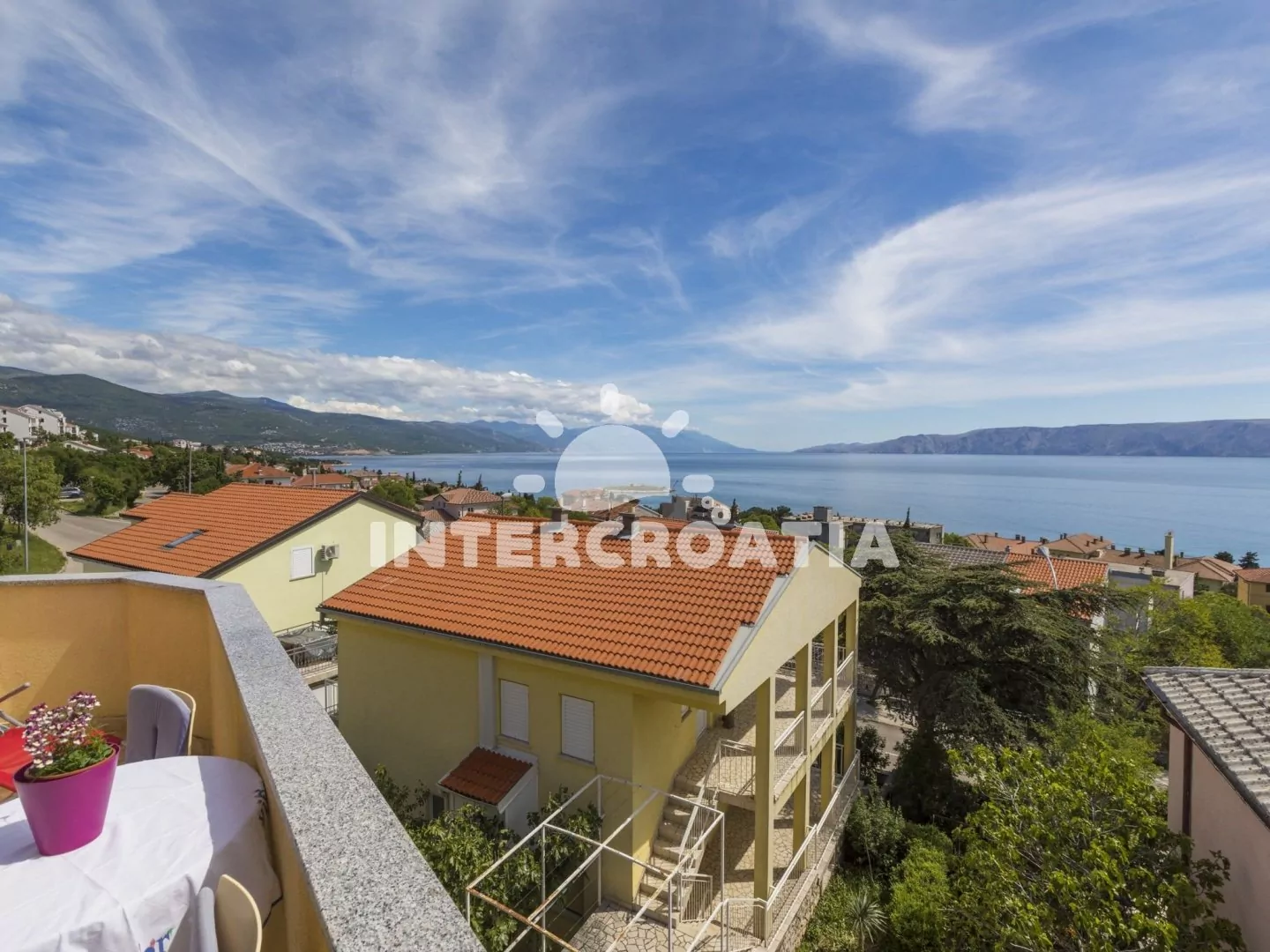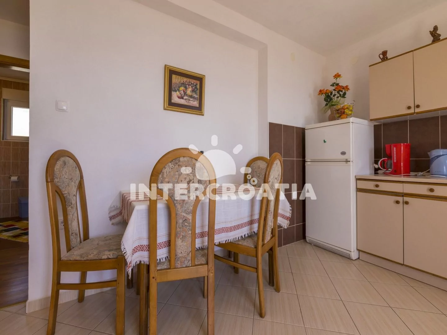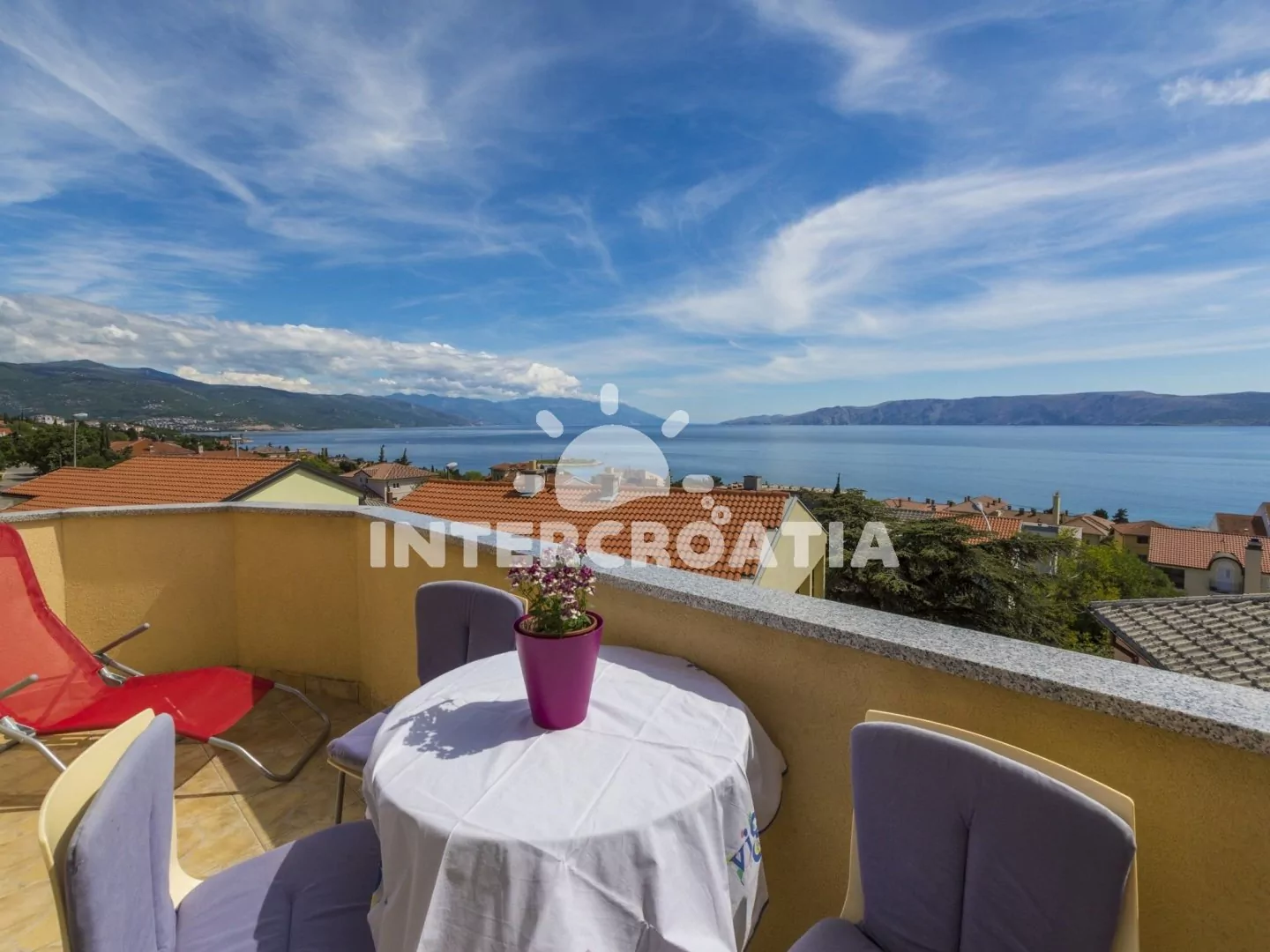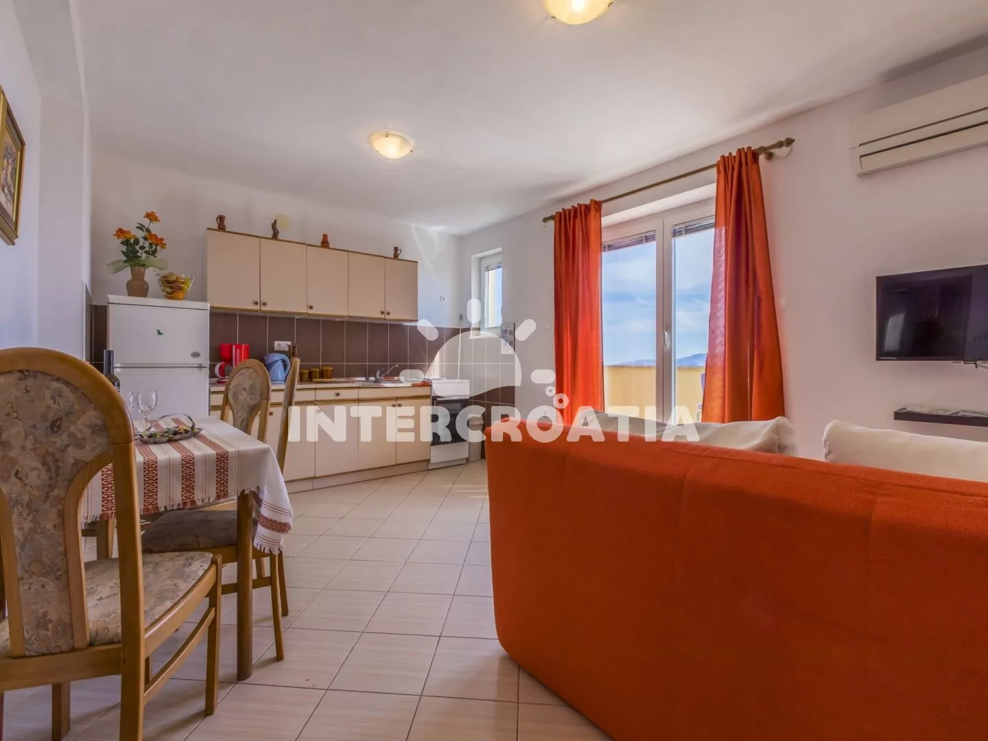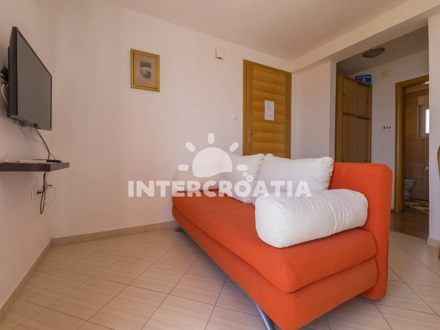 Apartmán s terasou a výhledem na moře se nachází v druhém patře domu a je vhodný pro 2 až 4 osoby. Obývací pokoj je spojený s kuchyní. Kuchyňská linka je vybavena sporákem, rychlovarnou konvicí, kávovarem, nádobím a lednicí s mrazákem. Obývací pokoj s jídelním stolem pro 4 osoby, pohovkou (rozložitelná na extra lůžko pro 2 osoby), televizí se satelitním programem, klimatizací a vstupem na terasu. Ložnice je vybavena dvoulůžkem. Koupelna se sprchovým koutem, umyvadlem a wc. Hostům je k dispozici parkování u objektu zdarma.