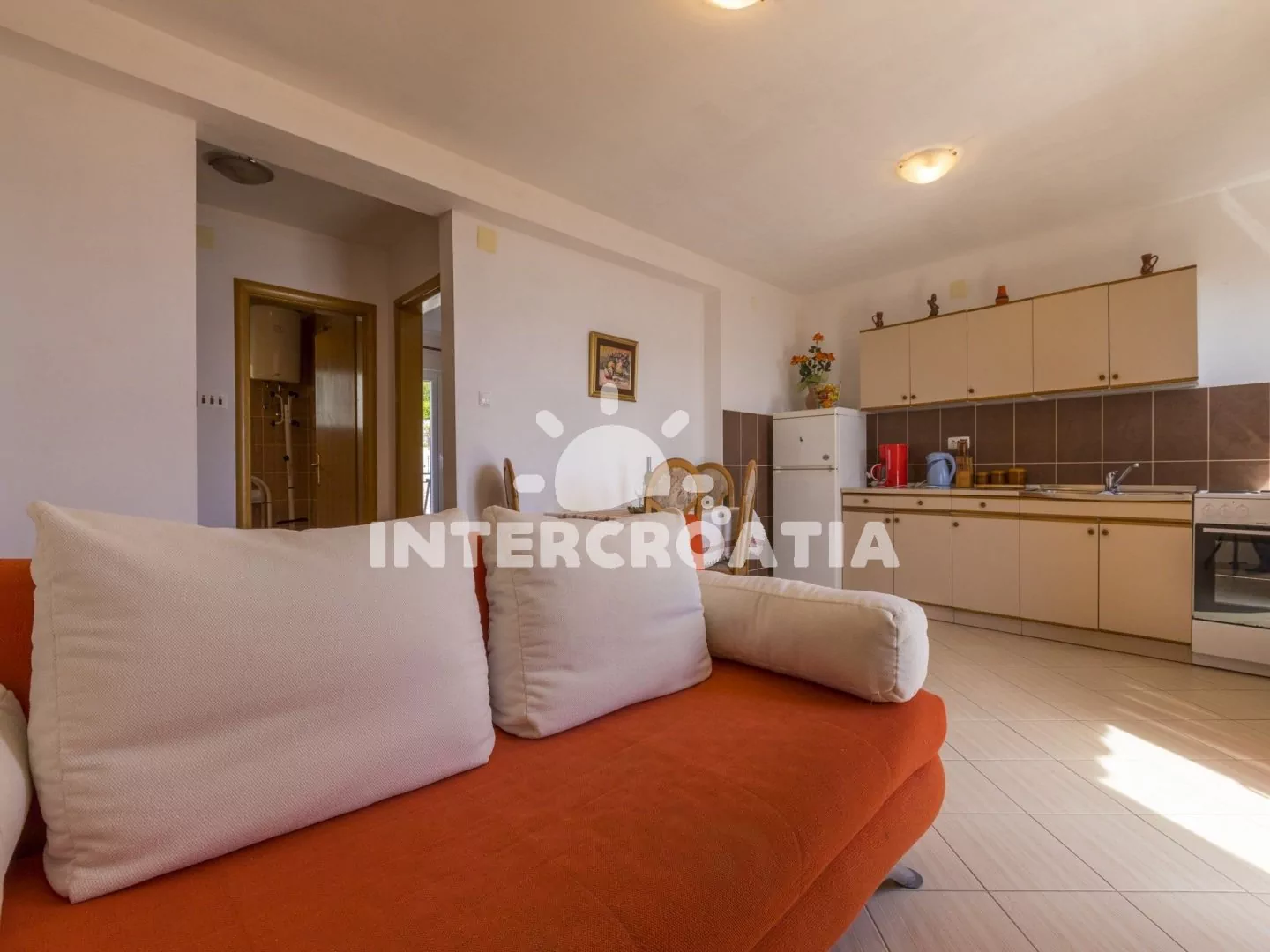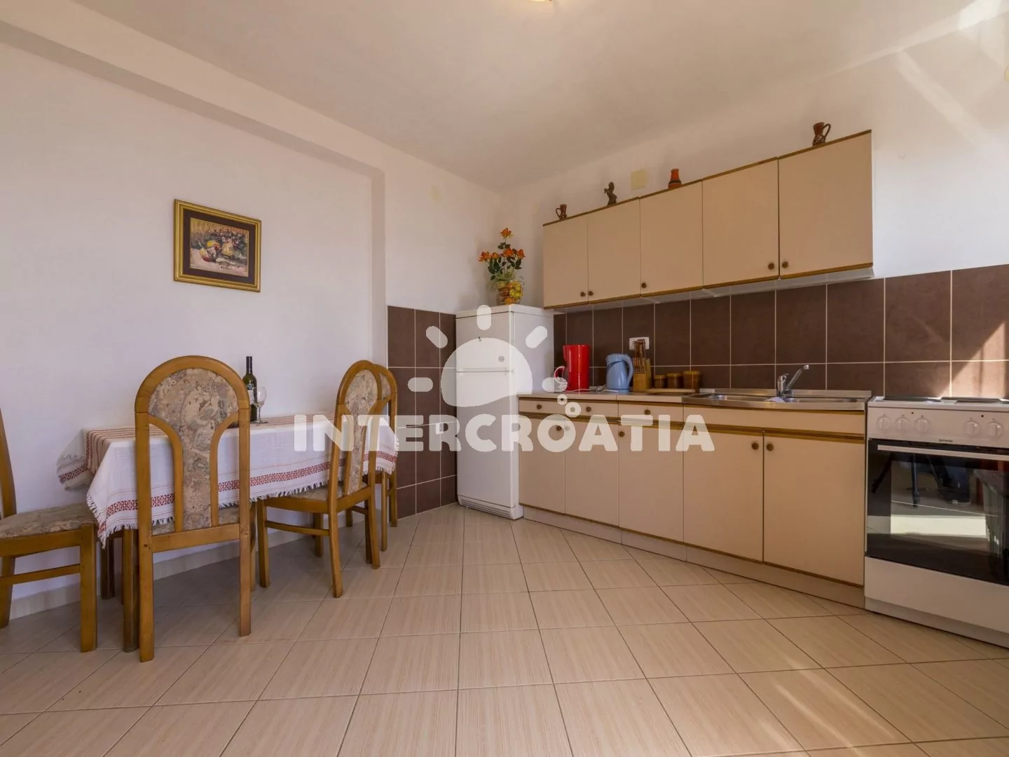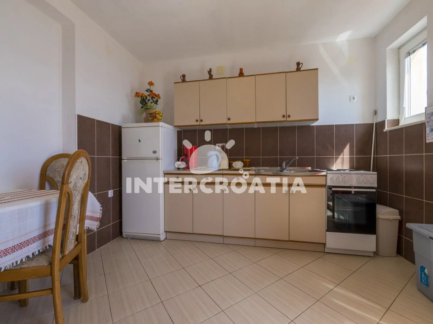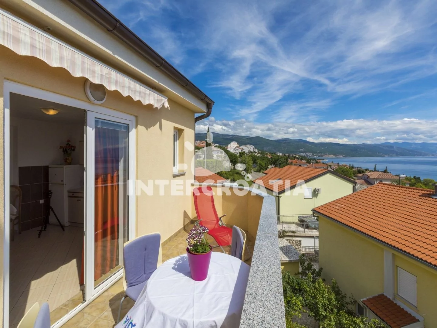 Apartmán s terasou a výhledem na moře se nachází v druhém patře domu a je vhodný pro 2 až 4 osoby. Obývací pokoj je spojený s kuchyní. Kuchyňská linka je vybavena sporákem, rychlovarnou konvicí,…