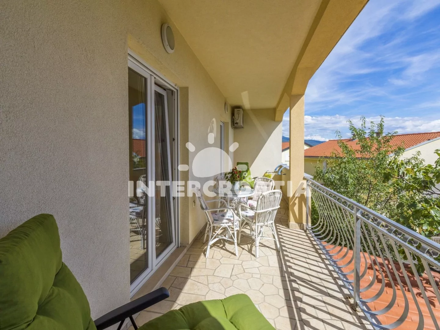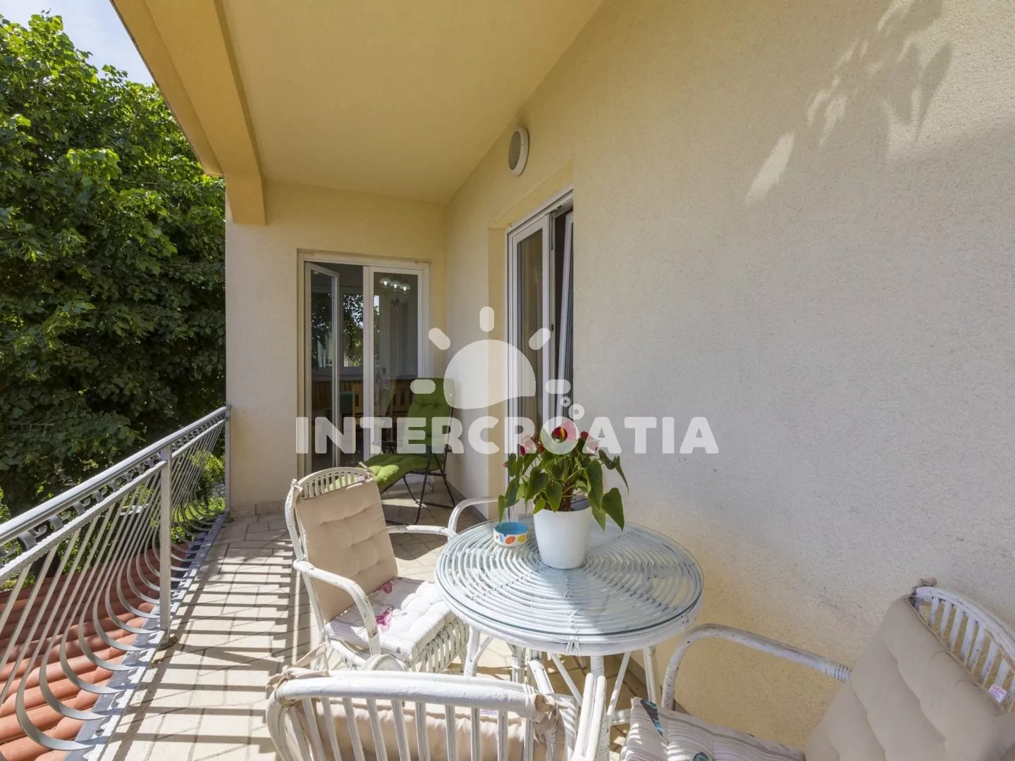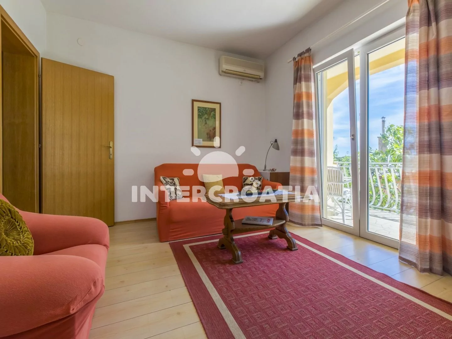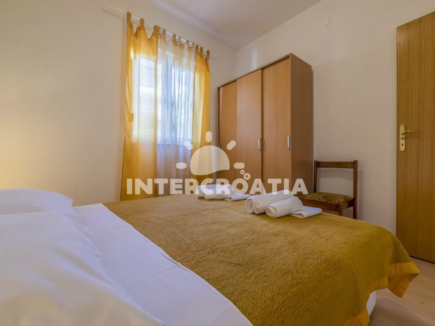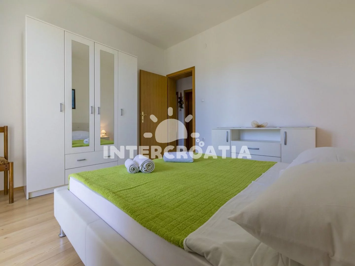 Apartmán (84 m2) ve zvýšeném přízemí s balkonem a částečným výhledem na moře je vhodný pro 4 - 6 osob. Obývací pokoj je spojený s kuchyní. Kuchyňská linka je vybavena sporákem, troubou, rychlovarnou konvicí, kávovarem, nádobím a lednicí s mrazákem. Obývací pokoj s jídelním stolem pro 6 osob, sedací soupravou, pohovkou (rozložitelná na extra lůžko pro 2 osoby), televizí se satelitním programem, klimatizací a vstupem na balkon. První ložnice je vybavena dvoulůžkem a vstupem na balkon. Druhá ložnice s dvoulůžkem. Koupelna se sprchovým koutem, umyvadlem, wc a pračkou. Hostům je k dispozici parkování u objektu zdarma.