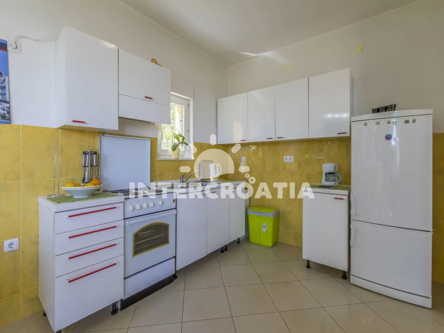 Apartmán (84 m2) ve zvýšeném přízemí s balkonem a částečným výhledem na moře je vhodný pro 4 - 6 osob. Obývací pokoj je spojený s kuchyní. Kuchyňská linka je vybavena sporákem, troubou, rychlovarnou… Více informací