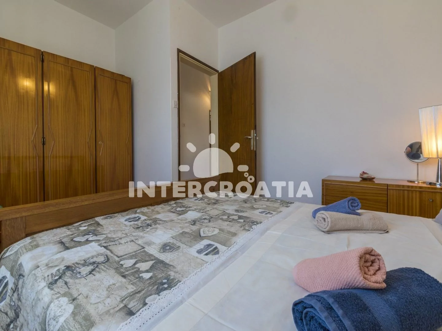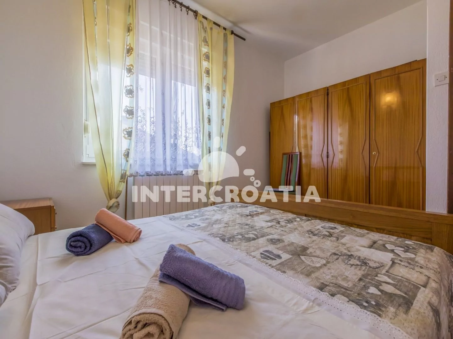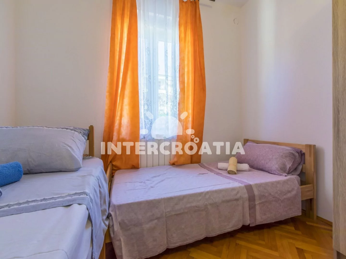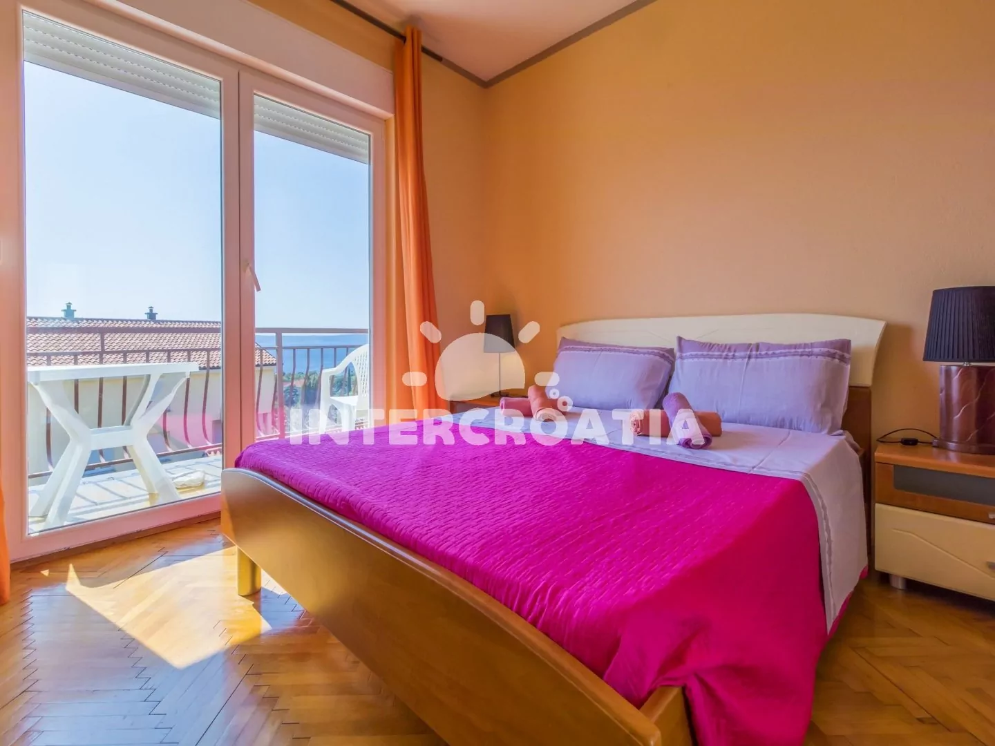 Apartmán (100 m2) v druhém patře domu s balkonem a výhledem na moře je vhodný pro 4 - 6 osob. Obývací pokoj je spojený s kuchyní. Kuchyňská linka je vybavena varnou deskou, digestoří, troubou, rychlovarnou konvicí, kávovarem, nádobím a lednicí s mrazákem. Obývací pokoj s jídelním stolem pro 4 osoby, sedací soupravou, pohovkou, televizí se satelitním programem, klimatizací a vstupem na balkon. První ložnice s dvoulůžkem a vstupem na balkon. Druhá ložnice s dvoulůžkem. Třetí ložnice s dvěma jednolůžky. První i druhá koupelna je vybavena sprchovým koutem, umyvadlem a wc. Hostům je k dispozici parkování u objektu zdarma.