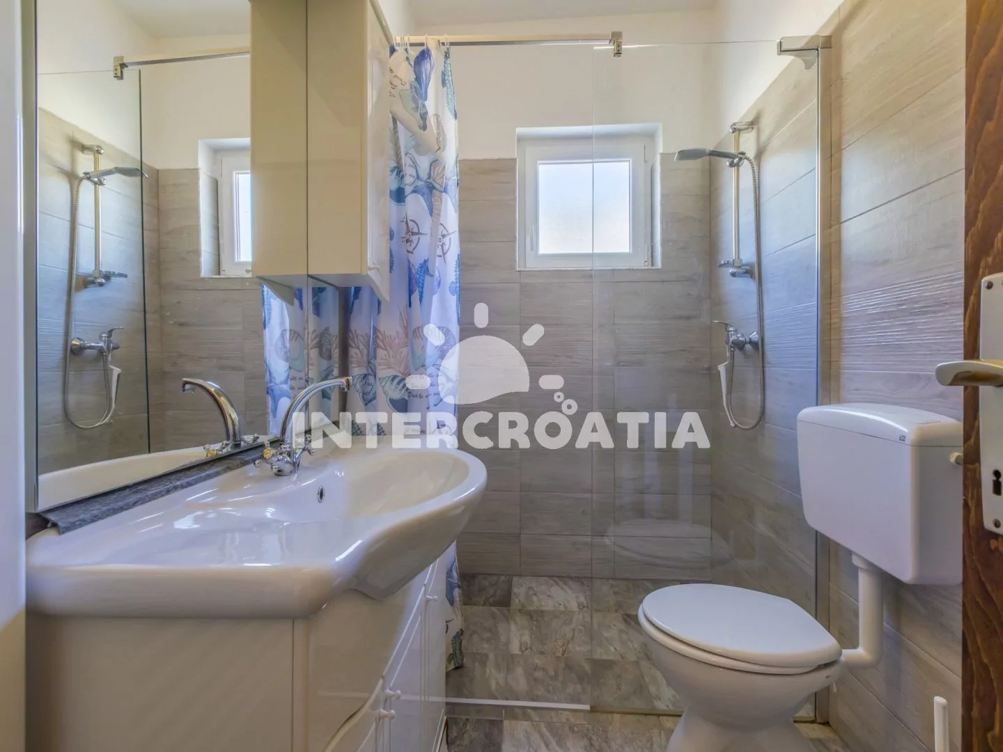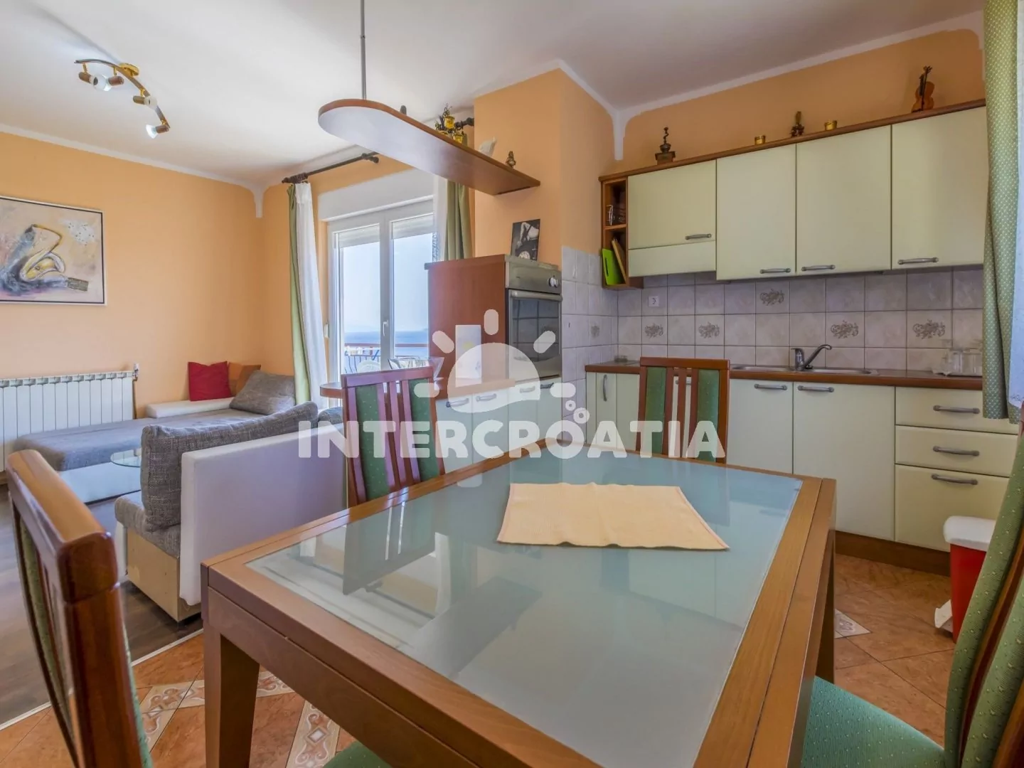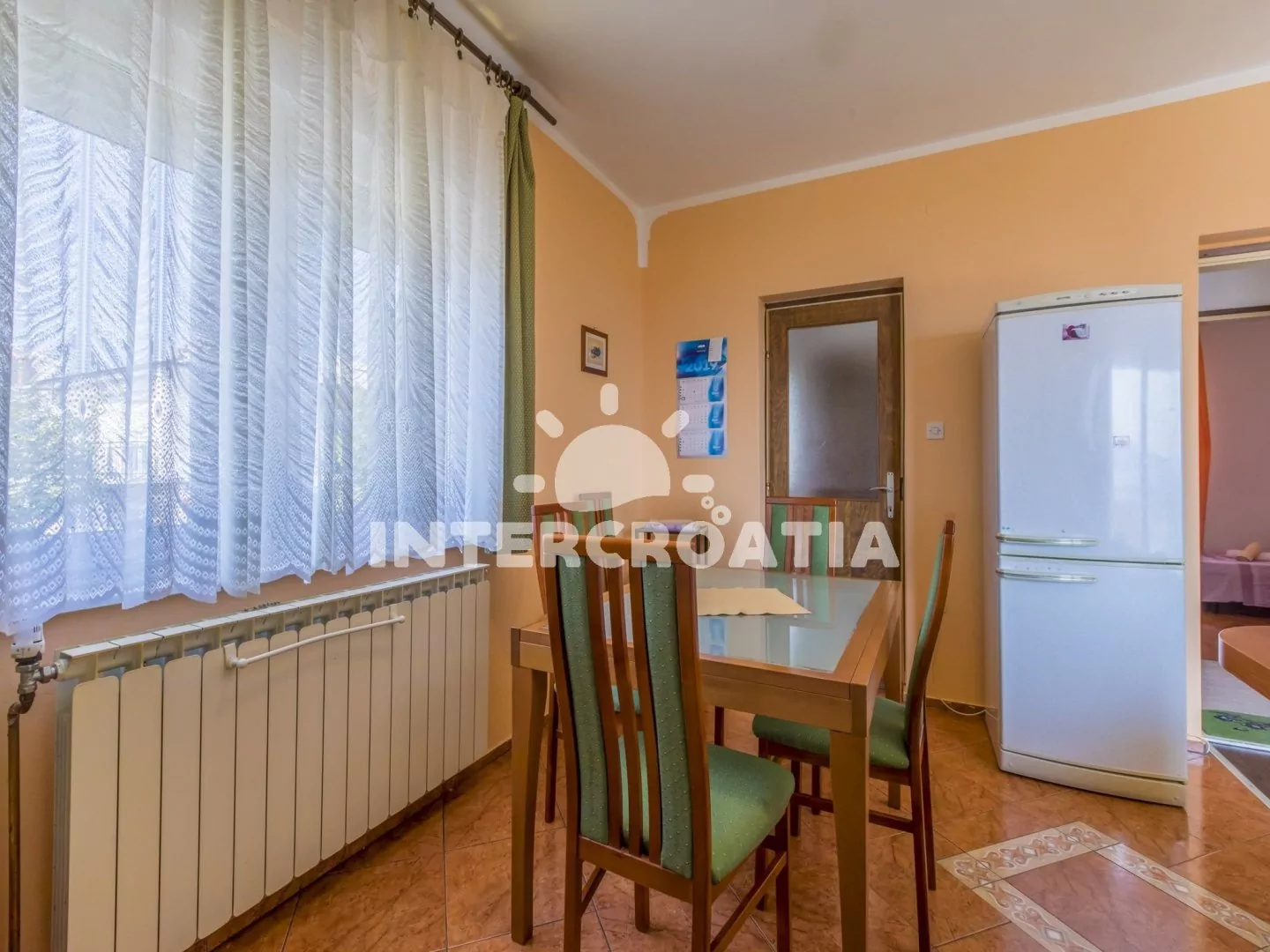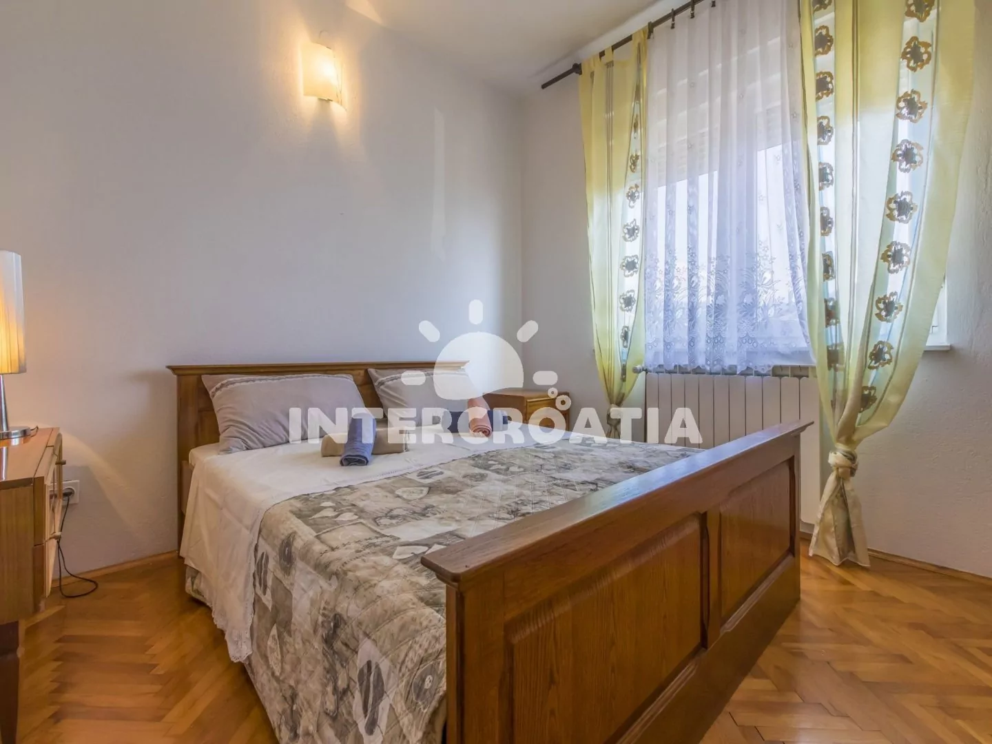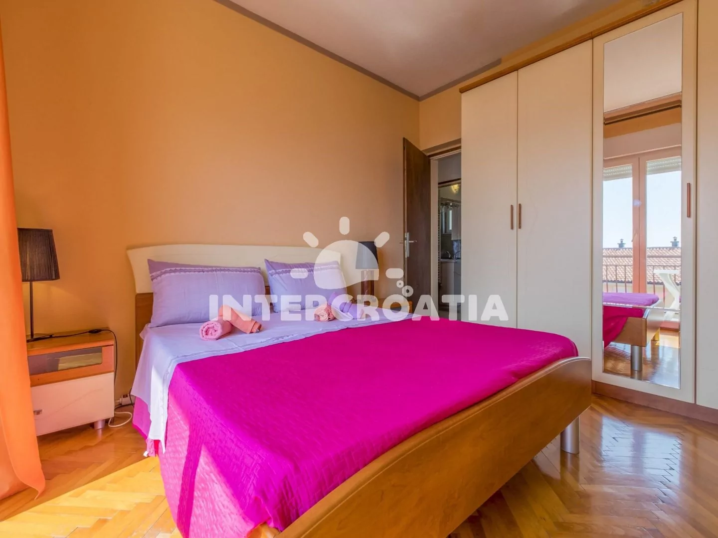 Apartmán (100 m2) v druhém patře domu s balkonem a výhledem na moře je vhodný pro 4 - 6 osob. Obývací pokoj je spojený s kuchyní. Kuchyňská linka je vybavena varnou deskou, digestoří, troubou, rychlovarnou konvicí, kávovarem, nádobím a lednicí s mrazákem. Obývací pokoj s jídelním stolem pro 4 osoby, sedací soupravou, pohovkou, televizí se satelitním programem, klimatizací a vstupem na balkon. První ložnice s dvoulůžkem a vstupem na balkon. Druhá ložnice s dvoulůžkem. Třetí ložnice s dvěma jednolůžky. První i druhá koupelna je vybavena sprchovým koutem, umyvadlem a wc. Hostům je k dispozici parkování u objektu zdarma.