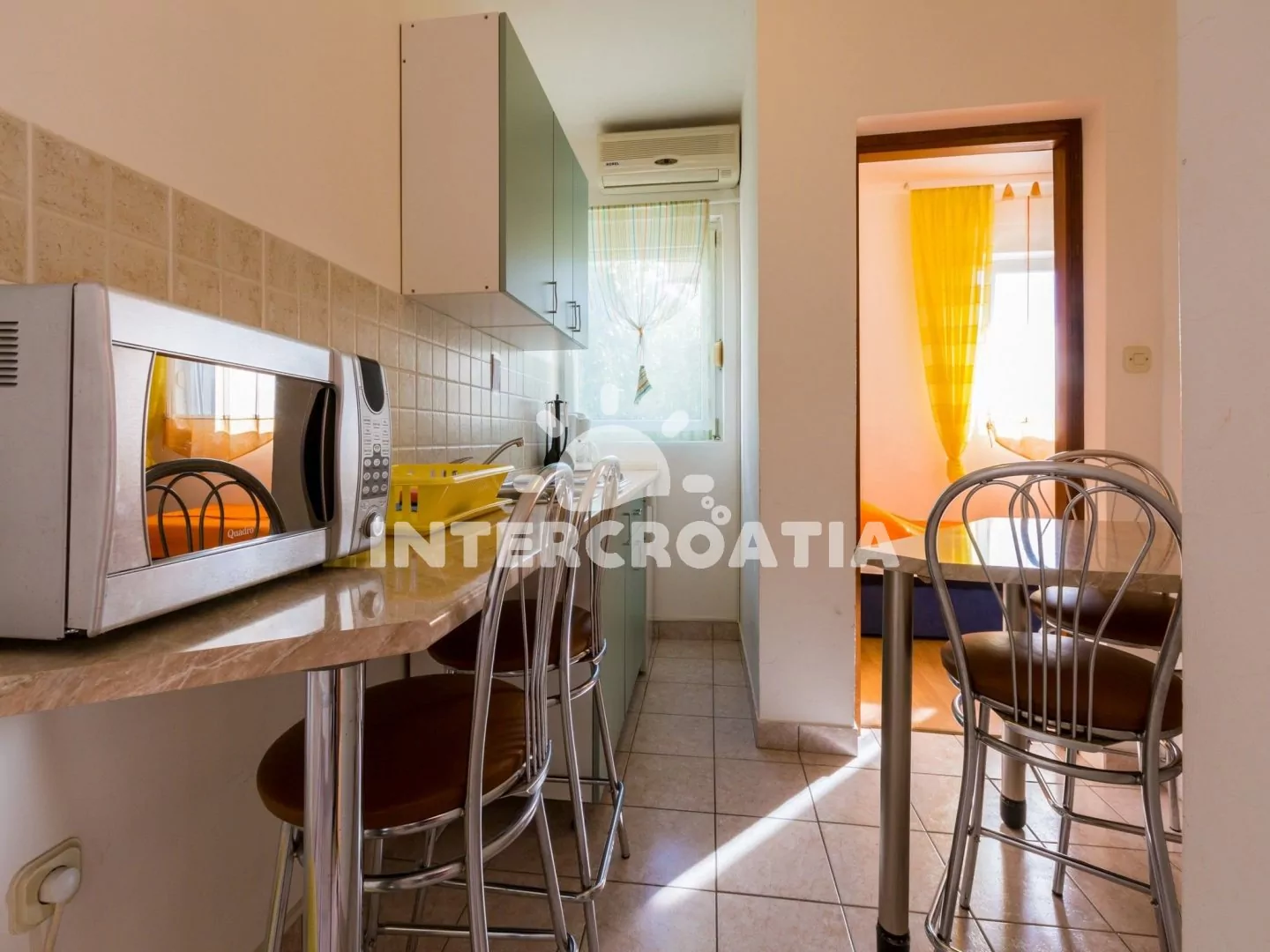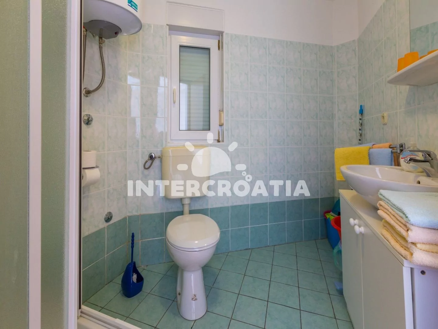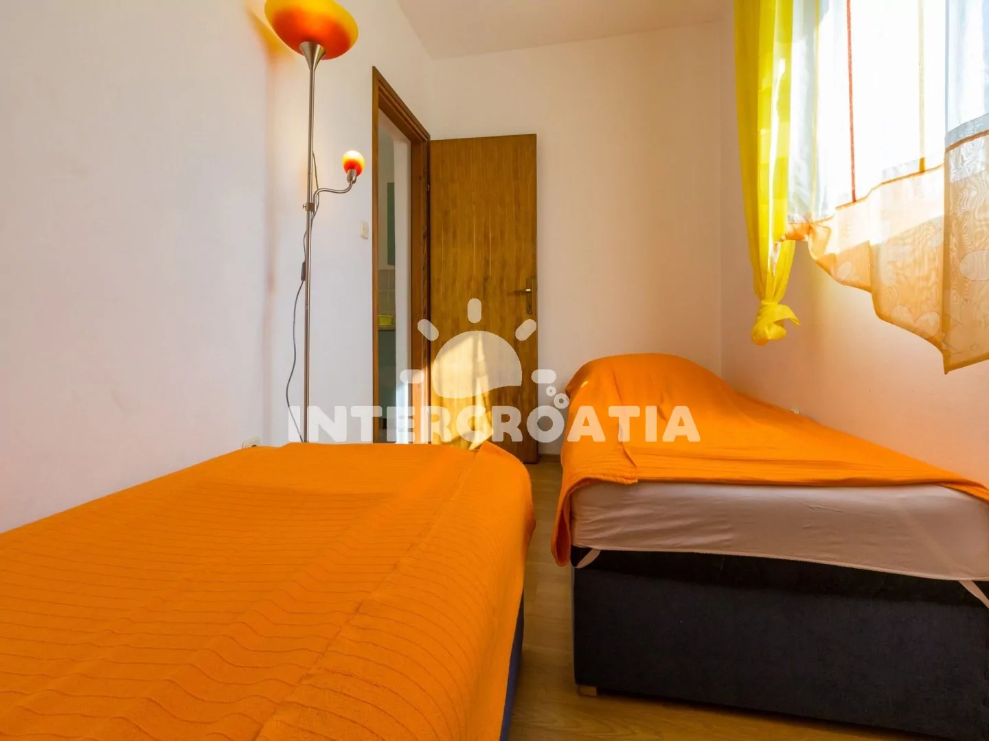 Apartmán s výhledem na moře a sdílenou terasou se nachází v přízemí domu. Kuchyňský kout je vybavený dvouplotýnkovým vařičem, mikrovlnnou troubou, rychlovarnou konvicí, kávovarem, nádobím a lednicí s mrazákem. Dále jídelní stůl a klimatizace. Ložnice s dvoulůžkem a vstupem na terasu. Druhá ložnice s dvěma jednolůžky. Koupelna se sprchovým koutem, umyvadlem a wc. Parkovací místa 150 - 300 m od domu.