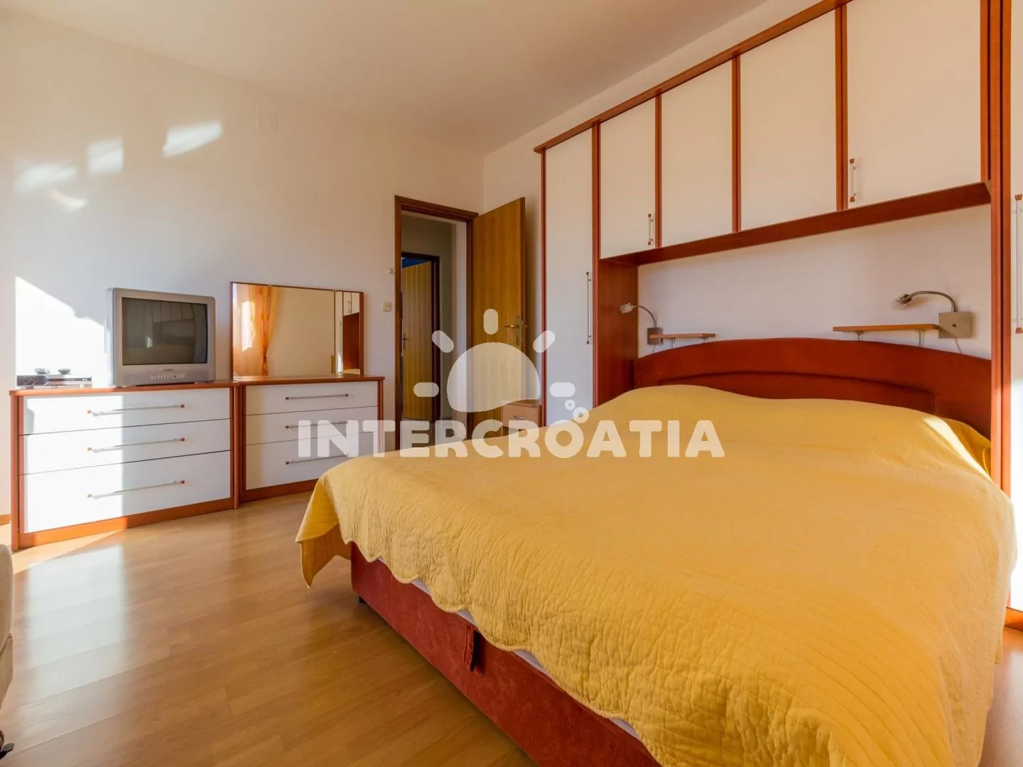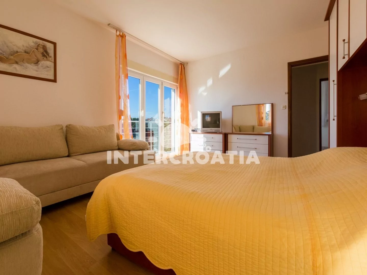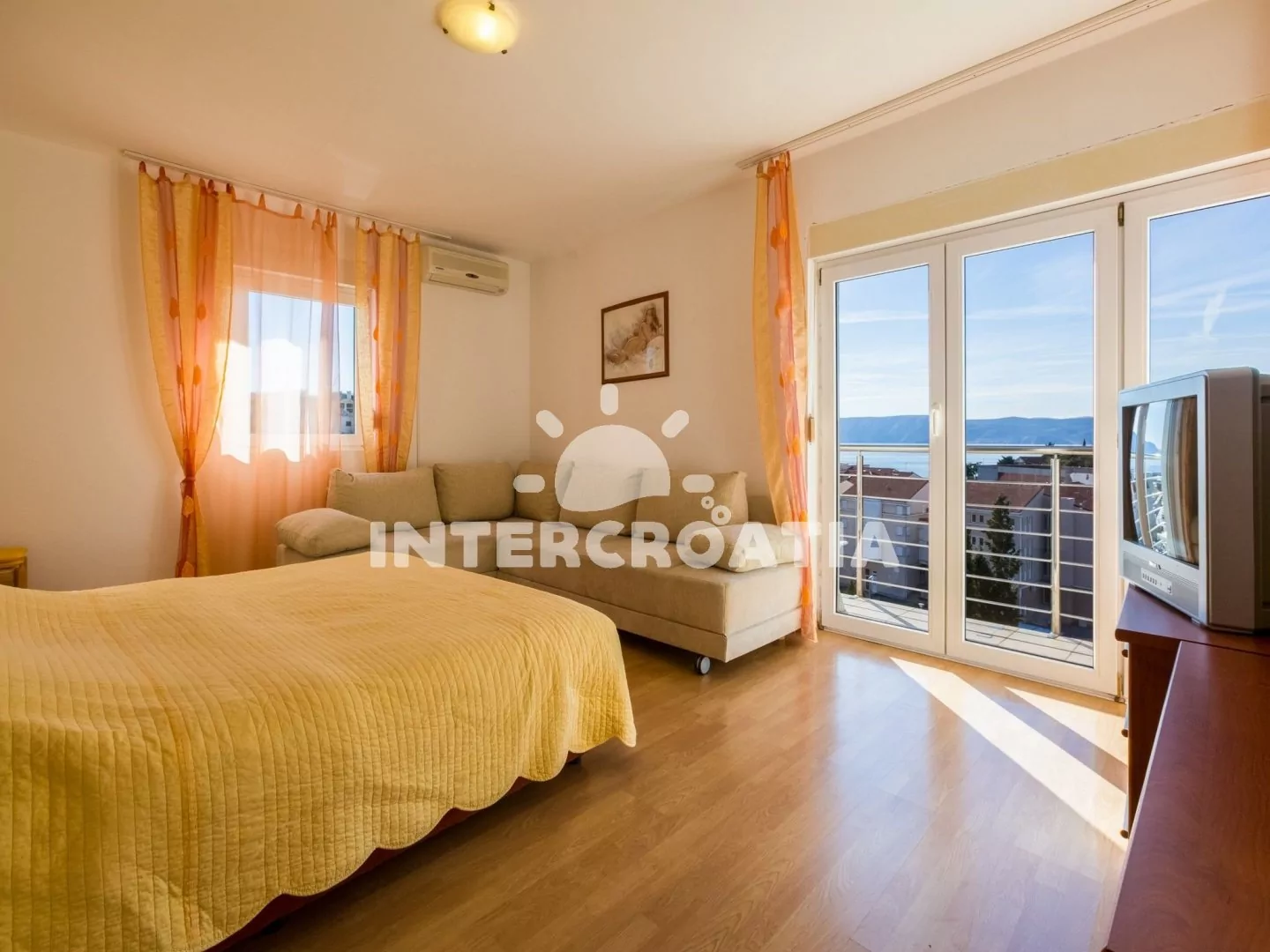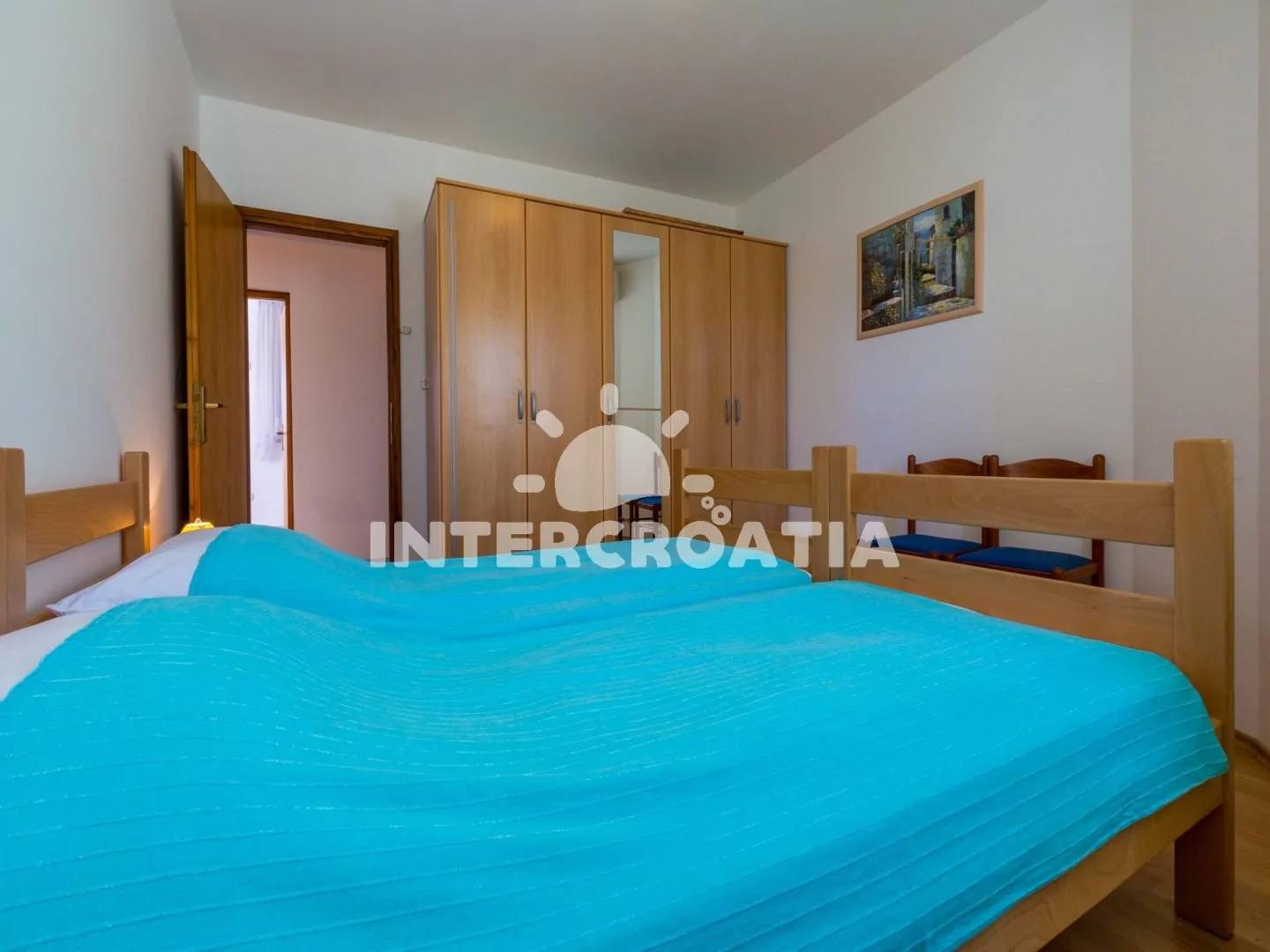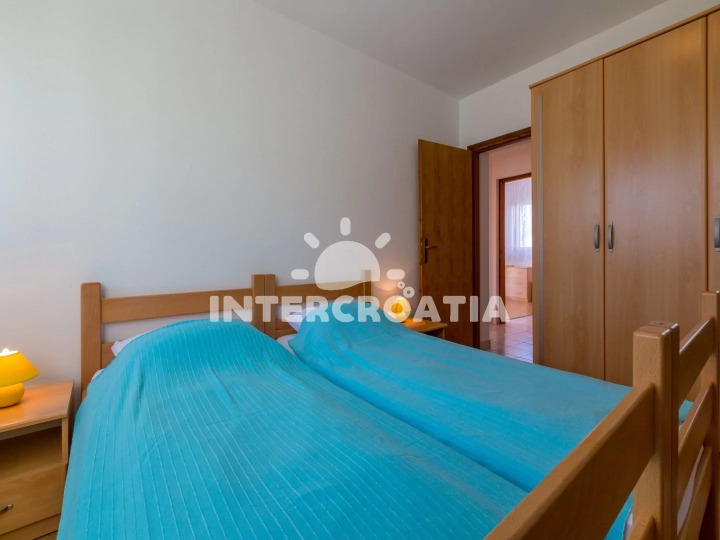 Apartmán (61 m2) s výhledem na moře a sdílenou lodžií se nachází v 1. patře domu. Kuchyňská linka je vybavena varnou deskou, digestoří, troubou, rychlovarnou konvicí, kávovarem, nádobím a lednicí s mrazákem. Dále jídelní stůl pro 6 osob, klimatizace a vstup na balkon. První ložnice s dvoulůžkem, pohovkou, televizí se satelitním programem, klimatizací a vstupem na balkon. Druhá ložnice s dvěma jednolůžky a klimatizací. Koupelna se sprchovým koutem, umyvadlem, bidetem a wc. Parkovací místa 150 - 300 m od domu.