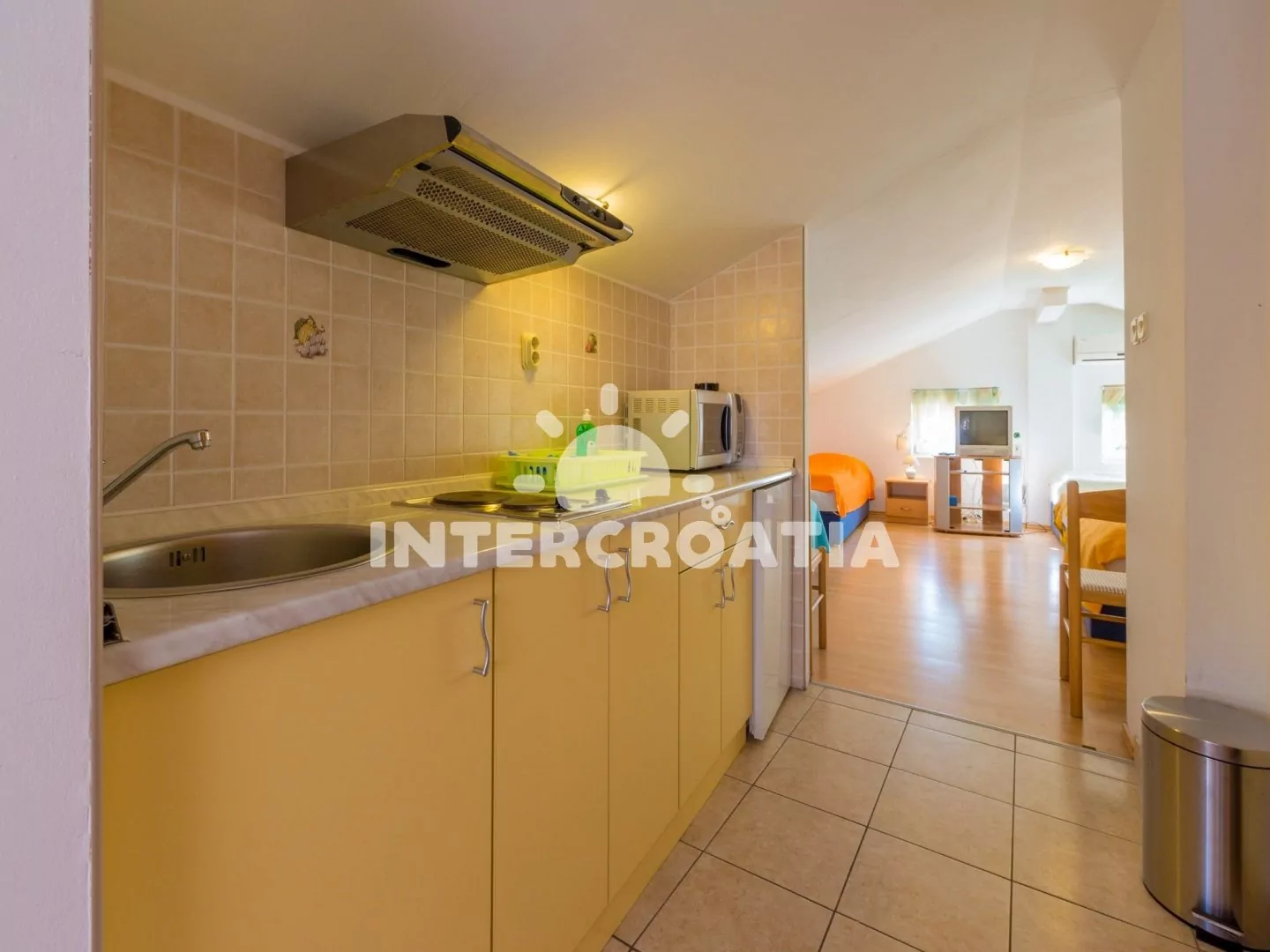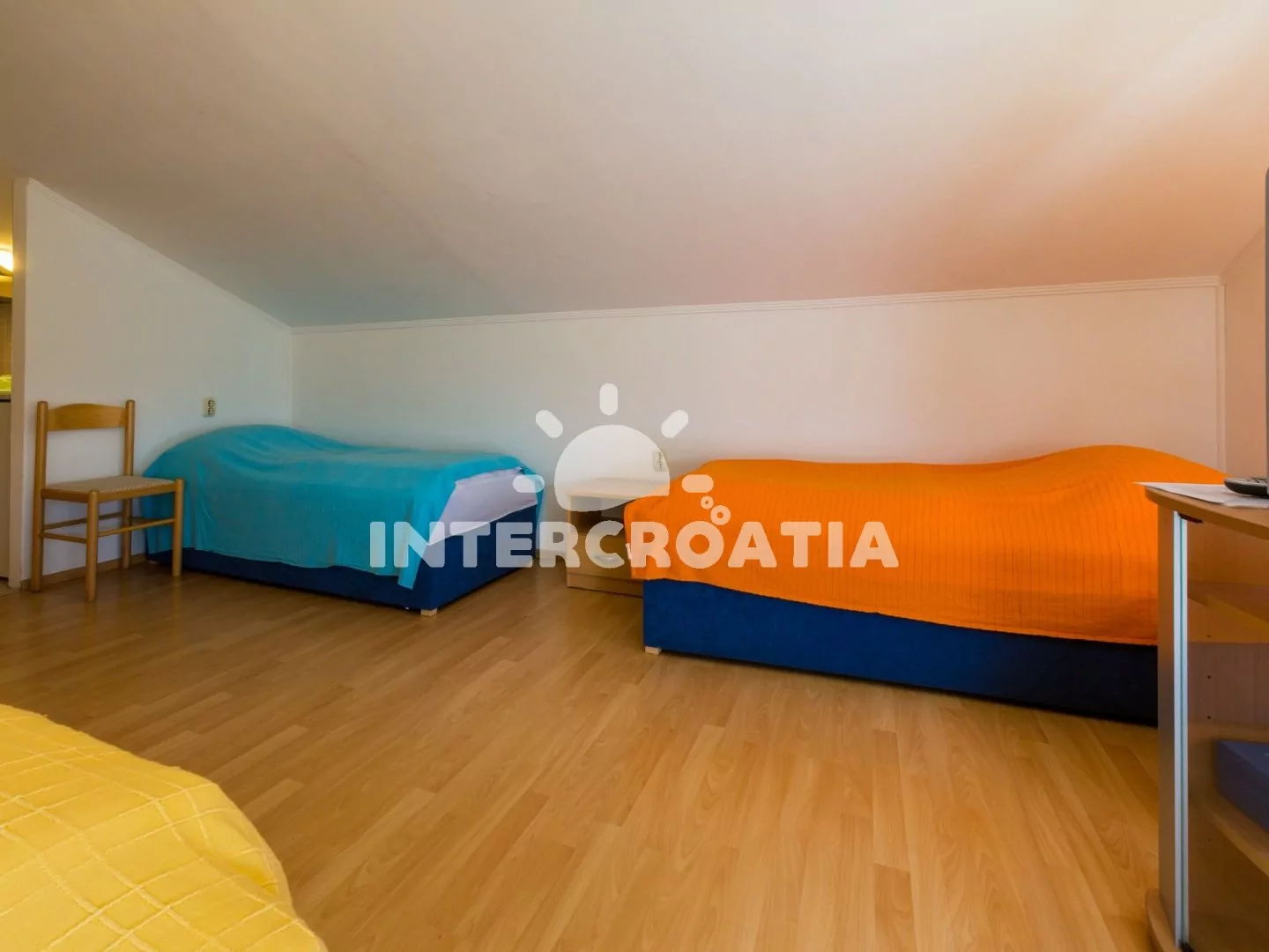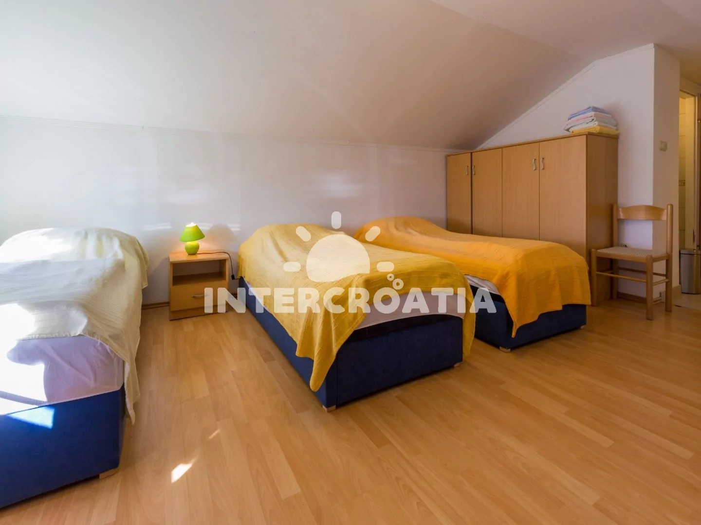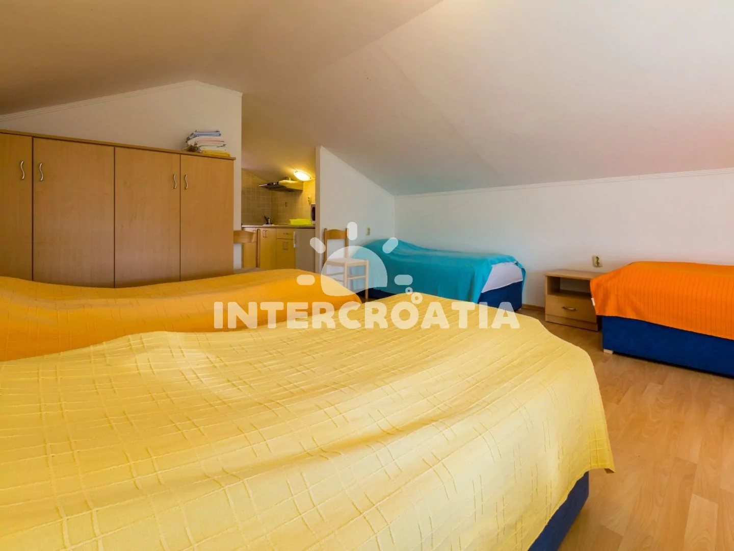 Podkrovní apartmán pro 4 osoby. Obývací místnost je spojena s kuchyní. Kuchyňská linka je vybavena dvouplotýnkovým vařičem, digestoří, mikrovlnnou troubou, rychlovarnou konvicí, kávovarem, nádobím a lednicí s mrazákem. Obývací místnost s jídelním stolem pro 4 osoby, televizí se satelitním programem, klimatizací a 4 jednolůžky. Koupelna se sprchovým koutem, umyvadlem a wc. Dále samostatné wc s umyvadlem. Parkovací místa 150 - 300 m od domu.