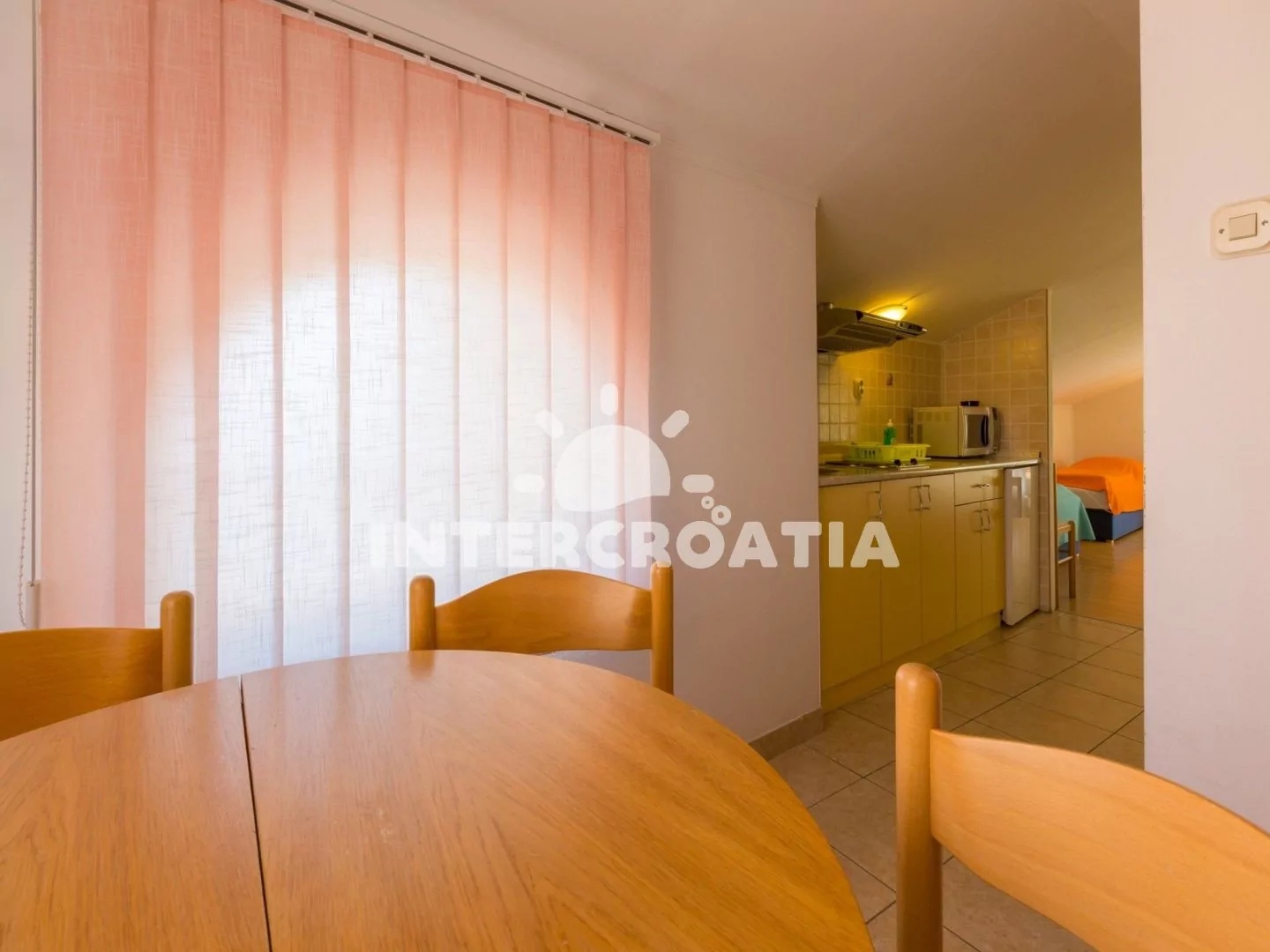 Samostatně stojící apartmánový dům v klidnější lokalitě města Novi Vinodolski. Oblázková pláž se nachází 1,2 km od domu.