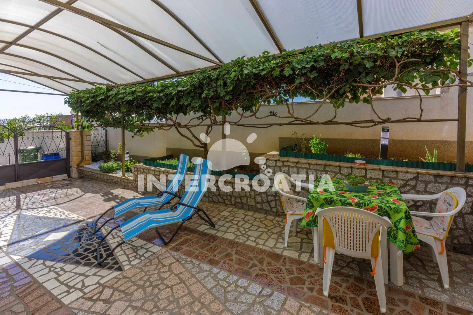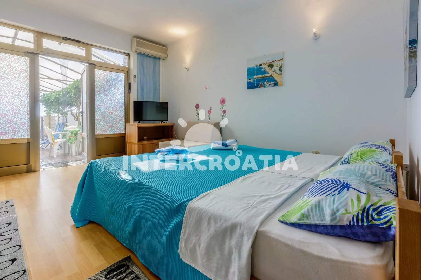 Apartmán s terasou se nachází v přízemí domu a je vhodný pro 2 až 3 osoby. Kuchyňka se sporákem, troubou, rychlovarnou konvicí, kávovarem, nádobím, pračkou a lednicí s mrazákem. Obývací místnost s jídelním stolem, televizí se satelitním programem, dvoulůžkem, jedním jednolůžkem, klimatizací a vstupem na terasu. Koupelna se sprchovým koutem, umyvadlem a wc. Hostům je k dispozici parkování u objektu zdarma.