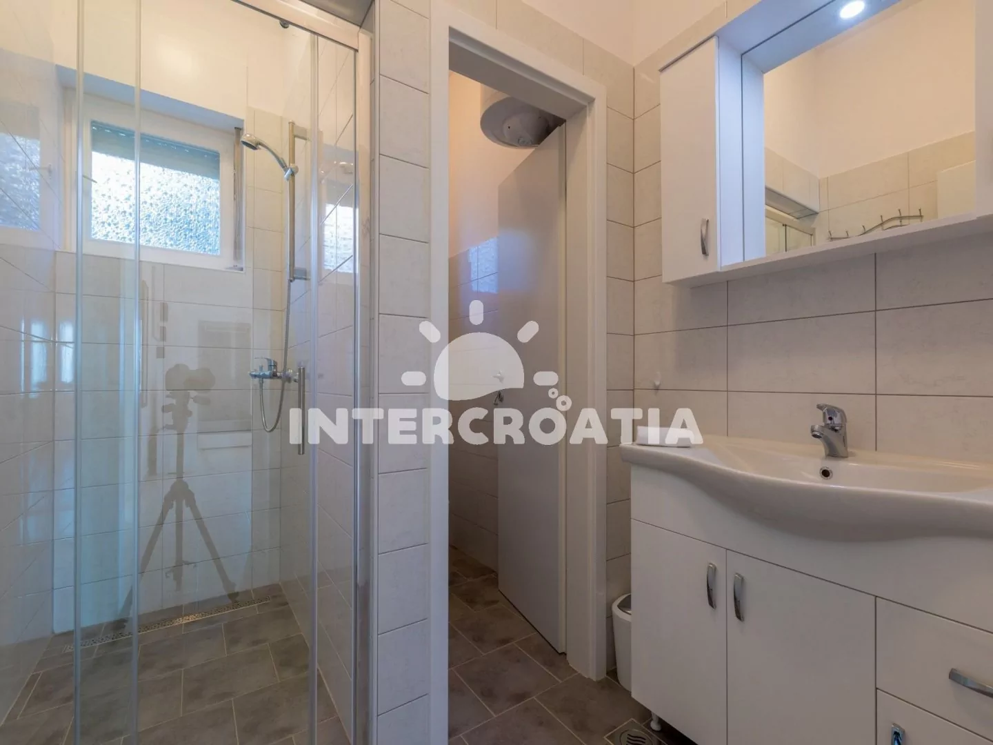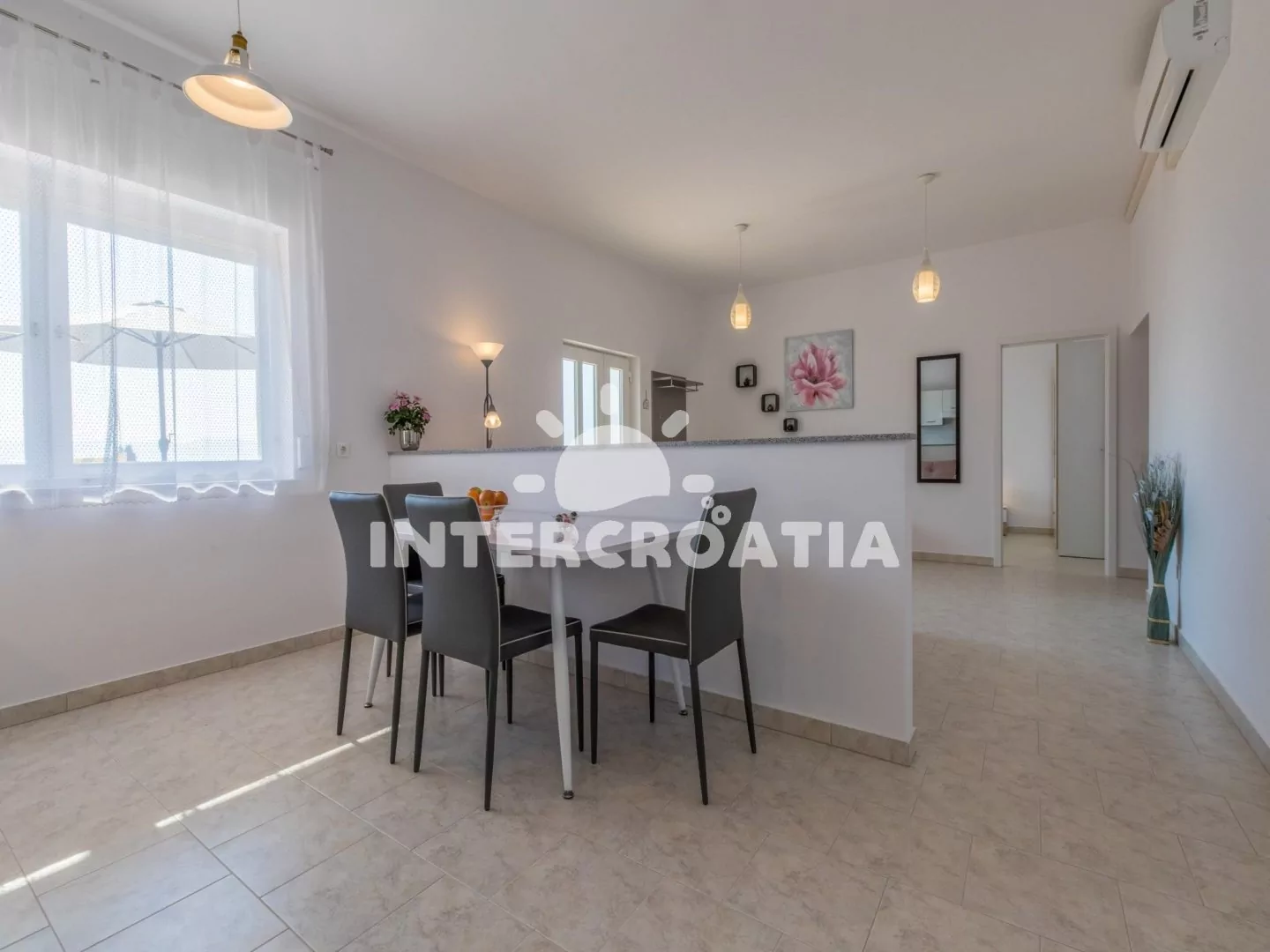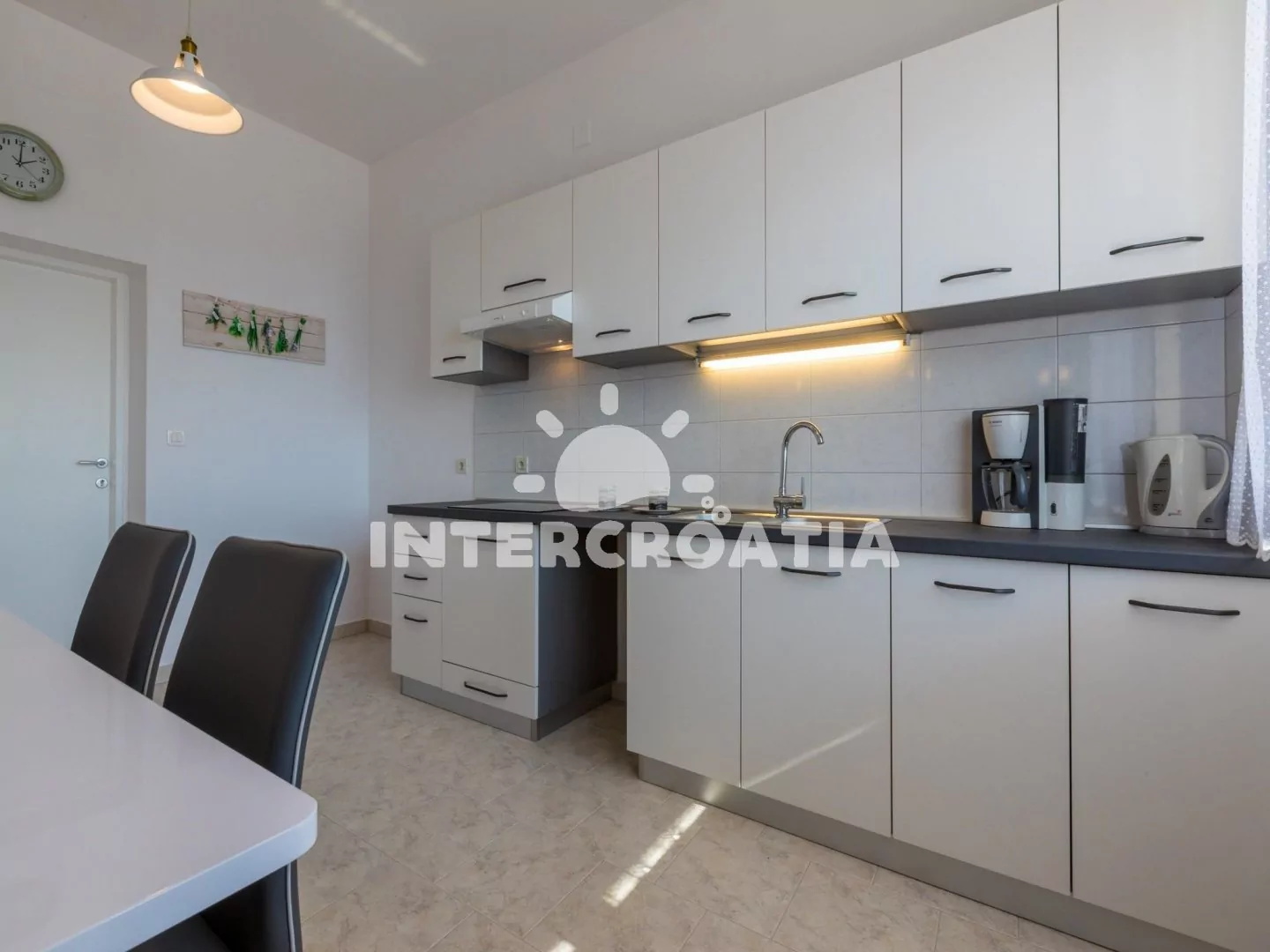 Apartmán (70 m2) s terasou a výhledem na moře se nachází v přízemí domu. Obývací pokoj je spojený s kuchyní. Kuchyňská linka se sklokeramickou varnou deskou, digestoří, mikrovlnnou troubou,…