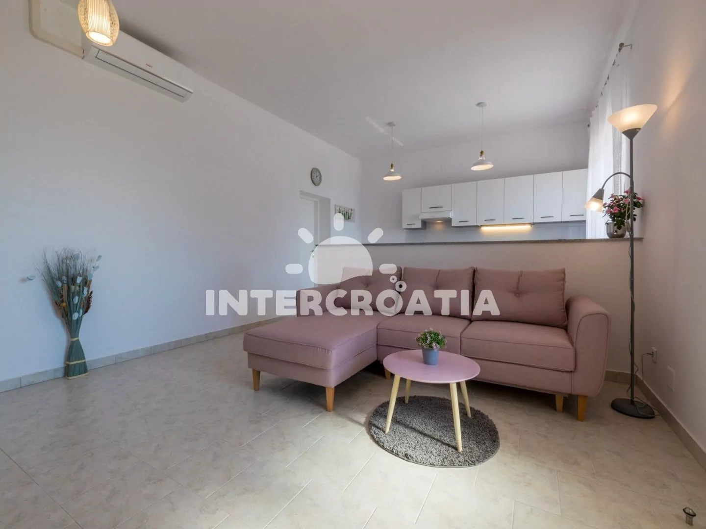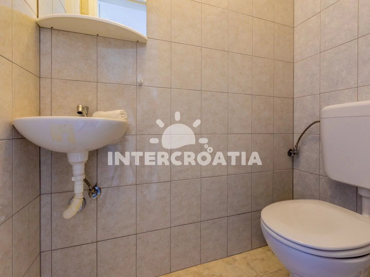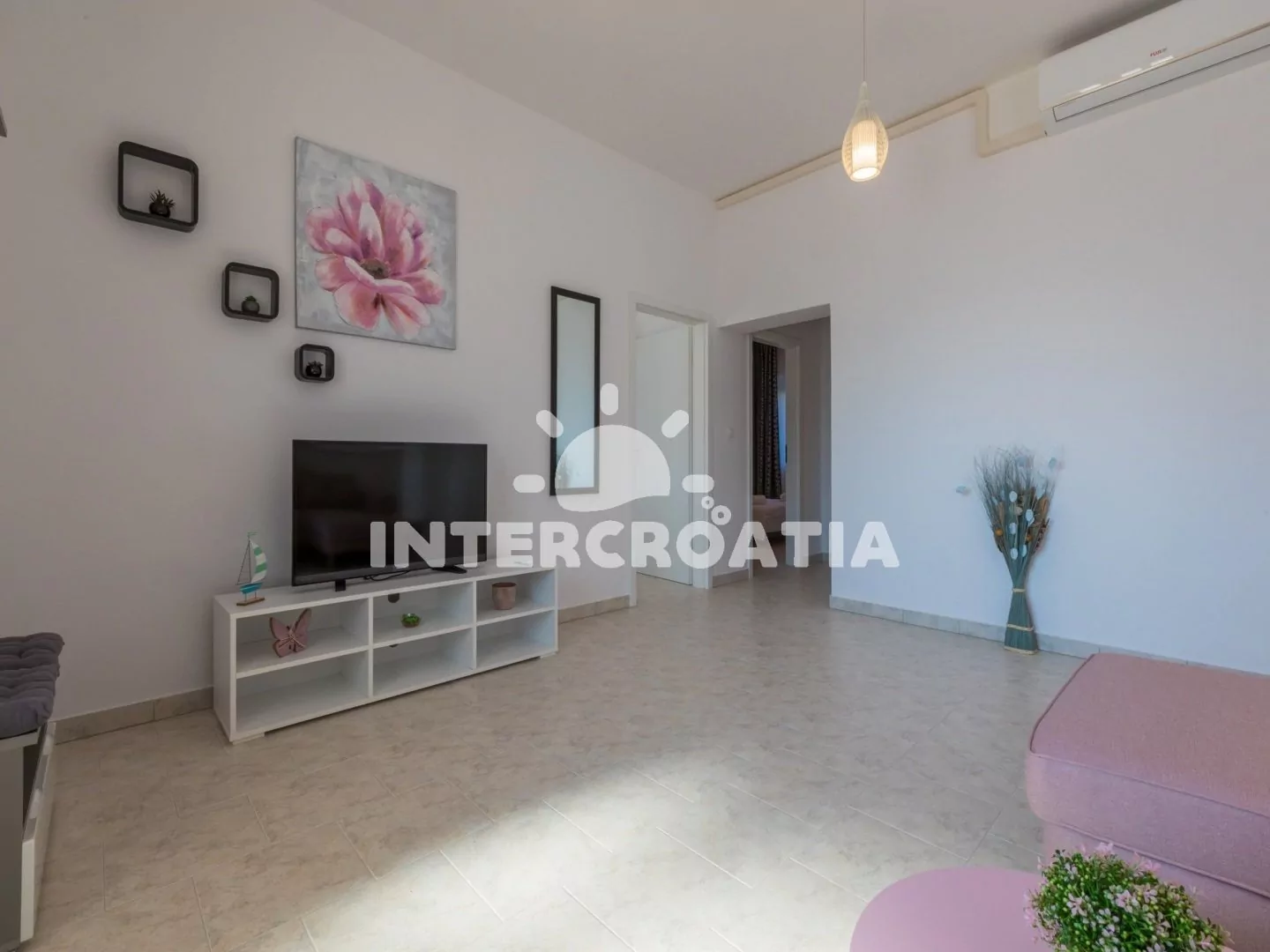 Apartmán (70 m2) s terasou a výhledem na moře se nachází v přízemí domu. Obývací pokoj je spojený s kuchyní. Kuchyňská linka se sklokeramickou varnou deskou, digestoří, mikrovlnnou troubou,…