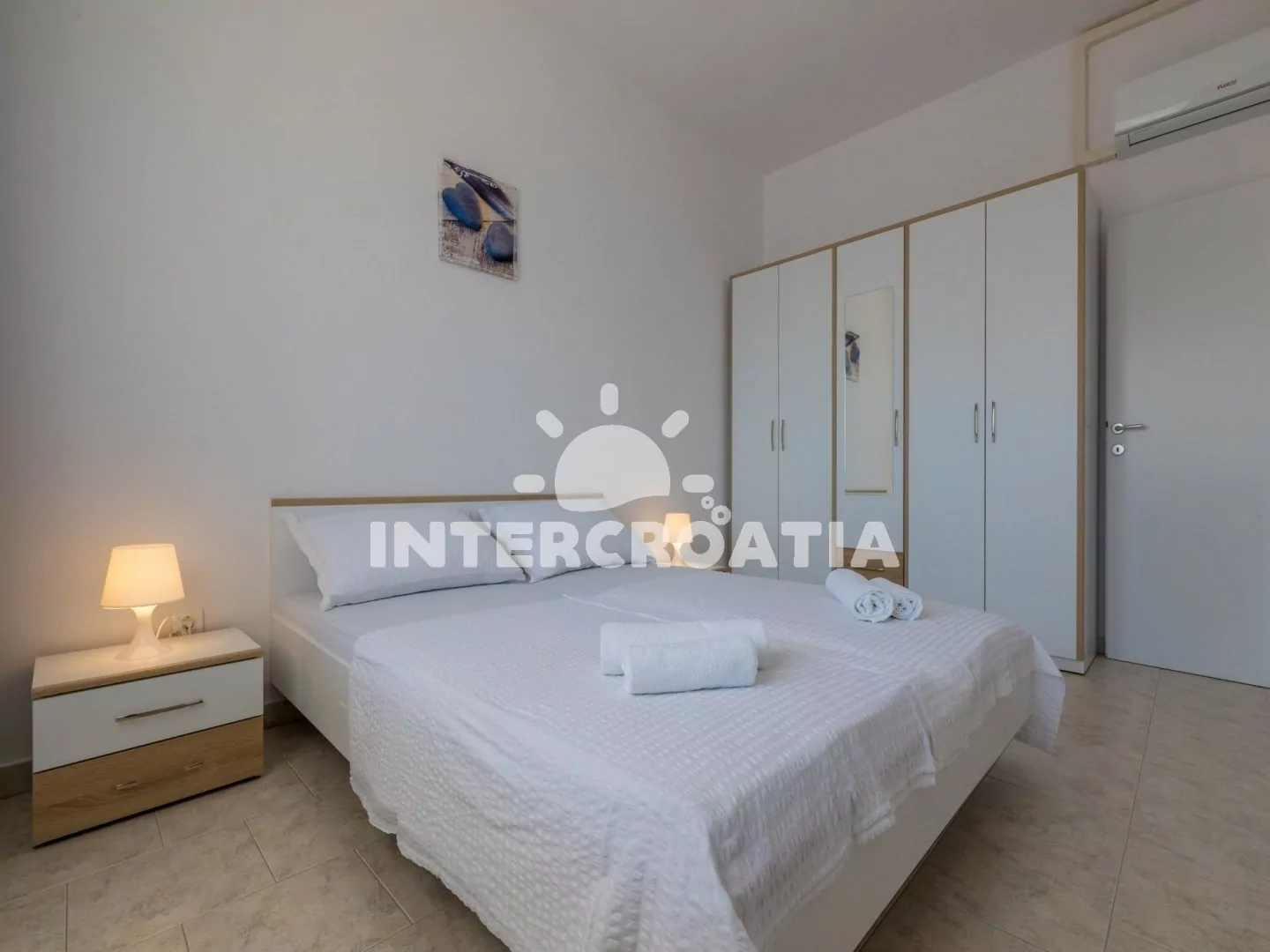 Apartmán (70 m2) s terasou a výhledem na moře se nachází v přízemí domu. Obývací pokoj je spojený s kuchyní. Kuchyňská linka se sklokeramickou varnou deskou, digestoří, mikrovlnnou troubou, rychlovarnou konvicí, kávovarem, nádobím a lednicí s mrazákem. Obývací pokoj s jídelním stolem pro 4 osoby, pohovkou, televizí se satelitním programem a klimatizací. První i druhá ložnice je vybavena vždy s jedním dvoulůžkem a klimatizací. Koupelna se sprchovým koutem a umyvadlem. Dále samostatná wc. Hostům je k dispozici parkování u objektu zdarma.