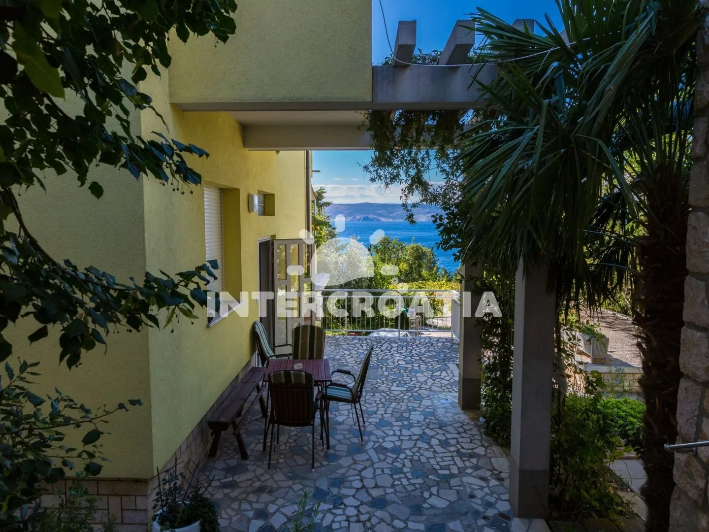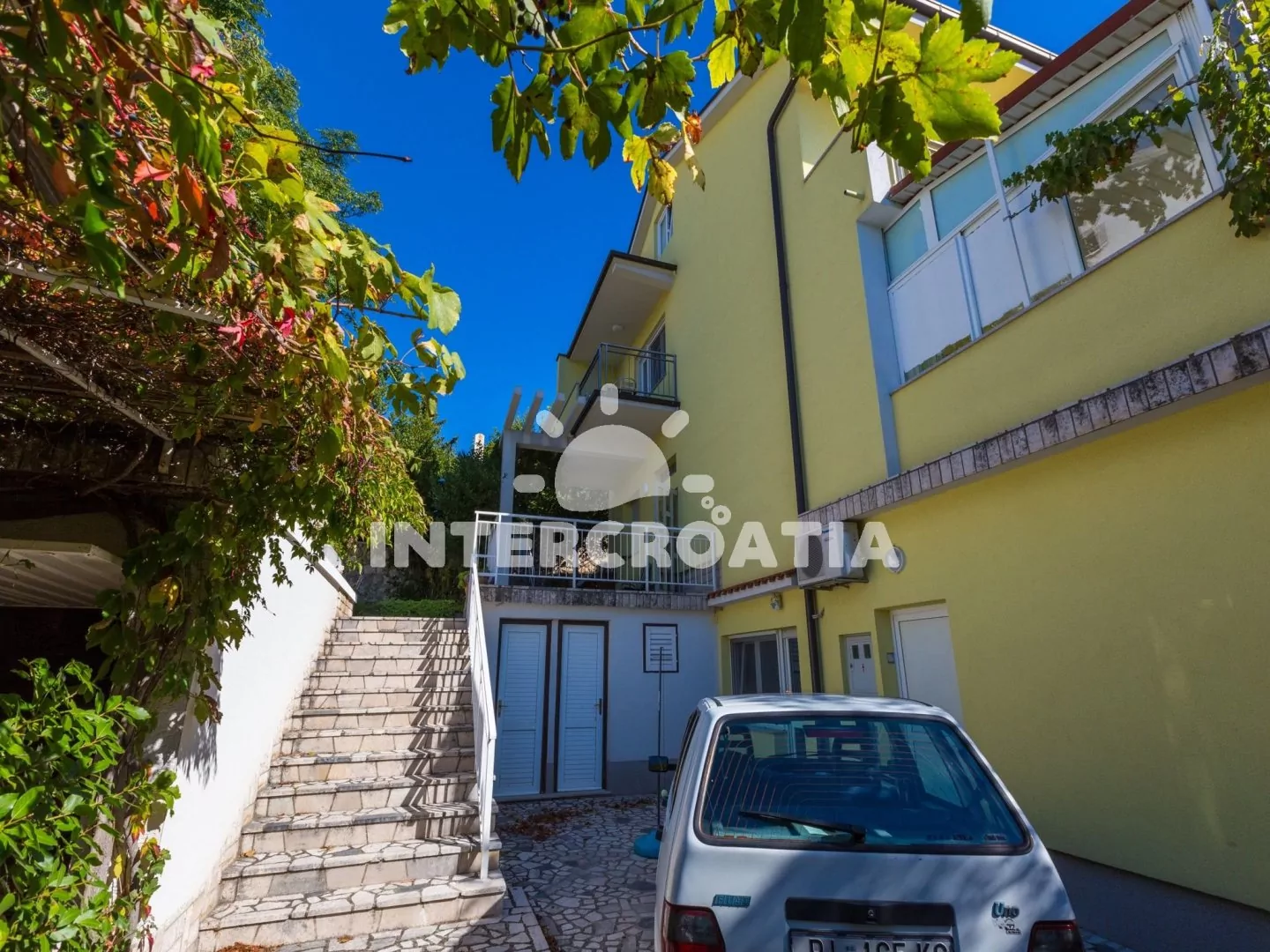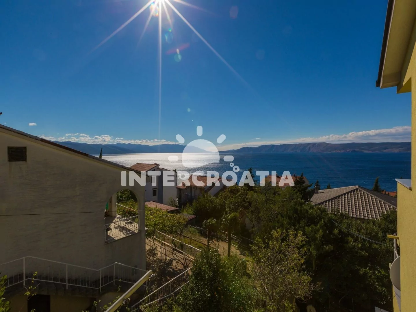 Dobře situovaný apartmánový dům s výhledem na moře. U domu společná terasa s venkovním posezením, zděným grilem a pozemkem s parkovacími místy.