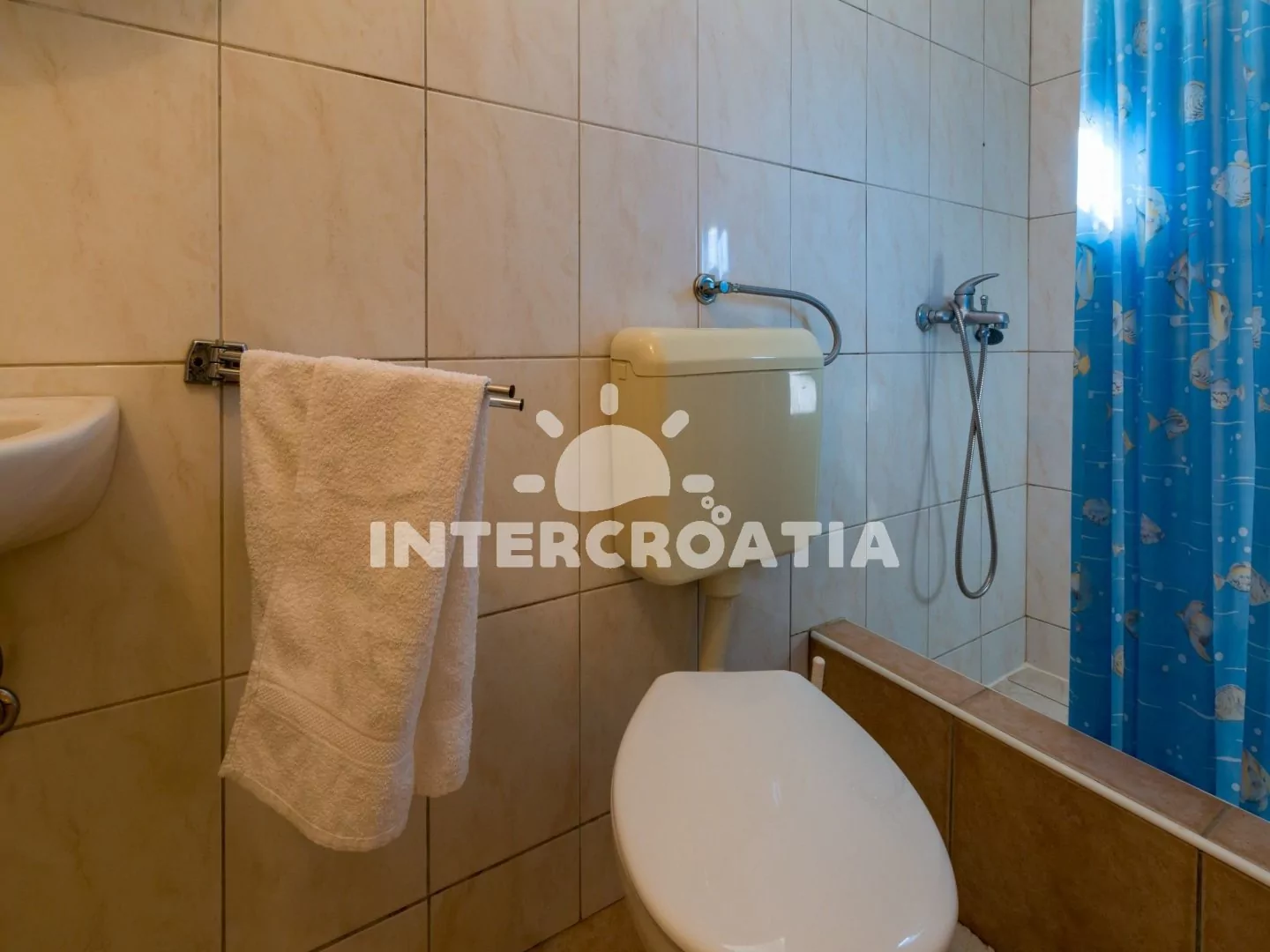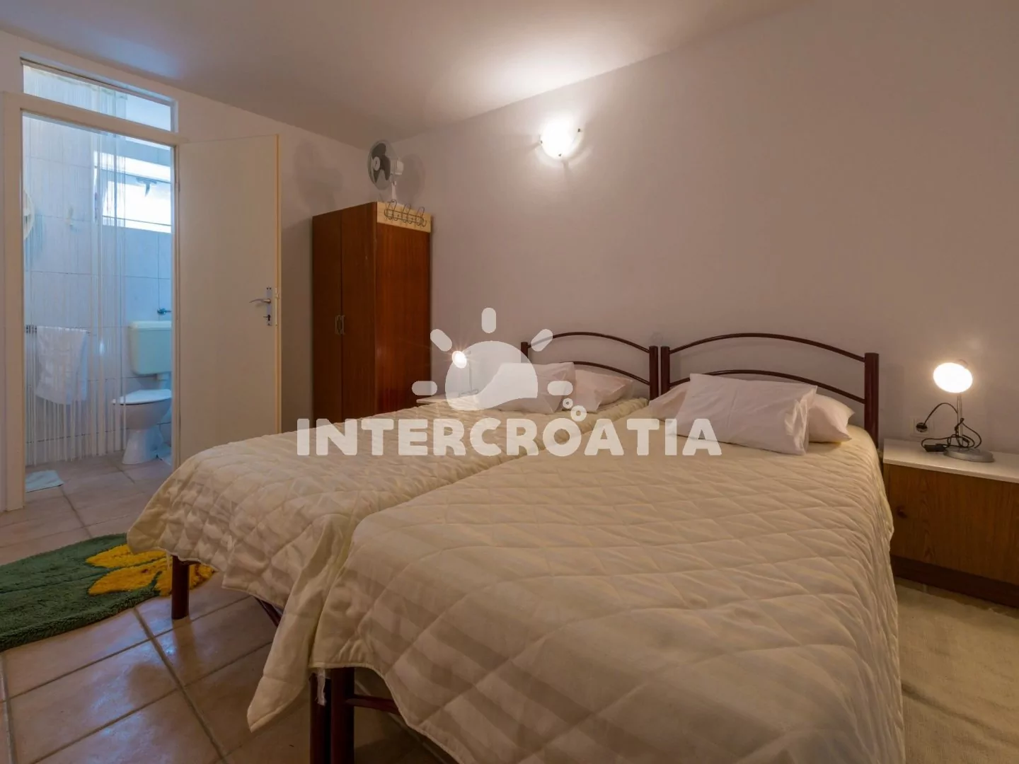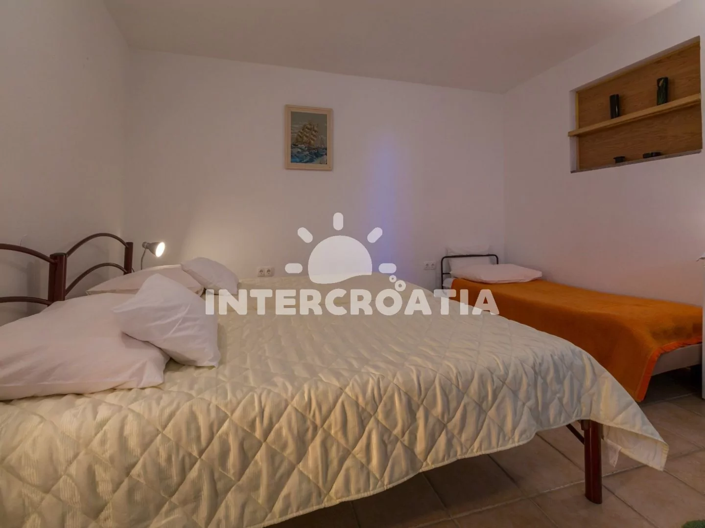 Apartmán (45 m2) s terasou a výhledem na moře se nachází v přízemí domu a je vhodný pro 2 až 3 osoby. Obývací pokoj je spojený s kuchyní. Kuchyňská linka je vybavena varnou deskou, troubou, rychlovarnou konvicí, kávovarem, nádobím a lednicí s mrazákem. Obývací pokoj s jídelním stolem pro 4 osoby, pohovkou, televizí se satelitním programem a vstupem na terasu. Ložnice s dvoulůžkem a jedním jednolůžkem. Koupelna se sprchovým koutem, umyvadlem, pračkou a wc. Hostům je k dispozici parkování u objektu zdarma.