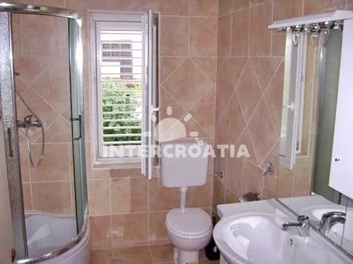 Apartmán (60 m2) s balkonem a výhledem na moře se nachází v 1. patře domu a je vhodný pro 4 osoby. Obývací pokoj je spojený s kuchyní. Kuchyňská linka je vybavena sporákem s troubou, rychlovarnou konvicí, mikrovlnnou troubou, kávovarem, toustovačem, nádobím a lednicí s mrazákem. Obývací pokoj s jídelním stolem pro 4 osoby, pohovkou, televizí se satelitním programem, radiem a klimatizací. První i druhá ložnice je vybavena vždy s jedním dvoulůžkem a vstupem na balkon. Koupelna se sprchovým koutem, umyvadlem a wc. Hostům je k dispozici parkování u objektu zdarma.