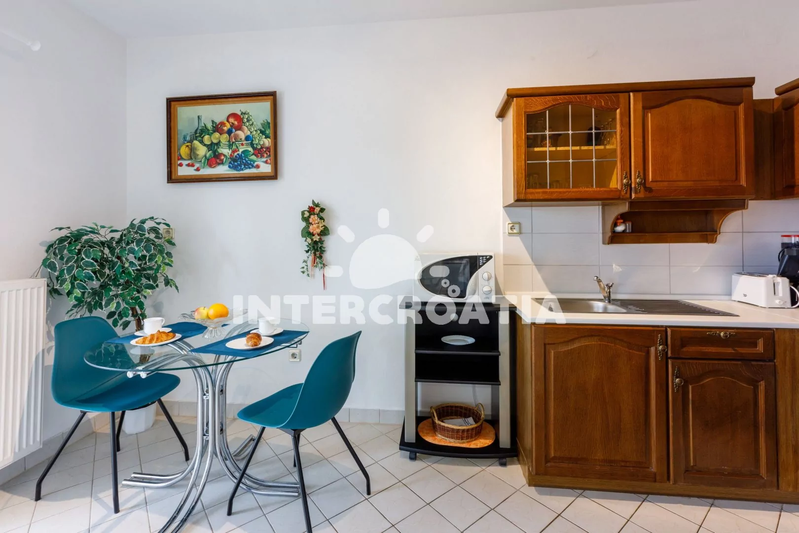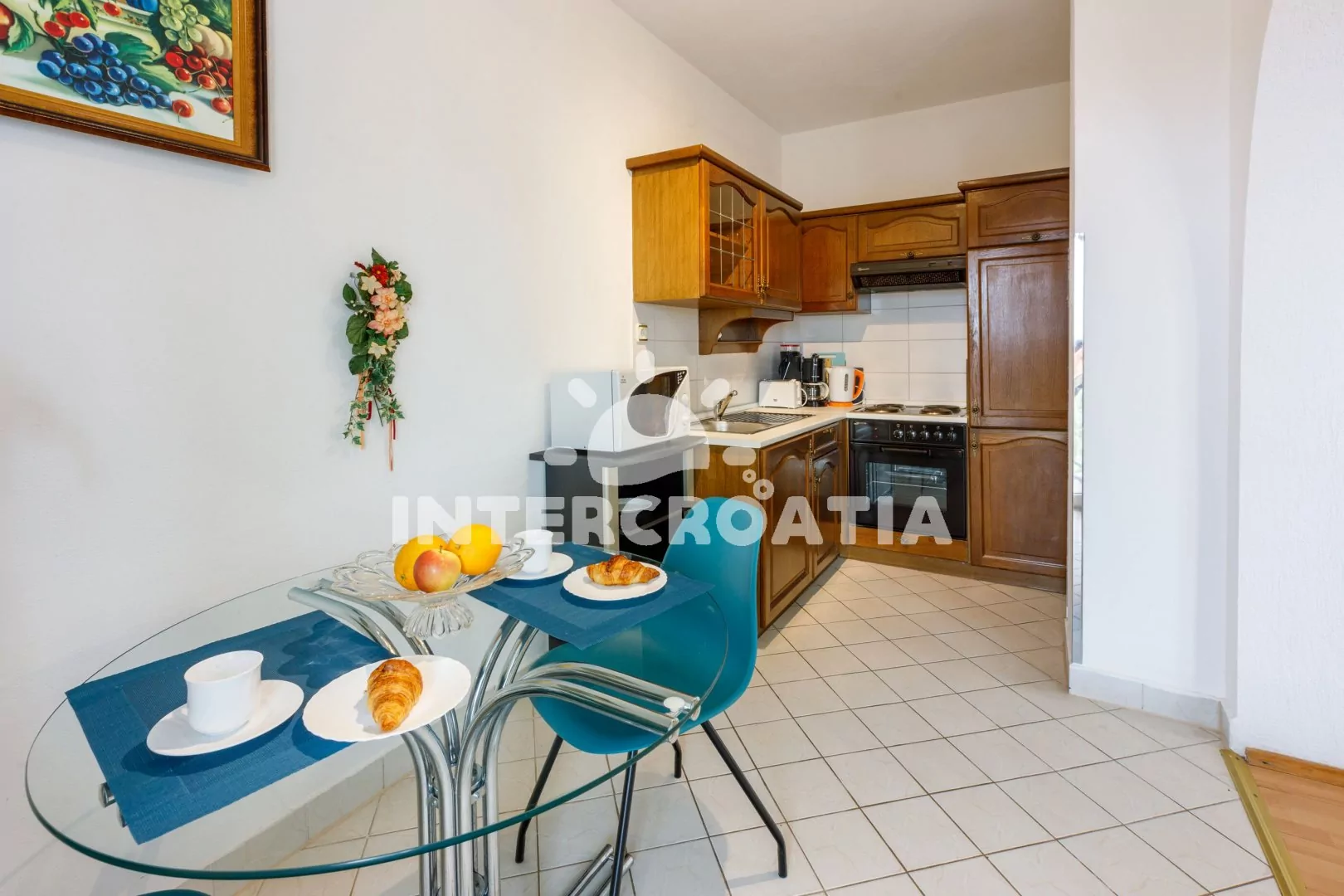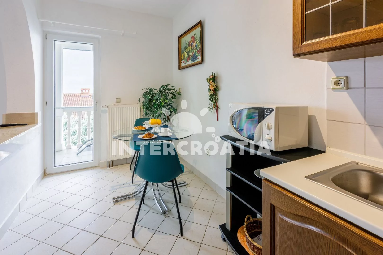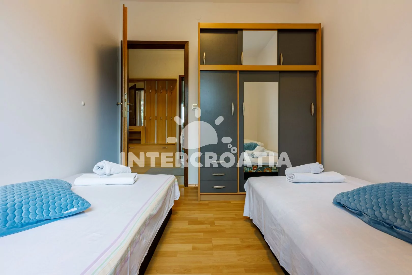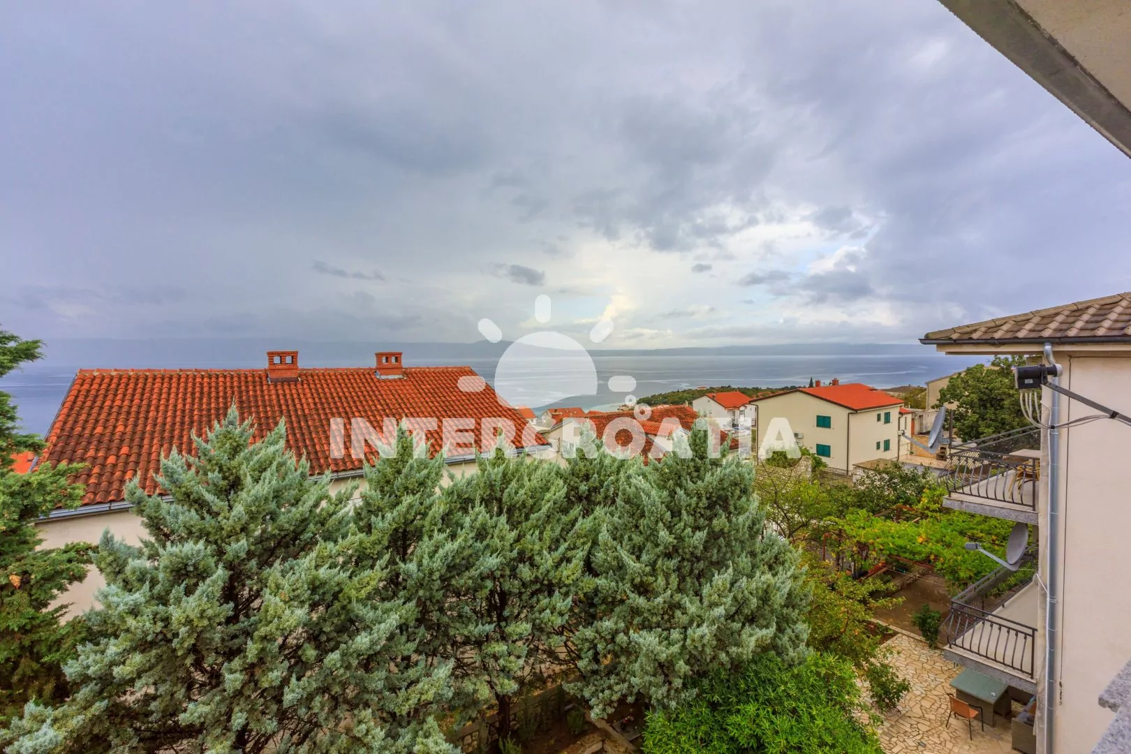 Apartmán (65 m2) s balkonem a výhledem na moře se nachází v 1. patře vily. Apartmán má 2 ložnice a je vhodný pro 4 až 5 osob. Obývací pokoj je spojený s kuchyní. Kuchyňská linka je vybavena varnou deskou, digestoří, troubou, mikrovlnnou troubou, rychlovarnou konvicí, kávovarem, toustovačem, nádobím a lednicí s mrazákem. Obývací pokoj s jídelním stolem pro 4 osoby, pohovkou (rozložitelná na extra lůžko pro 1 osobu), televizí se satelitním programem, radiem, klimatizací a vstupem na balkon. První ložnice s dvoulůžkem. Druhá ložnice s dvěma jednolůžky. Koupelna se sprchovým koutem, umyvadlem a wc. Hostům je k dispozici parkování u objektu zdarma.