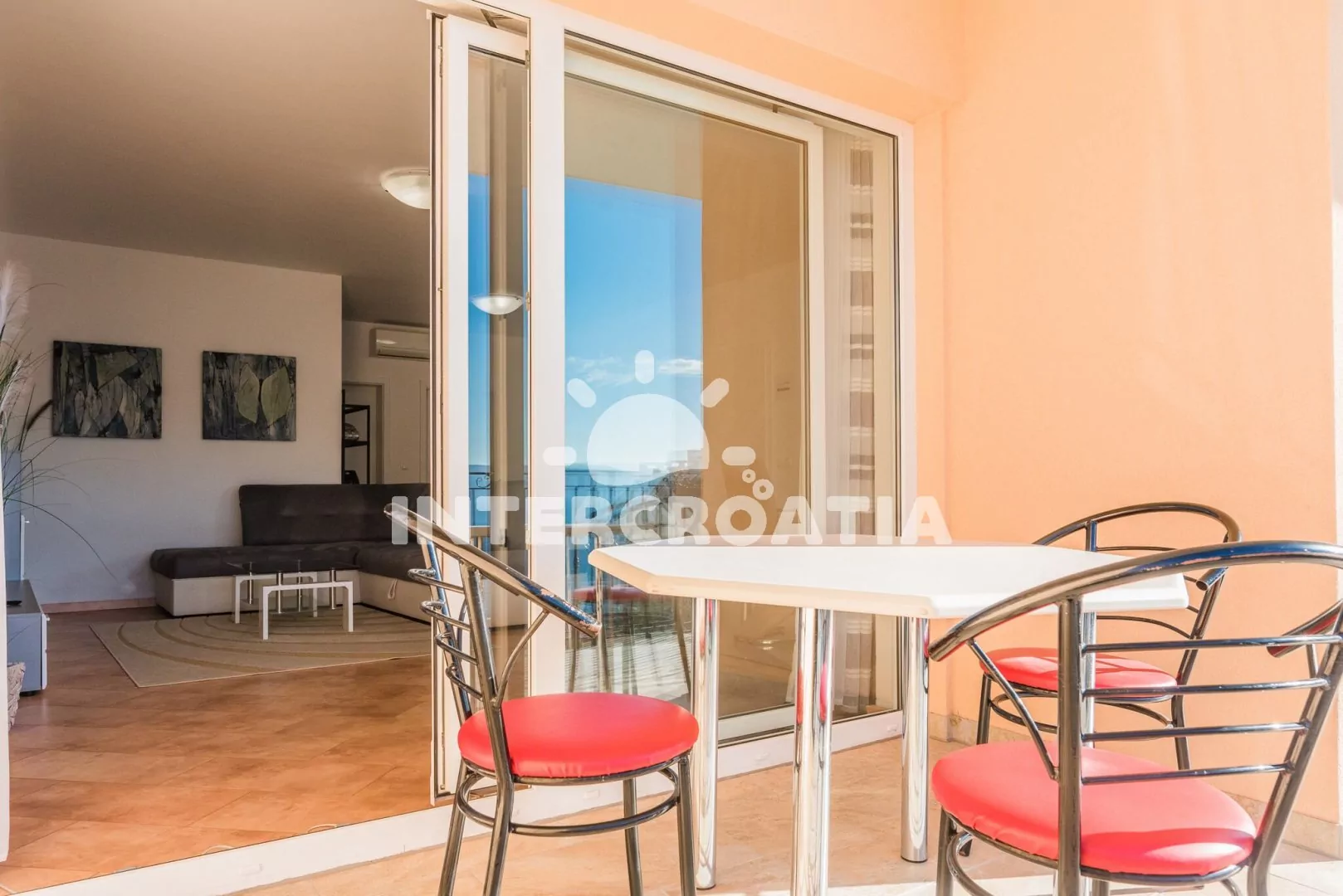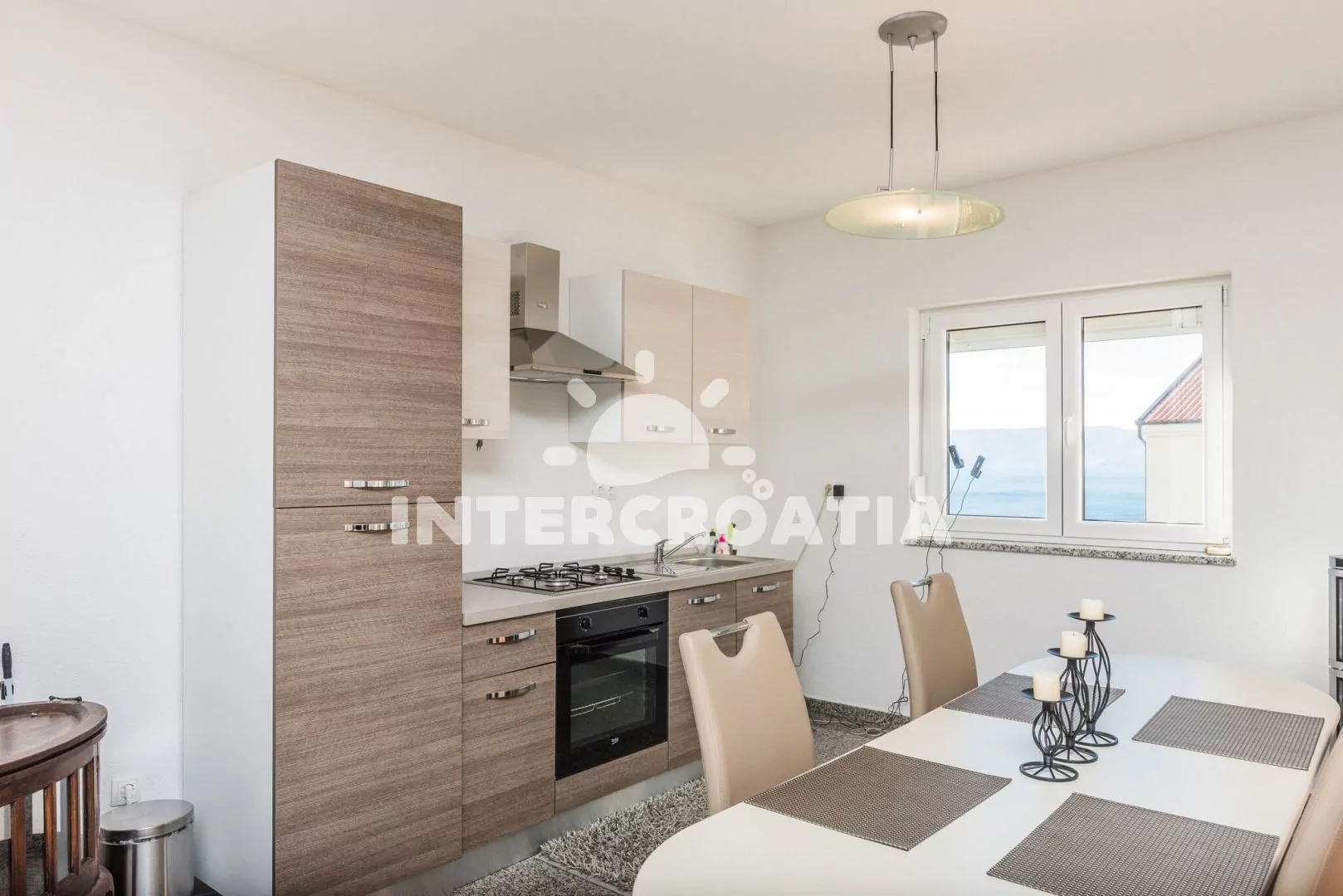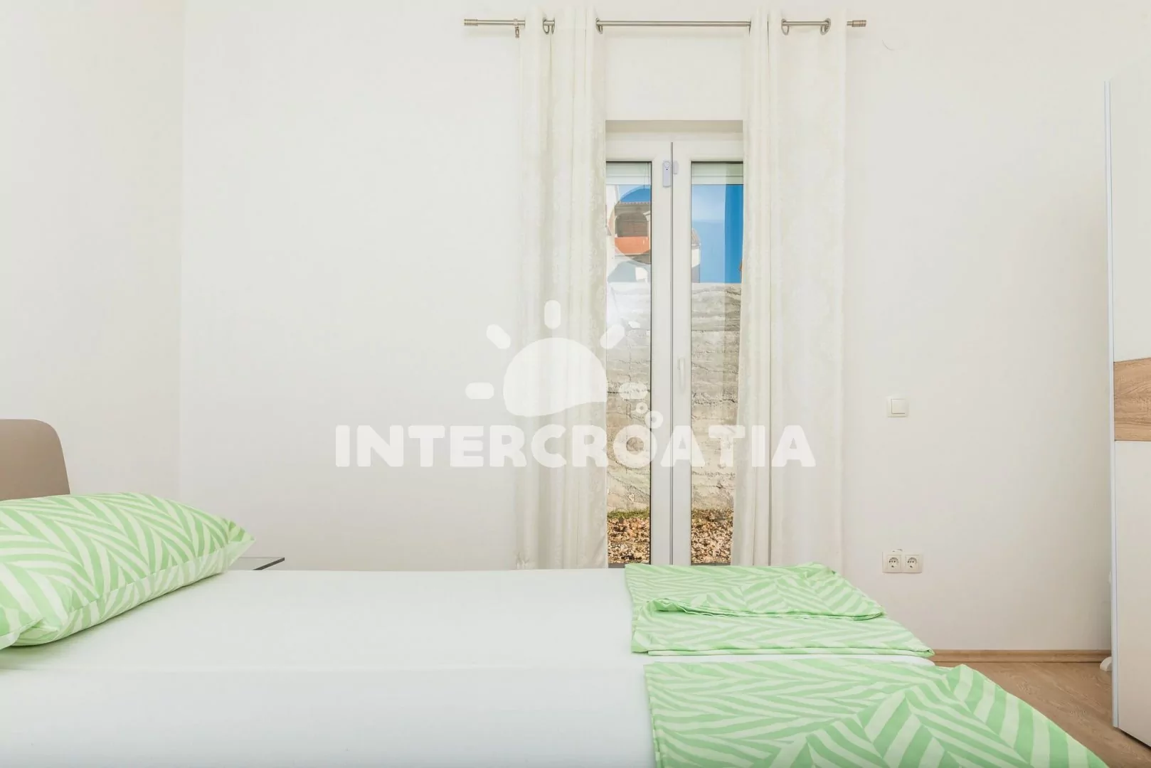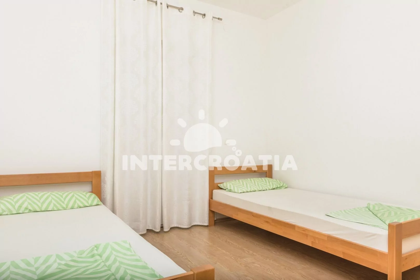 Apartmán (85 m2) s terasou, výhledem na moře a venkovním posezením se nachází v 1. patře domu. Apartmán má 2 ložnice a je vhodný pro 4 až 5 osob. Obývací pokoj je spojený s kuchyní. Kuchyňská linka je vybavena varnou deskou, digestoří, vestavěnou troubou, rychlovarnou konvicí, kávovarem, toustovačem, nádobím a lednicí s mrazákem. Obývací pokoj s jídelním stolem pro 4 osoby, rohovou pohovkou (rozložitelná na extra lůžko pro 1 osobu), televizí se satelitním programem, klimatizací a vstupem na terasu. První ložnice s dvoulůžkem. Druhá ložnice s dvěma jednolůžky. Koupelna se sprchovým koutem, umyvadlem, fénem a wc. Hostům je k dispozici parkování u objektu zdarma.