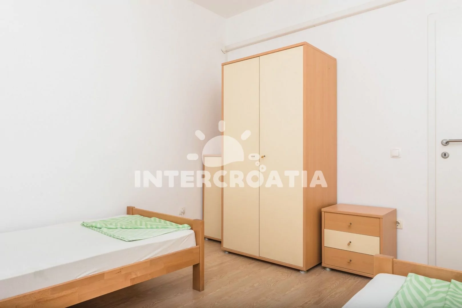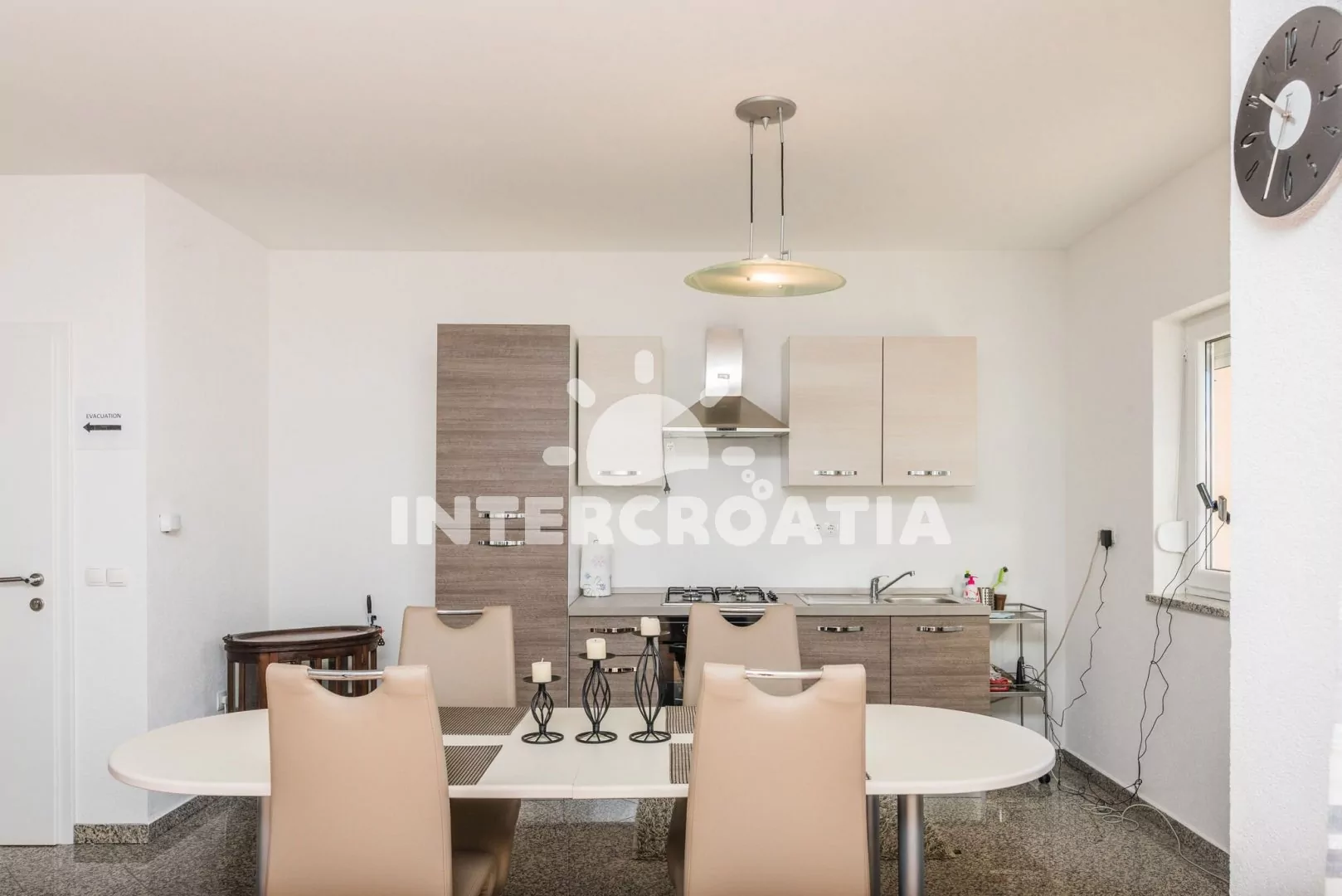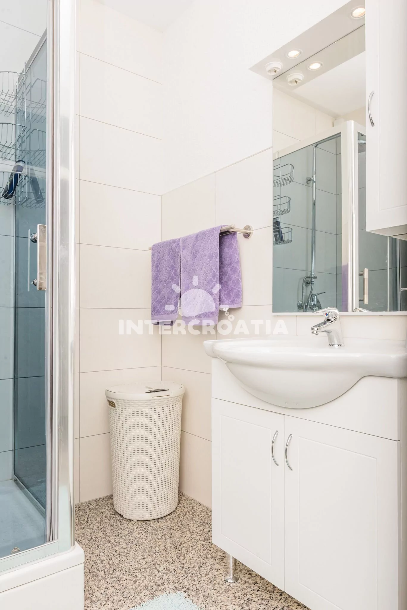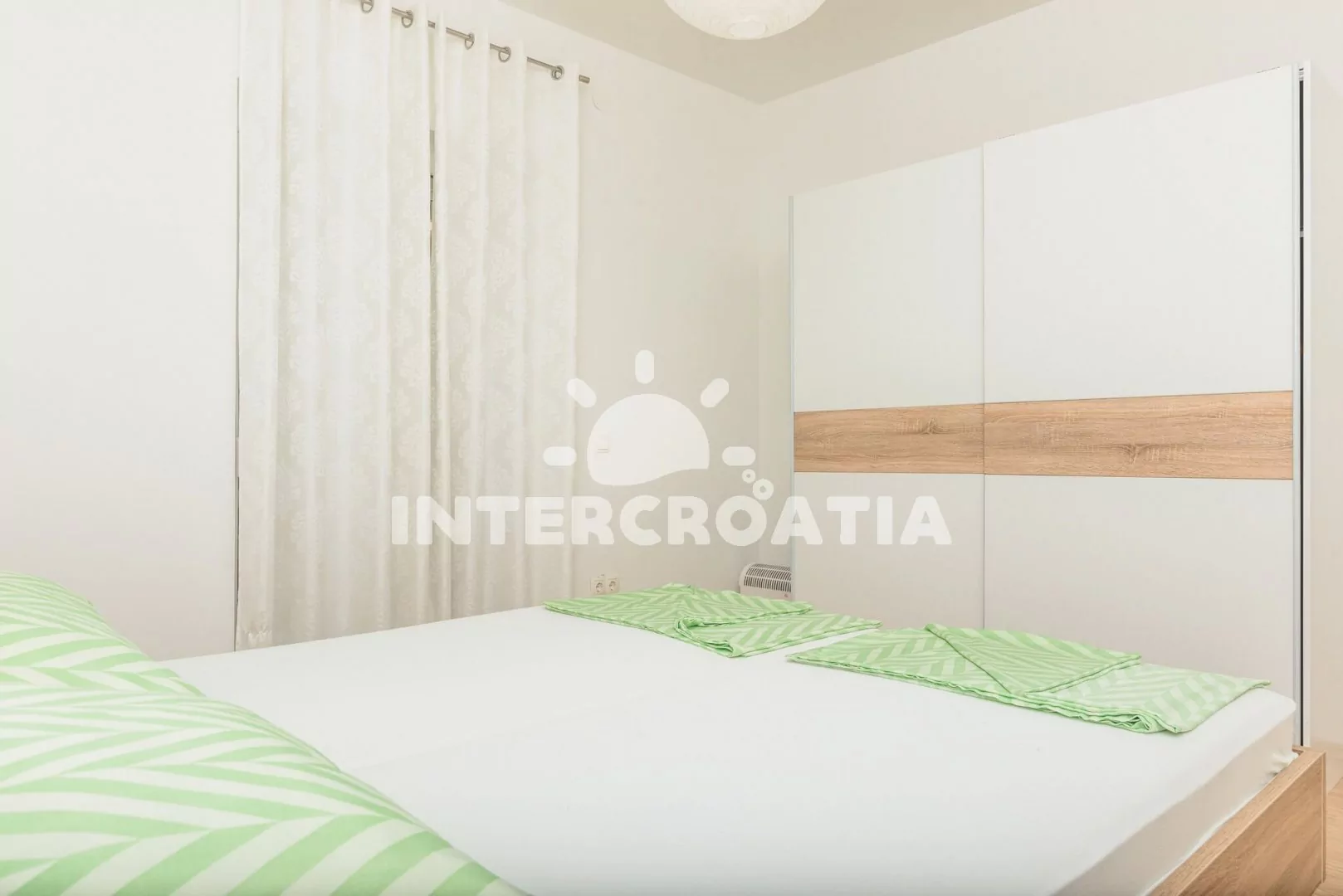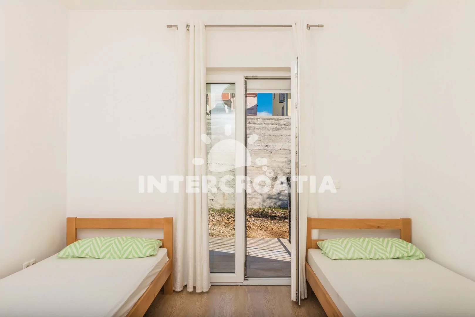 Apartmán (85 m2) s terasou, výhledem na moře a venkovním posezením se nachází v 1. patře domu. Apartmán má 2 ložnice a je vhodný pro 4 až 5 osob. Obývací pokoj je spojený s kuchyní. Kuchyňská linka je vybavena varnou deskou, digestoří, vestavěnou troubou, rychlovarnou konvicí, kávovarem, toustovačem, nádobím a lednicí s mrazákem. Obývací pokoj s jídelním stolem pro 4 osoby, rohovou pohovkou (rozložitelná na extra lůžko pro 1 osobu), televizí se satelitním programem, klimatizací a vstupem na terasu. První ložnice s dvoulůžkem. Druhá ložnice s dvěma jednolůžky. Koupelna se sprchovým koutem, umyvadlem, fénem a wc. Hostům je k dispozici parkování u objektu zdarma.