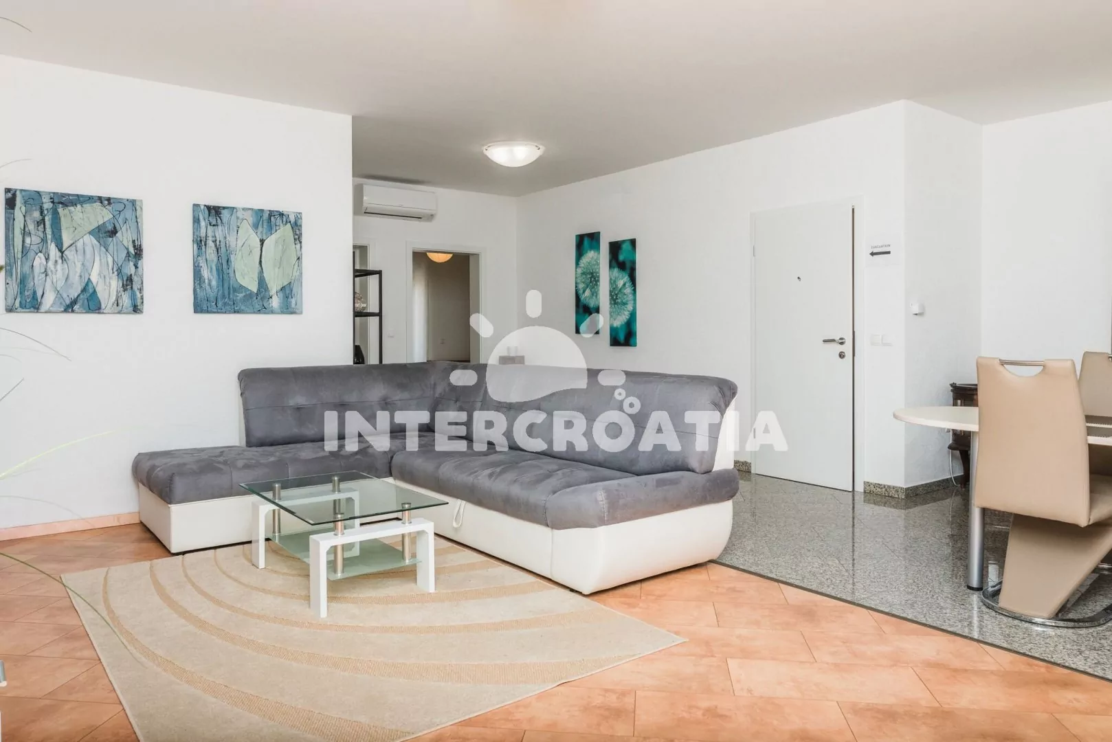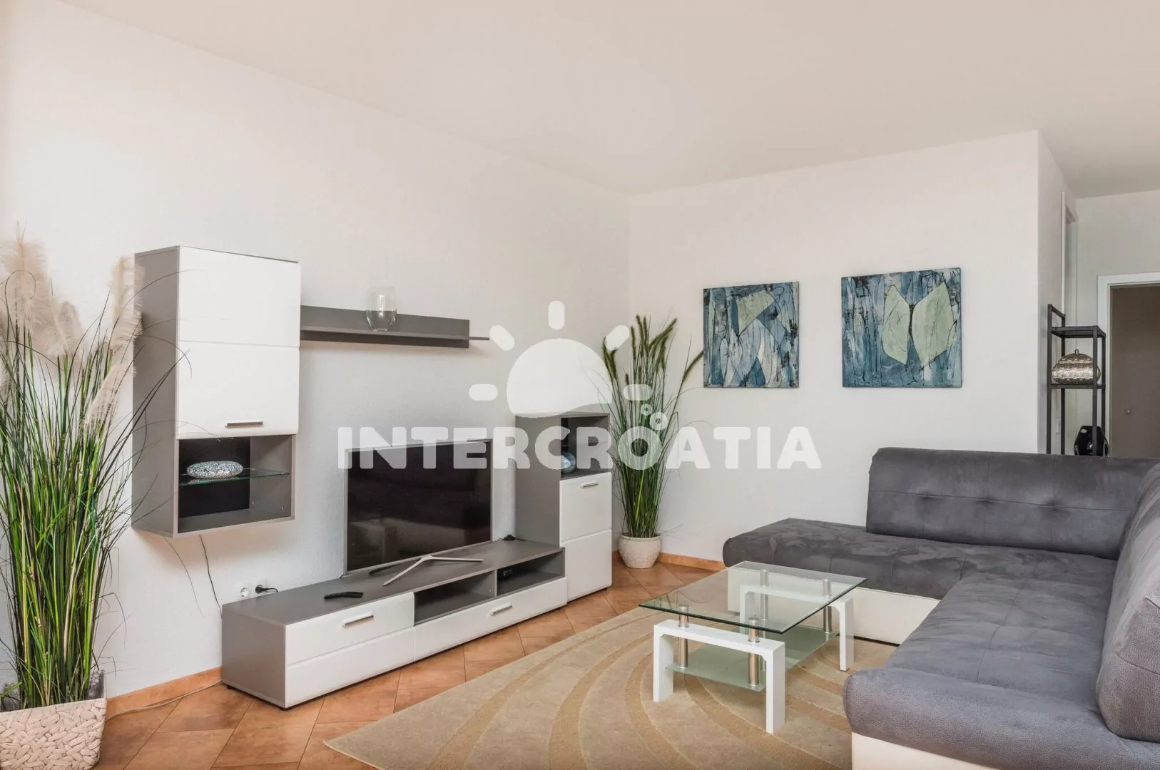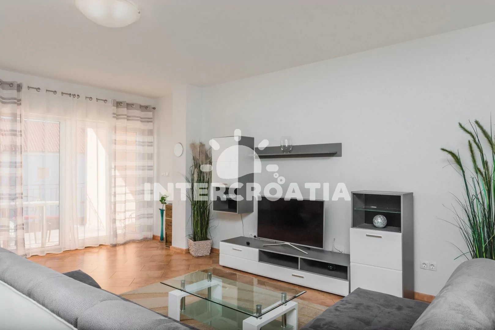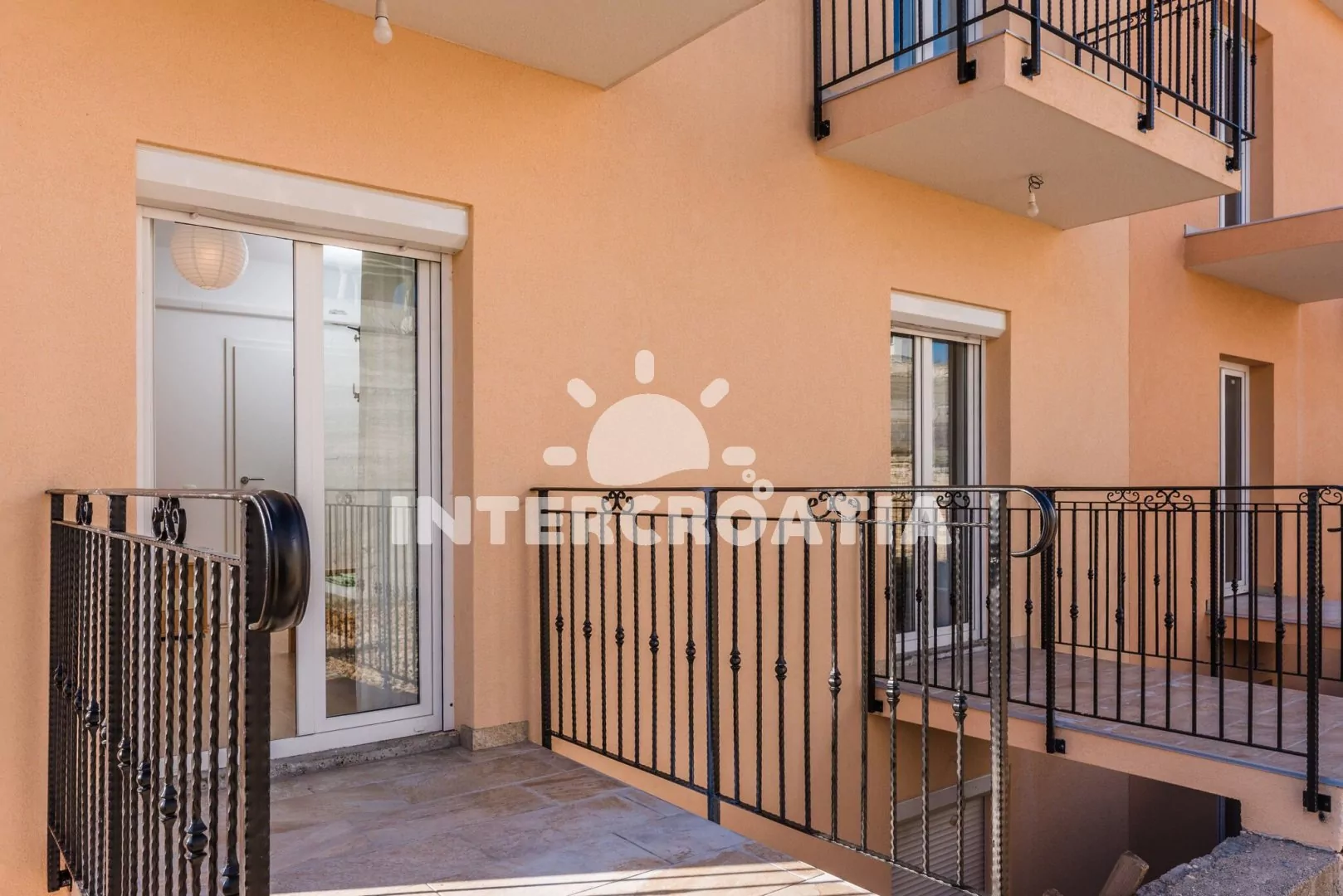 Apartmán (85 m2) s terasou, výhledem na moře a venkovním posezením se nachází v 1. patře domu. Apartmán má 2 ložnice a je vhodný pro 4 až 5 osob. Obývací pokoj je spojený s kuchyní. Kuchyňská linka je vybavena varnou deskou, digestoří, vestavěnou troubou, rychlovarnou konvicí, kávovarem, toustovačem, nádobím a lednicí s mrazákem. Obývací pokoj s jídelním stolem pro 4 osoby, rohovou pohovkou (rozložitelná na extra lůžko pro 1 osobu), televizí se satelitním programem, klimatizací a vstupem na terasu. První ložnice s dvoulůžkem. Druhá ložnice s dvěma jednolůžky. Koupelna se sprchovým koutem, umyvadlem, fénem a wc. Hostům je k dispozici parkování u objektu zdarma.