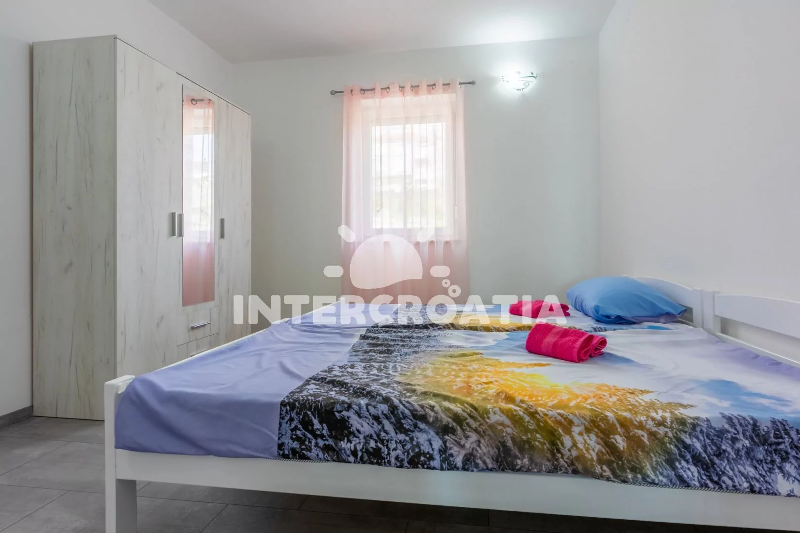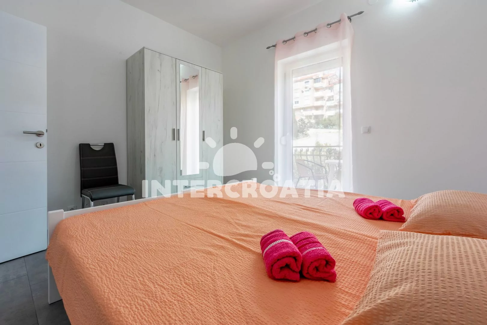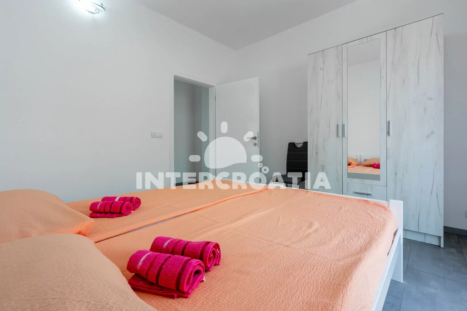Apartmán (60 m2) s balkonem, terasou, posezením a výhledem na moře se nachází ve 2. patře domu. Apartmán má 2 ložnice a je vhodný pro 4 až 6 osob. Obývací pokoj je spojený s kuchyní. Kuchyňská linka je vybavena dvouplotýnkovou varnou deskou, digestoří, mikrovlnnou troubou, rychlovarnou konvicí, kávovarem, toustovačem, nádobím a lednicí s mrazákem. Obývací pokoj s pohovkou (rozložitelná na extra lůžko pro 2 osoby), televizí se satelitním programem, klimatizací a vstupem na terasu. První ložnice s dvěma jednolůžky. Druhá ložnice s dvěma jednolůžky a vstupem na balkon. Koupelna se sprchovým koutem, umyvadlem, fénem, pračkou a wc. Hostům je k dispozici parkování u objektu zdarma.