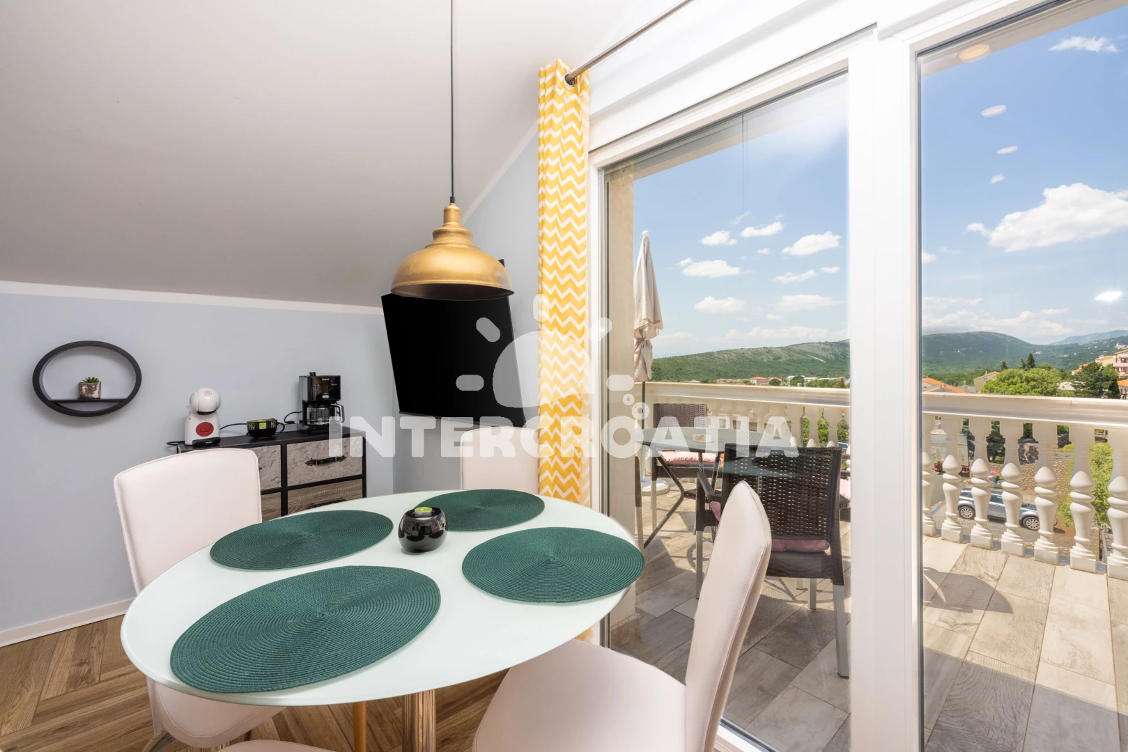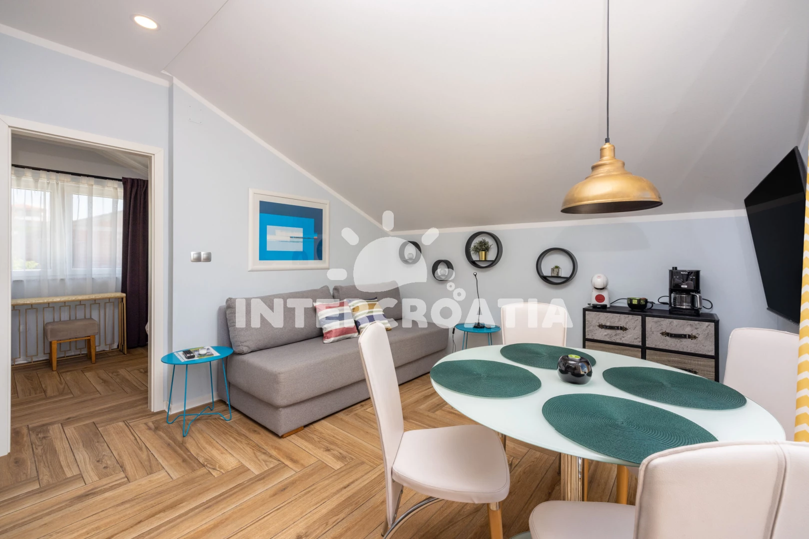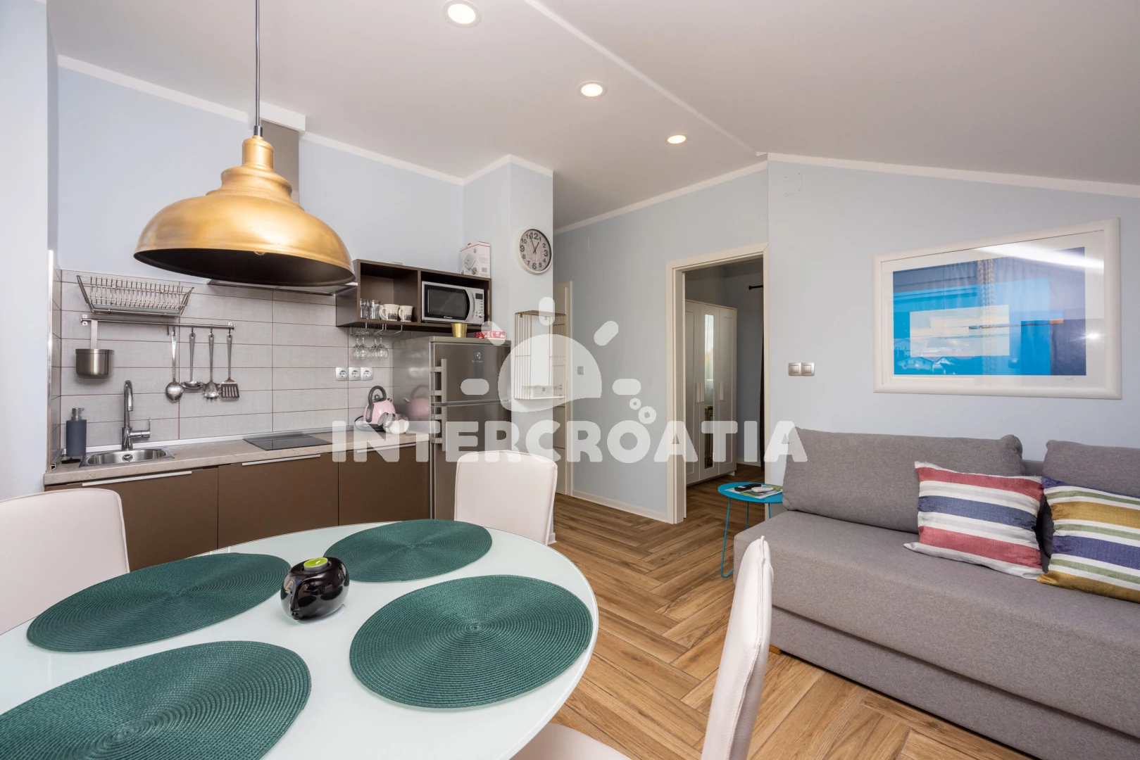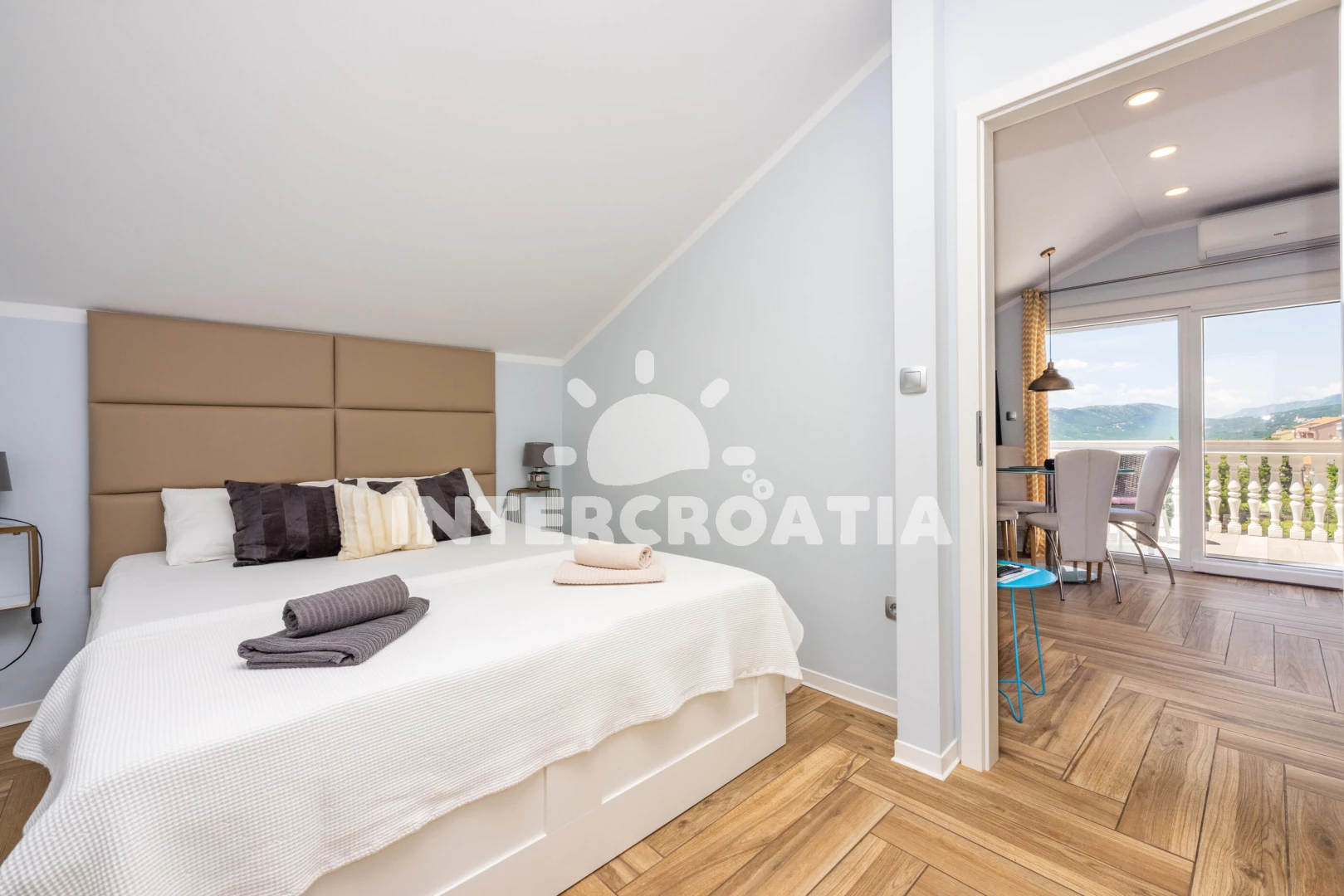 Apartmán (32 m2) s terasou, venkovním posezením a výhledem na moře se nachází ve 2. patře vily. Apartmán má 1 ložnici a je vhodný pro 2 až 4 osoby. Obývací pokoj je spojený s kuchyní. Kuchyňská linka je vybavena dvouplotýnkovým vařičem, digestoří, mikrovlnnou troubou, rychlovarnou konvicí, toustovačem, kávovarem, nádobím a lednicí s mrazákem. Obývací pokoj s jídelním stolem, pohovkou (rozložitelná na extra lůžko pro 2 osoby), televizí, klimatizací a vstupem na terasu. Ložnice s jedním dvoulůžkem. Koupelna se sprchovým koutem, umyvadlem, fénem a wc. Hostům je k dispozici parkování u objektu zdarma.