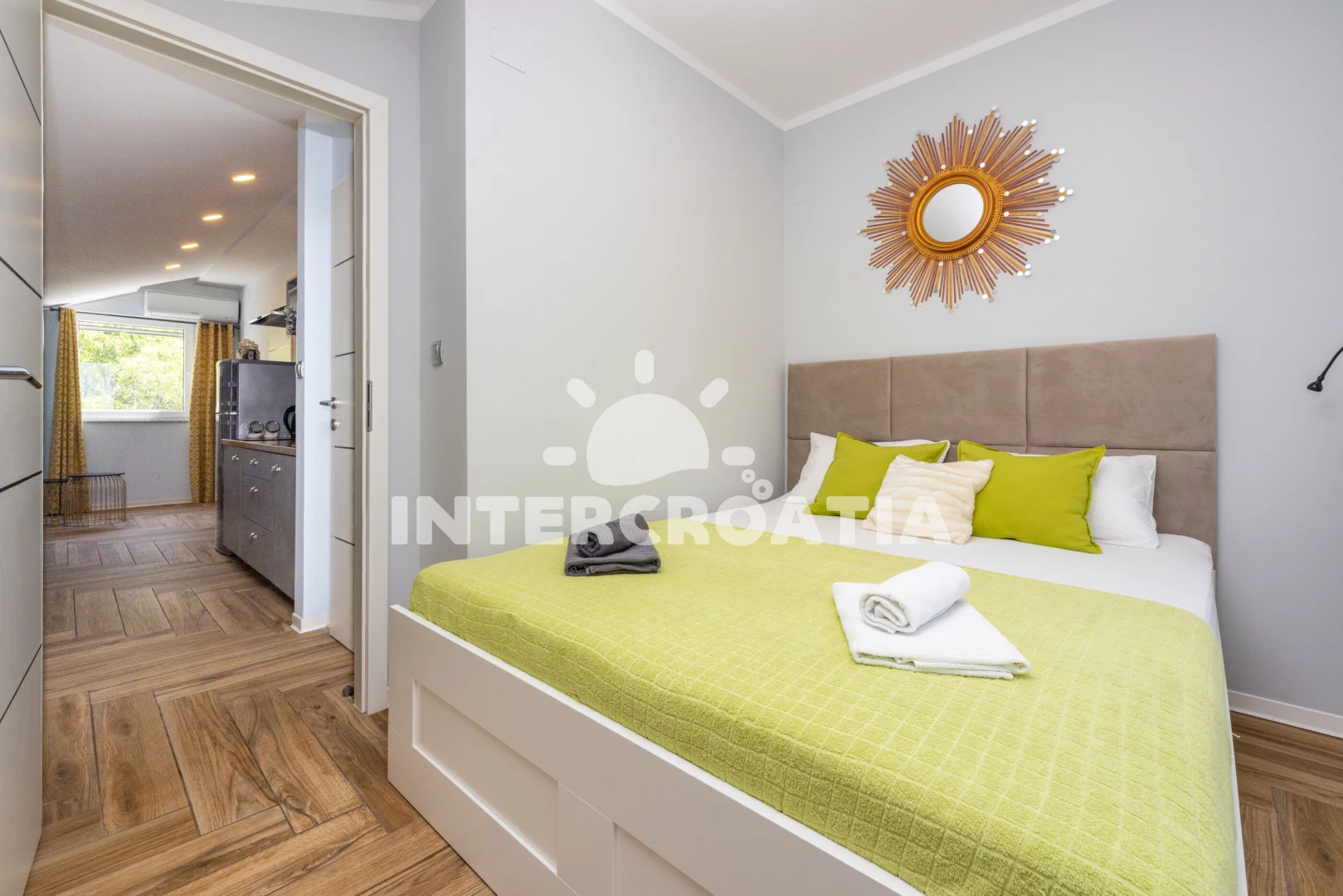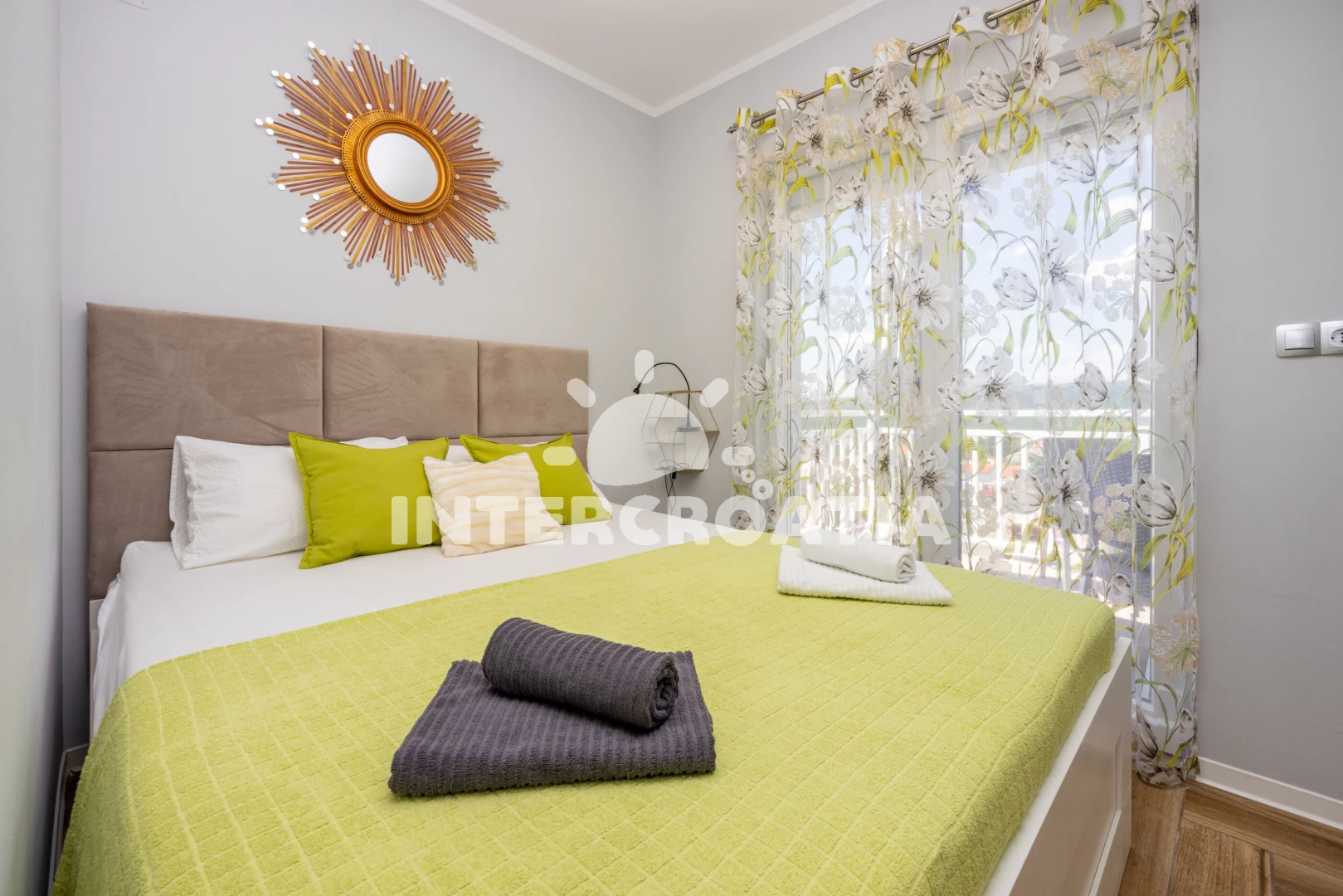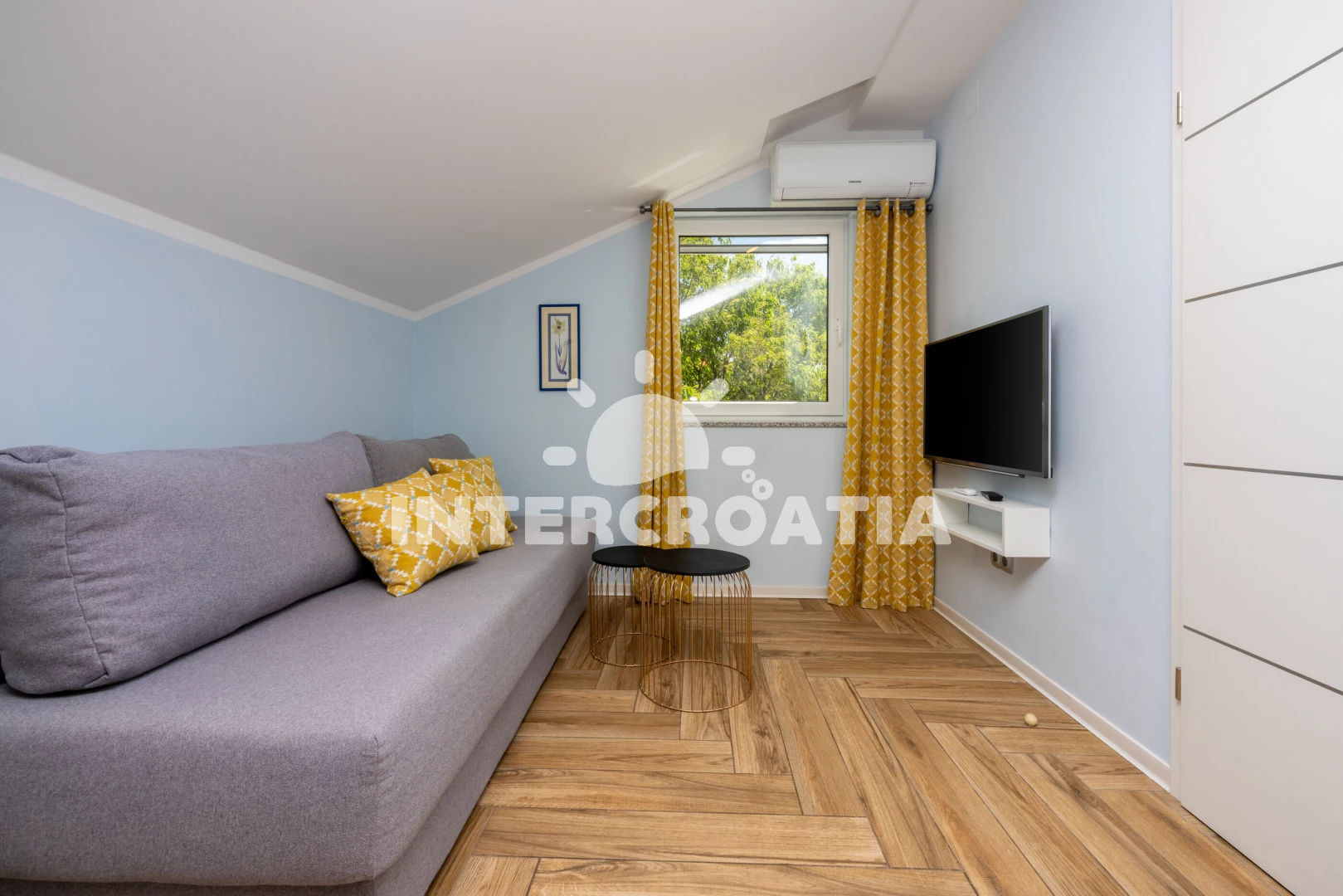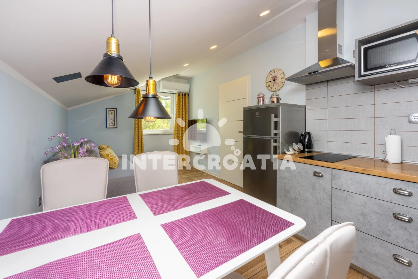 Apartmán (31 m2) s balkonem, posezením a částečným výhledem na moře se nachází ve 2. patře vily. Apartmán má 1 ložnici a je vhodný pro 2 až 4 osoby. Obývací pokoj je spojený s kuchyní. Kuchyňská linka je vybavena dvouplotýnkovým vařičem, digestoří, mikrovlnnou troubou, rychlovarnou konvicí, toustovačem, kávovarem, nádobím a lednicí s mrazákem. Obývací pokoj s jídelním stolem, pohovkou (rozložitelná na extra lůžko pro 2 osoby), televizí, klimatizací a vstupem na balkon. Ložnice s jedním dvoulůžkem. Koupelna se sprchovým koutem, umyvadlem, fénem a wc. Hostům je k dispozici parkování u objektu zdarma.