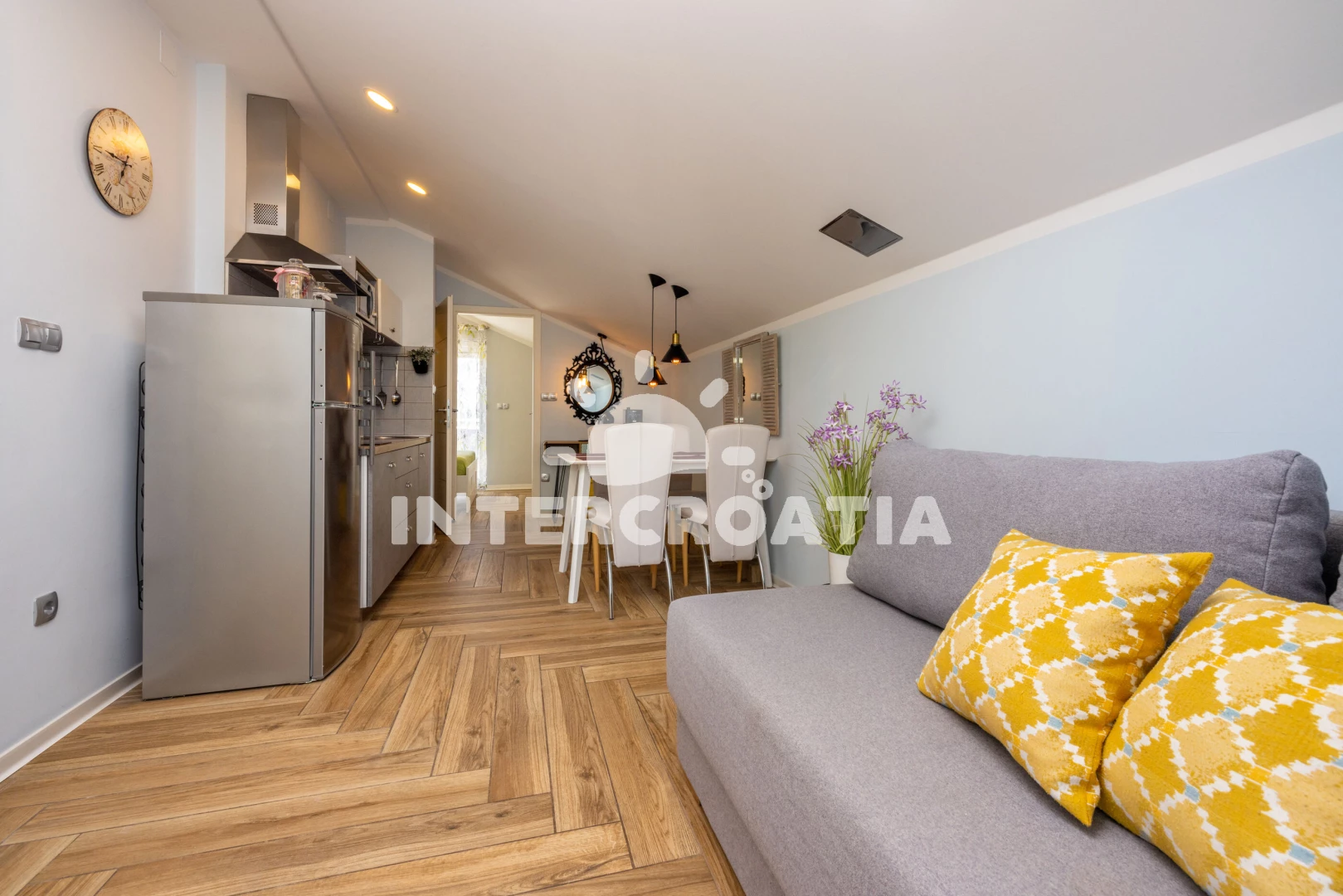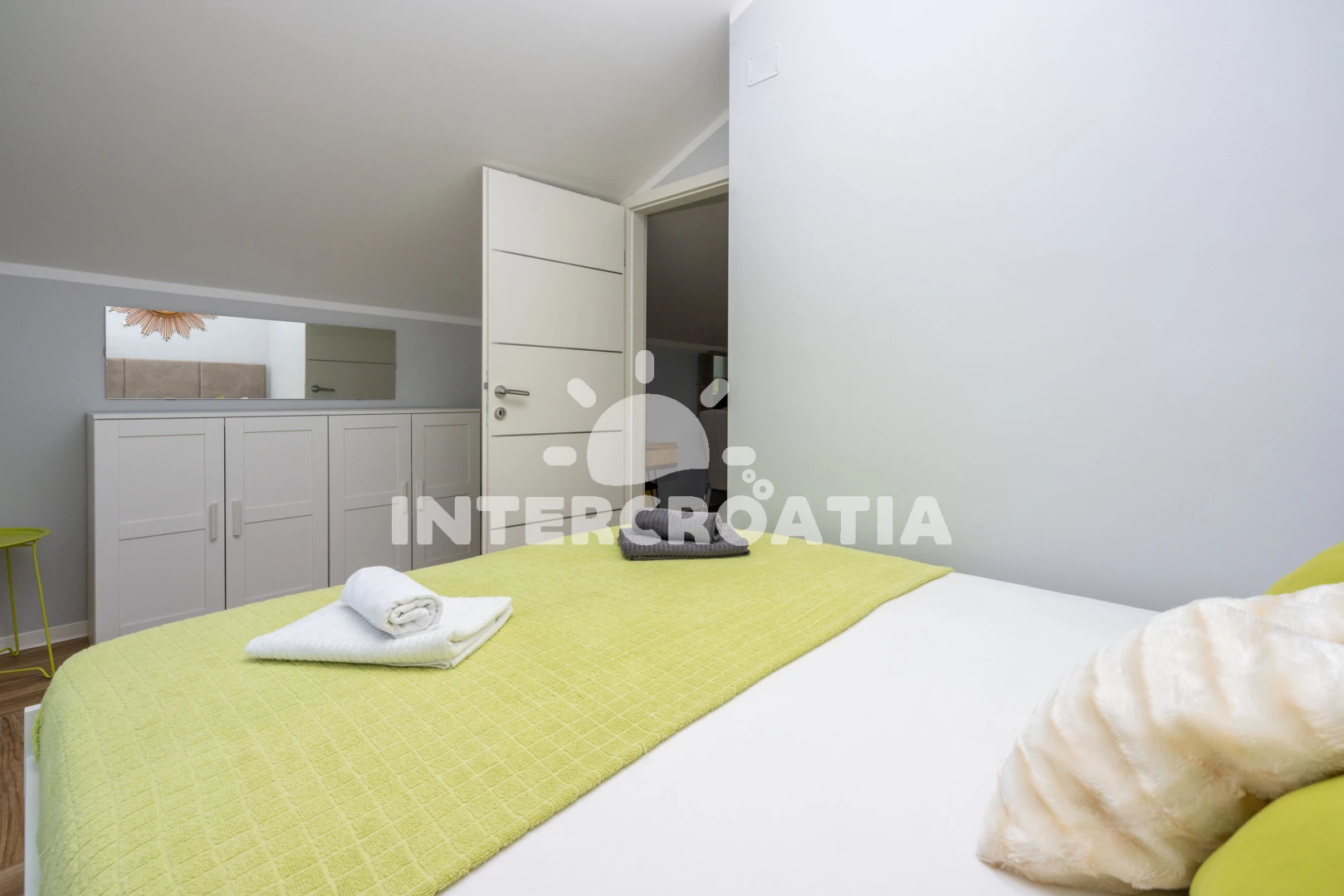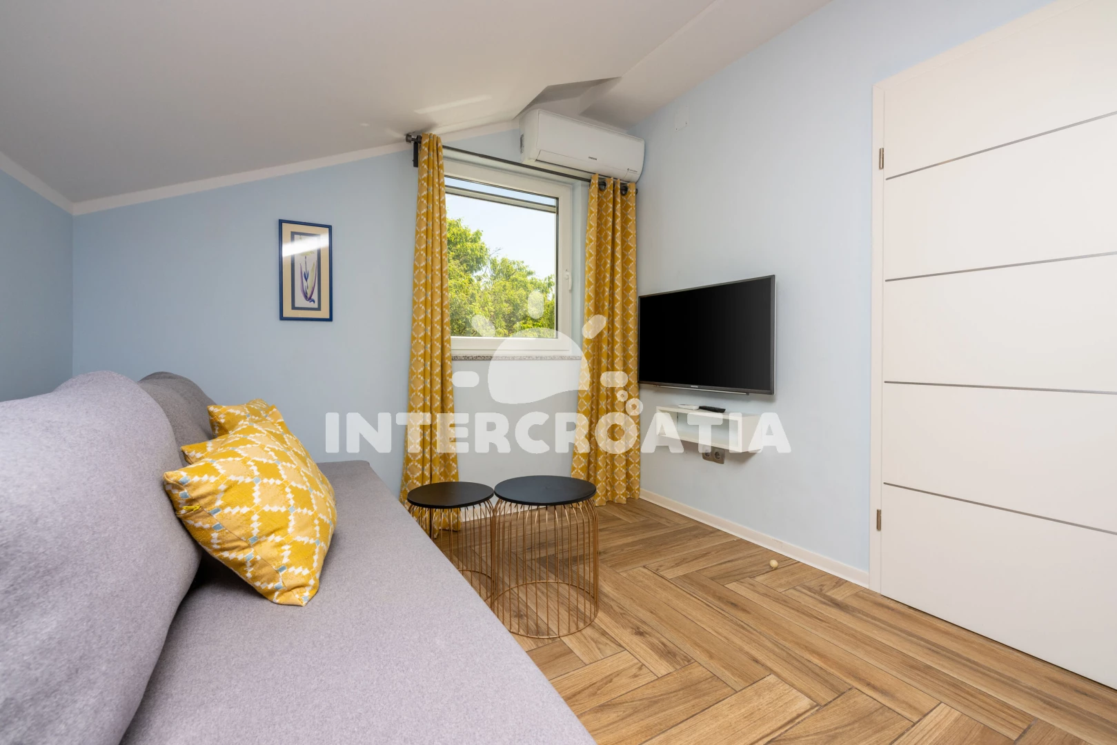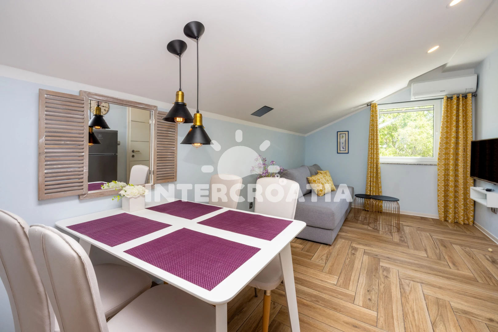 Apartmán (31 m2) s balkonem, posezením a částečným výhledem na moře se nachází ve 2. patře vily. Apartmán má 1 ložnici a je vhodný pro 2 až 4 osoby. Obývací pokoj je spojený s kuchyní. Kuchyňská linka je vybavena dvouplotýnkovým vařičem, digestoří, mikrovlnnou troubou, rychlovarnou konvicí, toustovačem, kávovarem, nádobím a lednicí s mrazákem. Obývací pokoj s jídelním stolem, pohovkou (rozložitelná na extra lůžko pro 2 osoby), televizí, klimatizací a vstupem na balkon. Ložnice s jedním dvoulůžkem. Koupelna se sprchovým koutem, umyvadlem, fénem a wc. Hostům je k dispozici parkování u objektu zdarma.