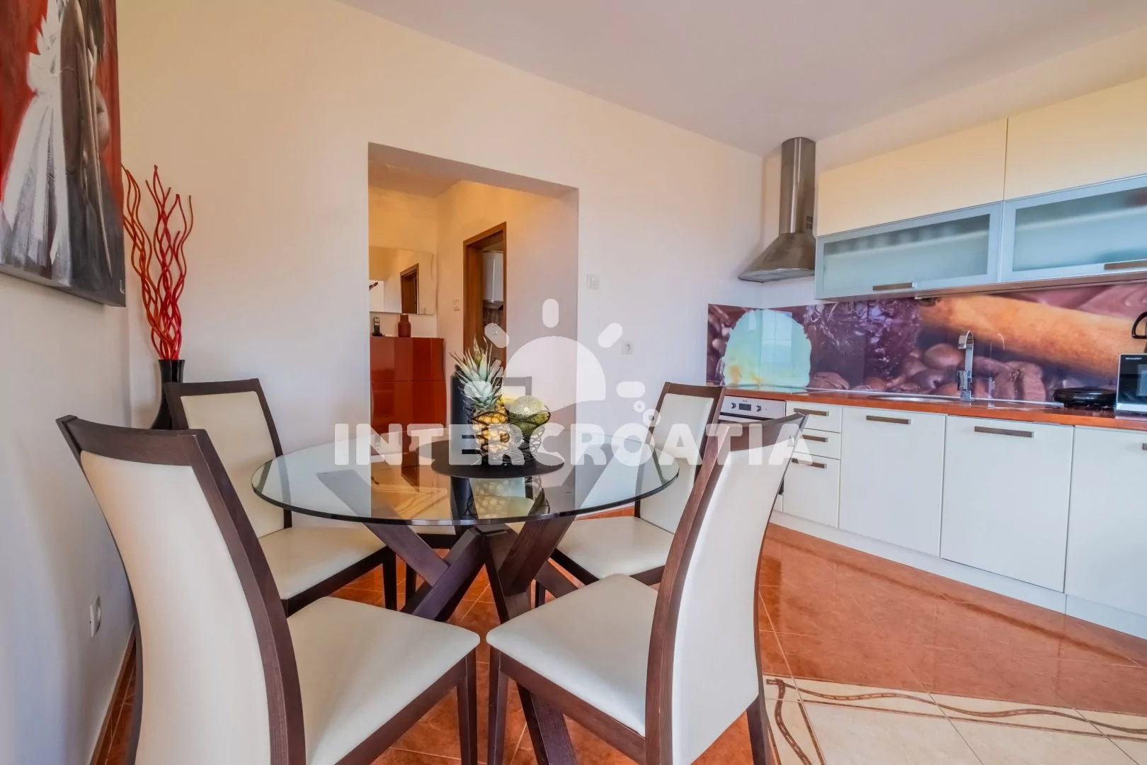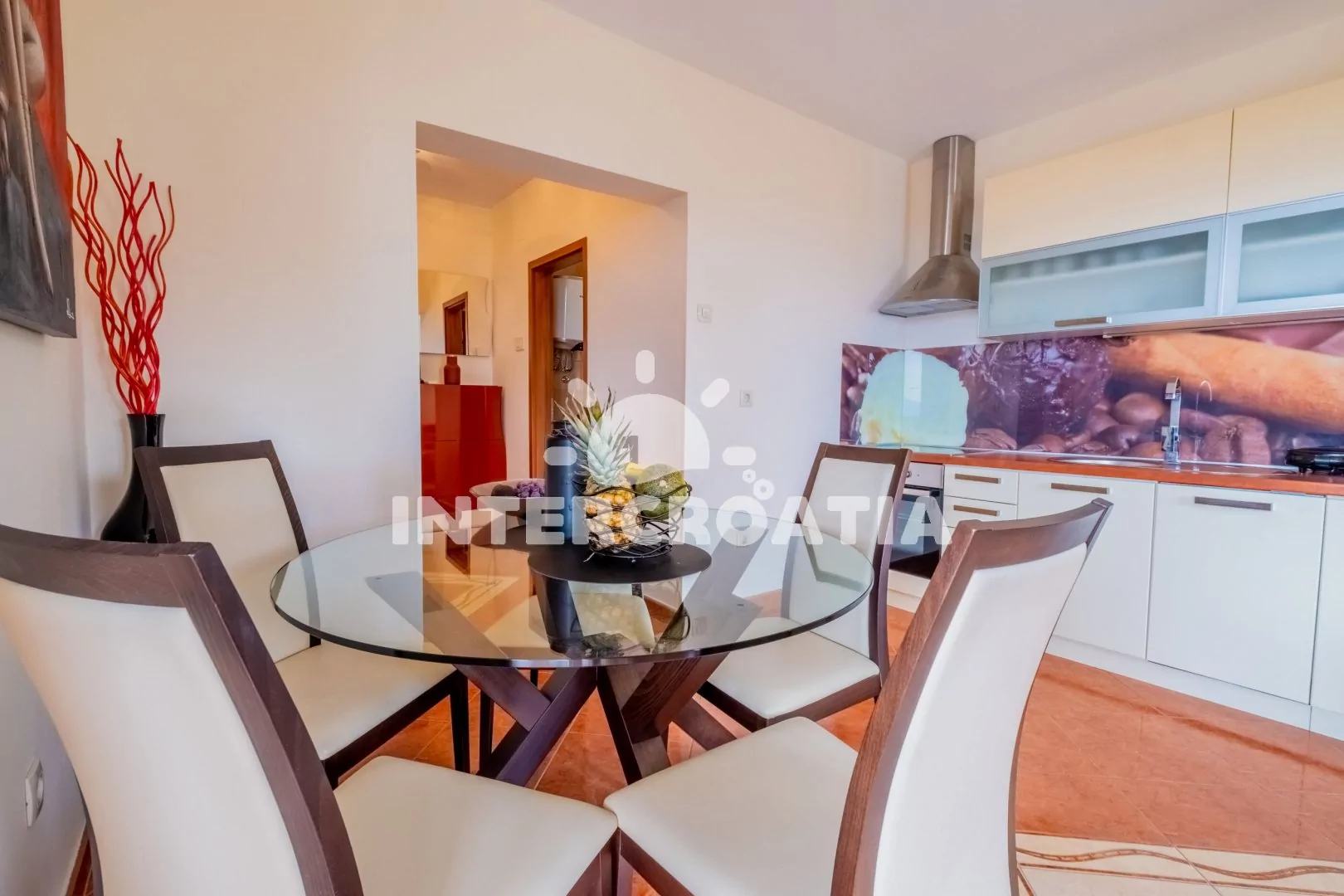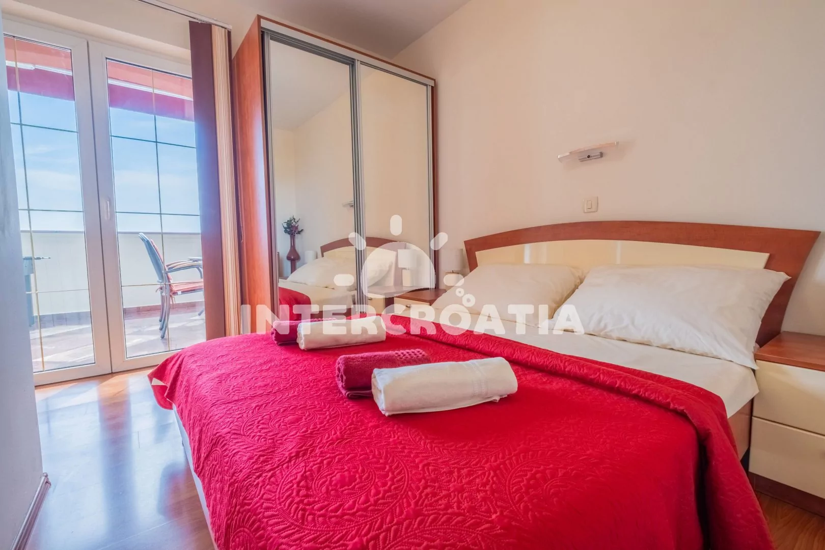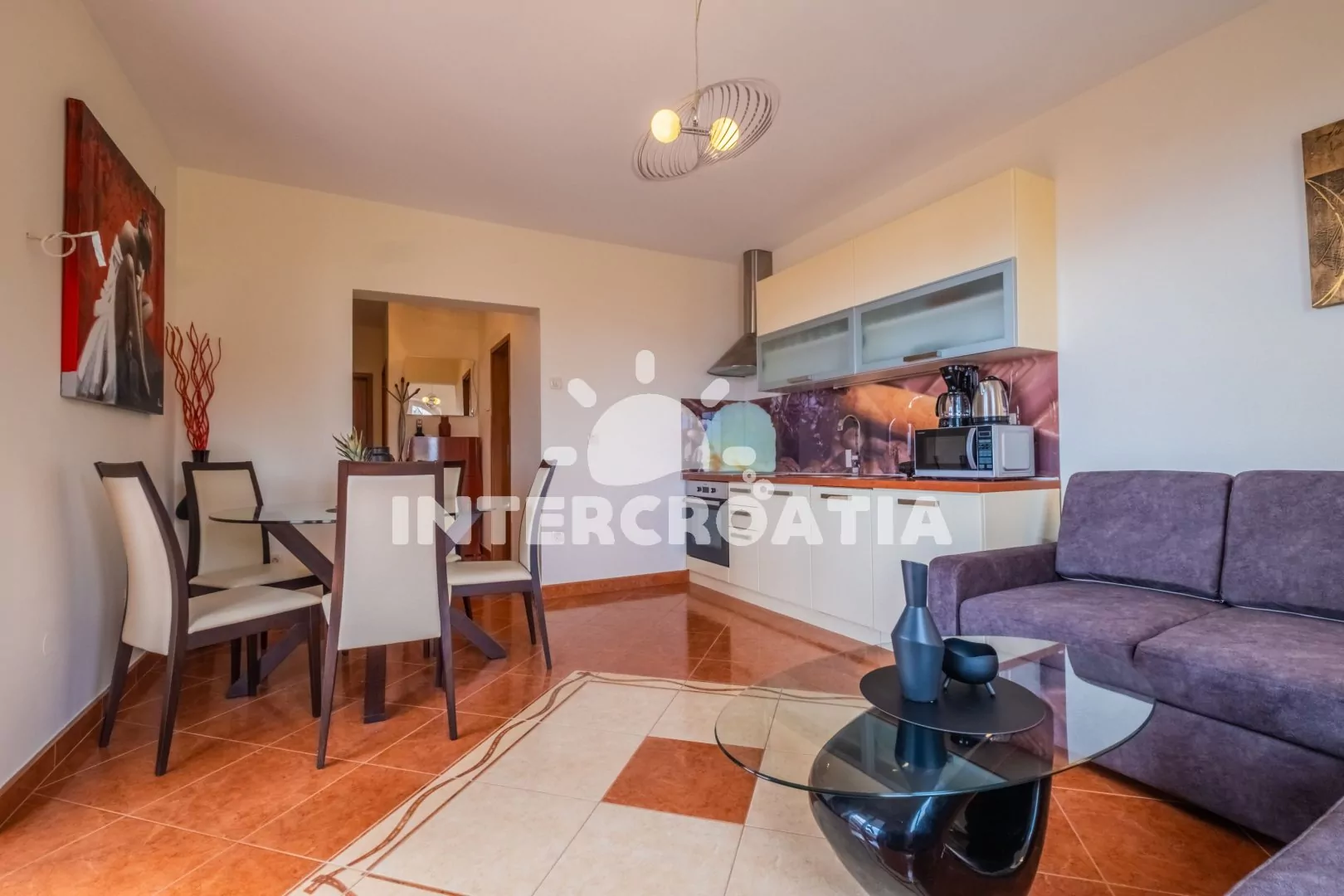 Apartmán (40 m2) s terasou a venkovním posezením se nachází v 1. patře domu. Apartmán má 2 ložnice a je vhodný pro 3 až 4 osoby. Obývací pokoj je spojený s kuchyní. Kuchyňská linka je vybavena sklokeramickou varnou deskou, digestoří, vestavěnou troubou, myčkou na nádobí, rychlovarnou konvicí, kávovarem, mikrovlnnou troubou, nádobím a lednicí s mrazákem. Obývací pokoj s jídelním stolem, pohovkou (rozložitelná na extra lůžko pro 1 osobu), televizí se satelitním programem, klimatizací a vstupem na terasu. První ložnice s dvoulůžkem. Druhá ložnice s jednolůžkem. Koupelna se sprchovým koutem, umyvadlem, pračkou a wc. Hostům je k dispozici parkování u objektu zdarma.