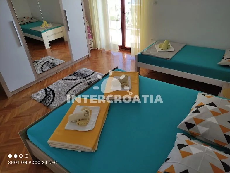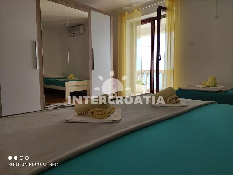Apartmán (75 m2) s terasou, posezením a výhledem na moře se nachází ve 2. patře domu. Apartmán má 2 ložnice a je vhodný pro 5 až 6 osob. Obývací pokoj je spojený s kuchyní. Kuchyňská linka je vybavena sporákem s troubou, myčkou na nádobí, mikrovlnnou troubou, rychlovarnou konvicí, kávovarem, nádobím a lednicí s mrazákem. Obývací pokoj s jídelním stolem, pohovkou (rozložitelná na extra lůžko pro 1 osobu) a televizí. První ložnice s dvoulůžkem, jednolůžkem, klimatizací a vstupem na terasu. Druhá ložnice s dvoulůžkem. Koupelna se sprchovým koutem, umyvadlem, fénem, pračkou, žehličkou a wc. Hostům je k dispozici parkování u objektu zdarma.