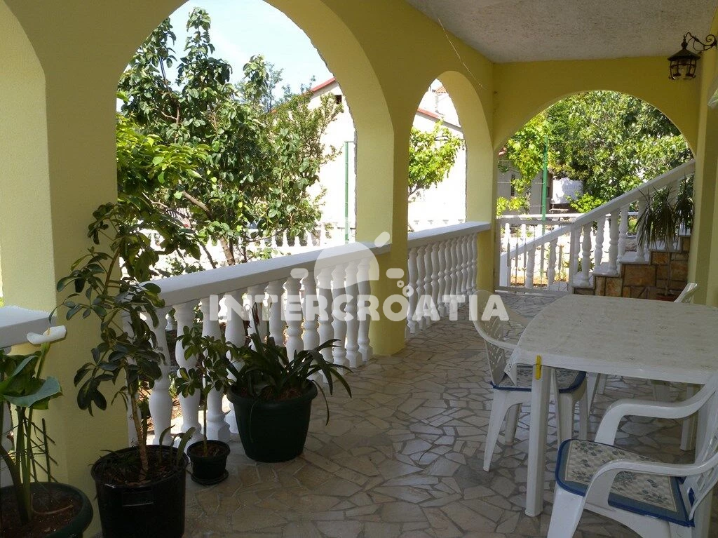 Apartmán (85 m2) s terasou a venkovním posezením se nachází v přízemí domu. Apartmán má 2 ložnice a je vhodný pro až 5 osob. Obývací pokoj je spojený s kuchyní. Kuchyňská linka je vybavena sporákem s troubou, mikrovlnnou troubou, rychlovarnou konvicí, kávovarem, nádobím a lednicí s mrazákem. Obývací pokoj s jídelním stolem, pohovkou, dvěma přistýlkami pro 2 osoby, televizí, klimatizací a vstupem na terasu. První ložnice s dvoulůžkem. Druhá ložnice s jedním jednolůžkem. Koupelna se sprchovým koutem, umyvadlem, pračkou, bidetem a wc. Hostům je k dispozici parkování u objektu zdarma.