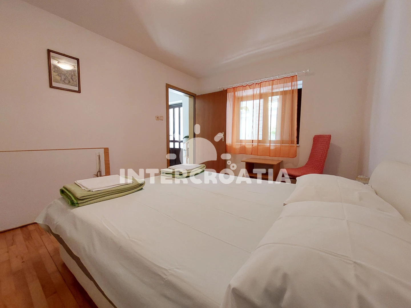 Apartmán se nachází 900 m od moře a pláže. Pláž je skalnatá, oblázková, větší kamení a betonové desky. U objektu je k dispozici společná zahrada s posezením a grilem. Parkování je před domem.