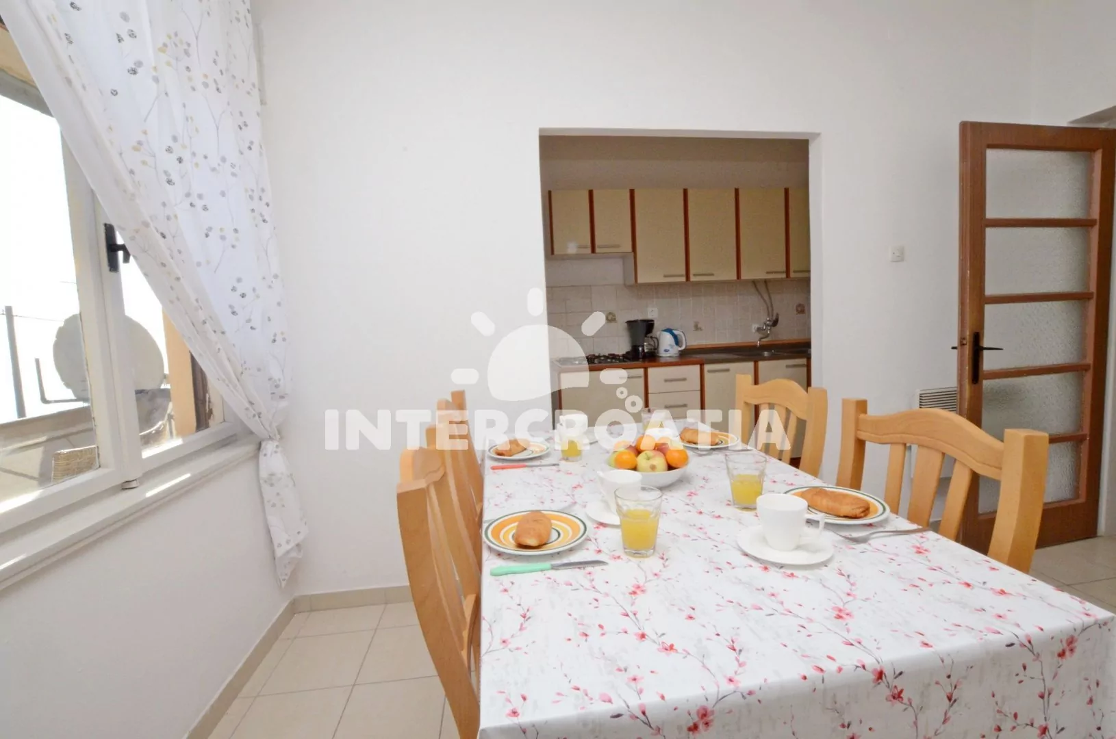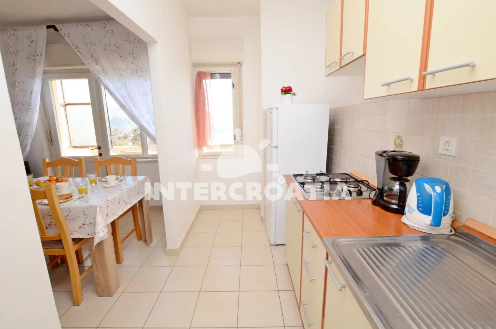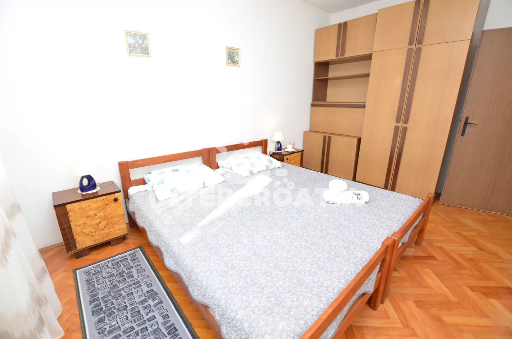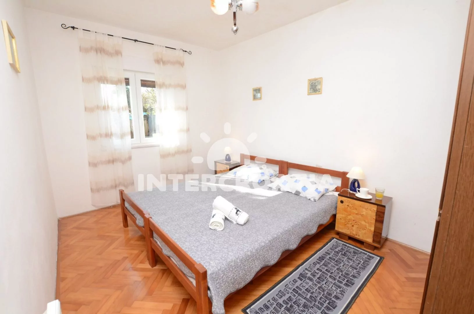 Apartmán v prvním patře domu s balkonem a výhledem na moře, pro 4 až 5 osob. Kuchyň je částečně oddělena od obývacího pokoje. Kuchyňský kout je vybaven nádobím, plynovým sporákem, rychlovarnou konvicí a lednicí s mrazákem. Obývací pokoj s rozložitelnou pohovkou (extra lůžko pro 5. osobu), jídelním stolem, televizí se satelitním programem a vstupem na balkon. První ložnice s jedním manželským dvoulůžkem. Druhá ložnice s dvěma jednolůžky. Koupelna s vanou, sprchou, pračkou, umyvadlem a wc. K dispozici: WiFi, balkon s posezením a výhledem na moře. Fén a žehlička (služba na požádání).
