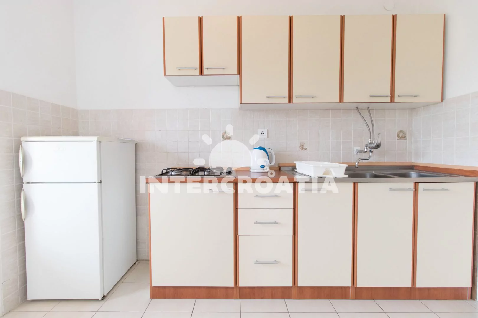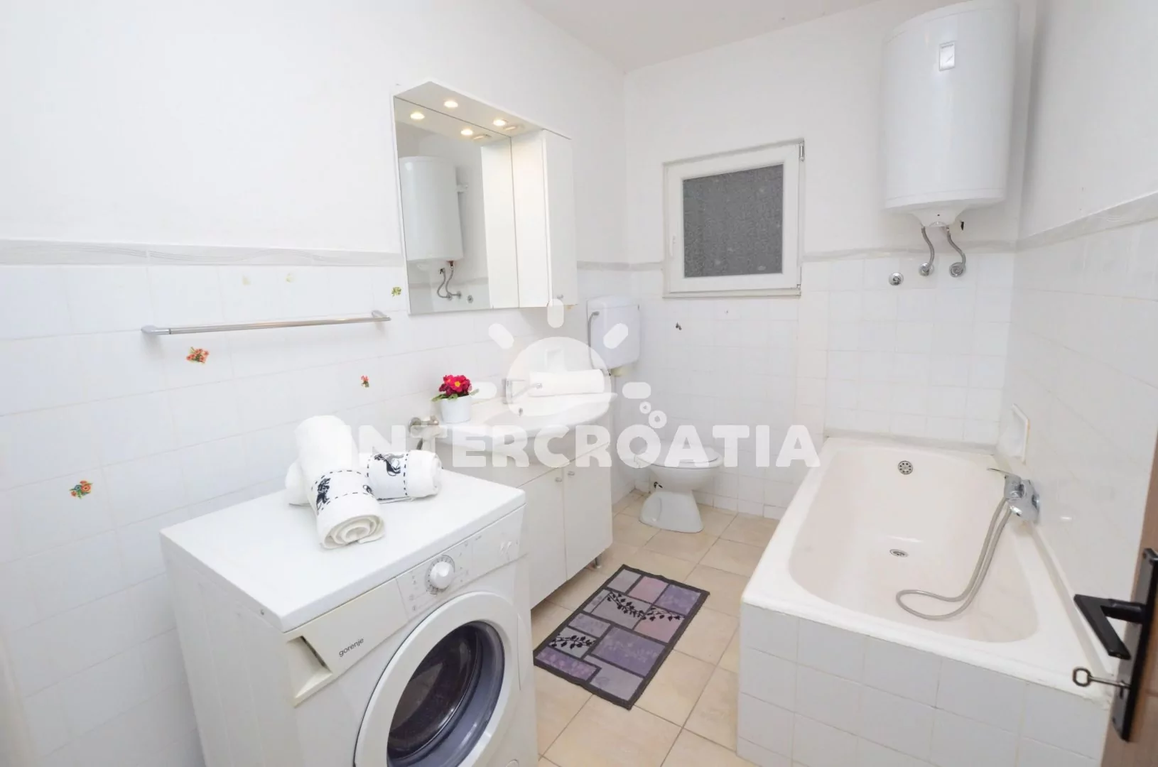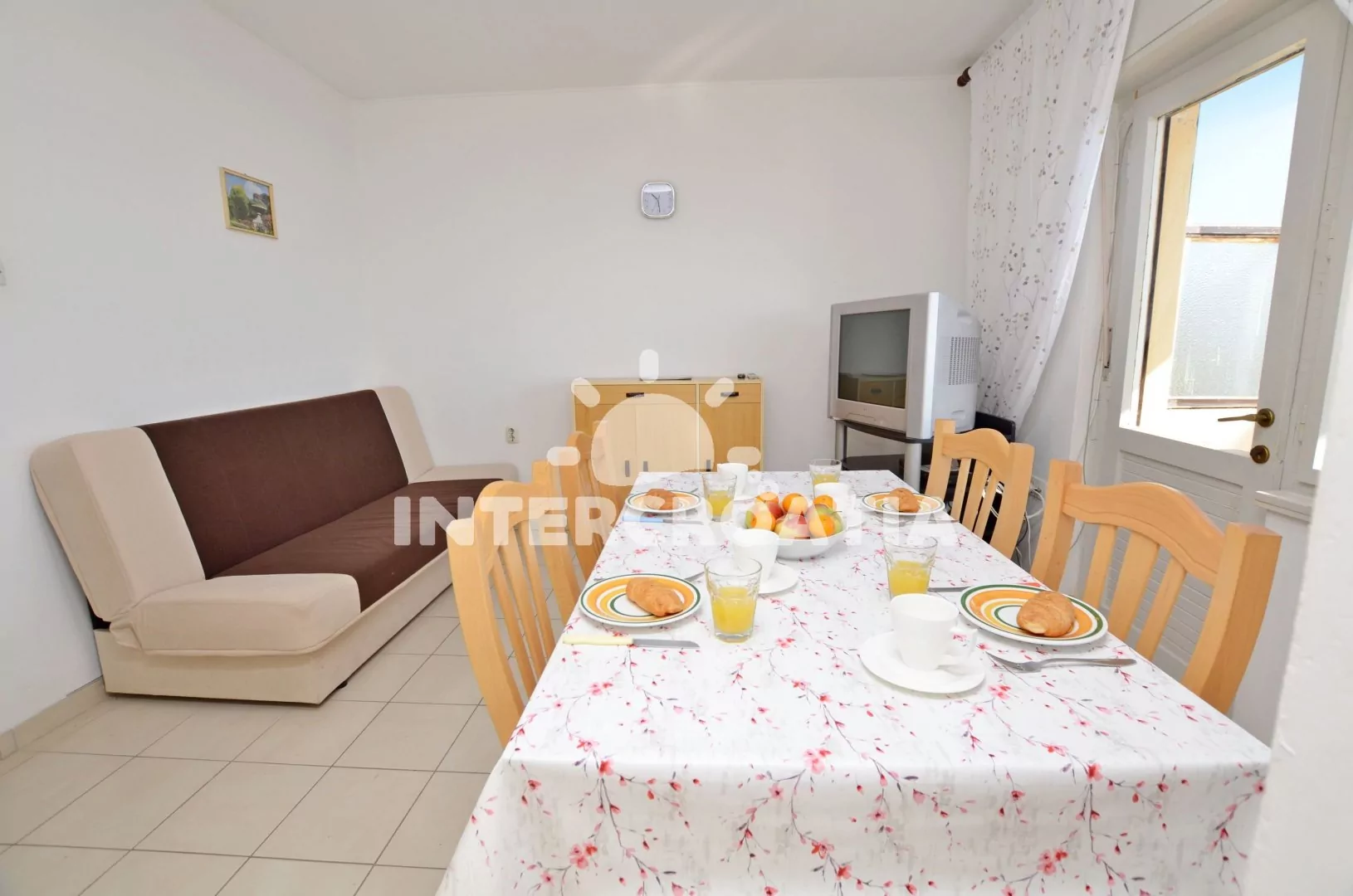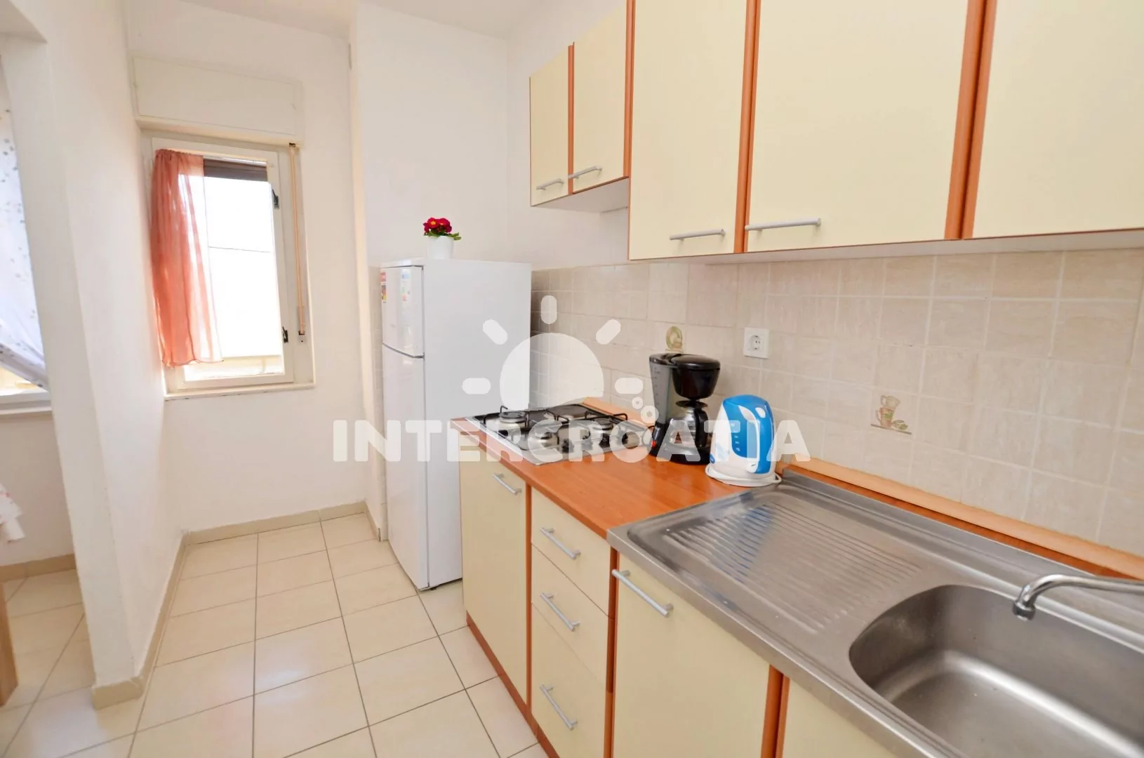 Apartmán v prvním patře domu s balkonem a výhledem na moře, pro 4 až 5 osob. Kuchyň je částečně oddělena od obývacího pokoje. Kuchyňský kout je vybaven nádobím, plynovým sporákem, rychlovarnou konvicí a lednicí s mrazákem. Obývací pokoj s rozložitelnou pohovkou (extra lůžko pro 5. osobu), jídelním stolem, televizí se satelitním programem a vstupem na balkon. První ložnice s jedním manželským dvoulůžkem. Druhá ložnice s dvěma jednolůžky. Koupelna s vanou, sprchou, pračkou, umyvadlem a wc. K dispozici: WiFi, balkon s posezením a výhledem na moře. Fén a žehlička (služba na požádání).