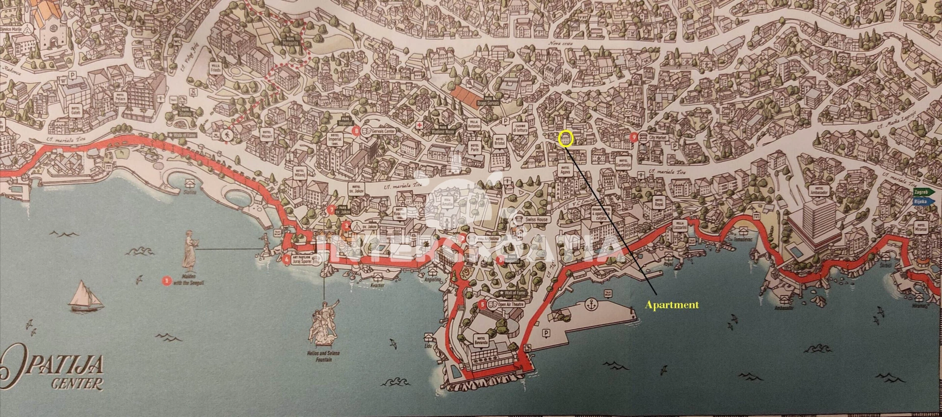 Vzdálenosti: Moře 100 m, pláž 150 m (písčitá a betonové desky), centrum 5 m, supermarket 30 m, banka 50 m, veřejná doprava 50 m, restaurace 50 m, lékárna 50 m, bar 50 m, směnárna 50 m, pošta 50 m, tenisové kurty 100 m, ambulance 100 m, čerpací stanice 150 m, půjčovna motorových člunů 150 m, muzeum 500 m, diskotéka 500 m, marina 500 m, potápění 1,5 km, trajekt (Rijeka) 15 km, letiště (Rijeka) 40 km,