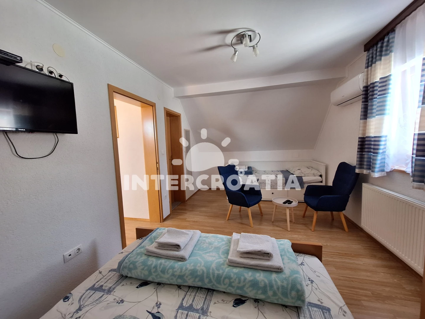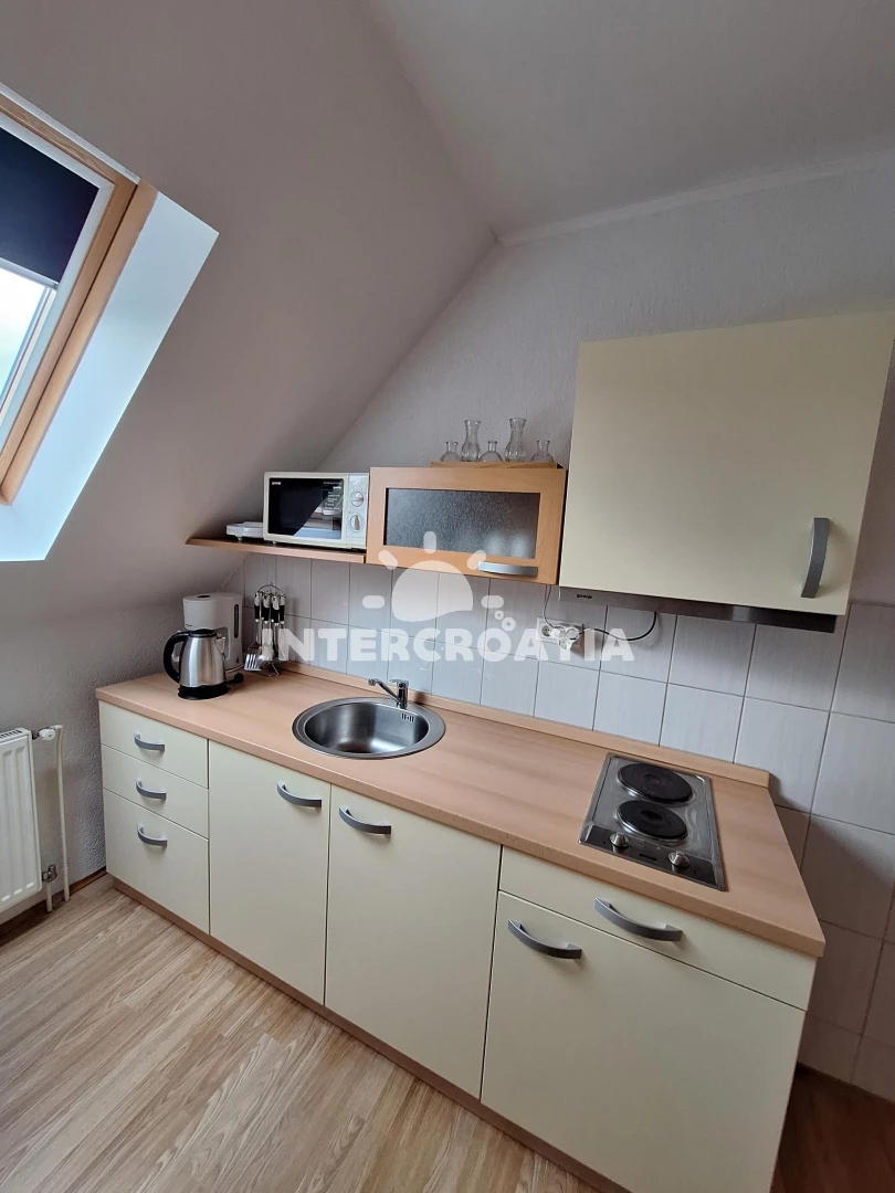 Apartmán (30 m2) typu studio. Nachází se v 1. patře objektu. Kuchyňská linka je vybavena varnou deskou, kávovarem, toustovačem, mikrovlnnou troubou, rychlovarnou konvicí, nádobím, lednicí, mini…
