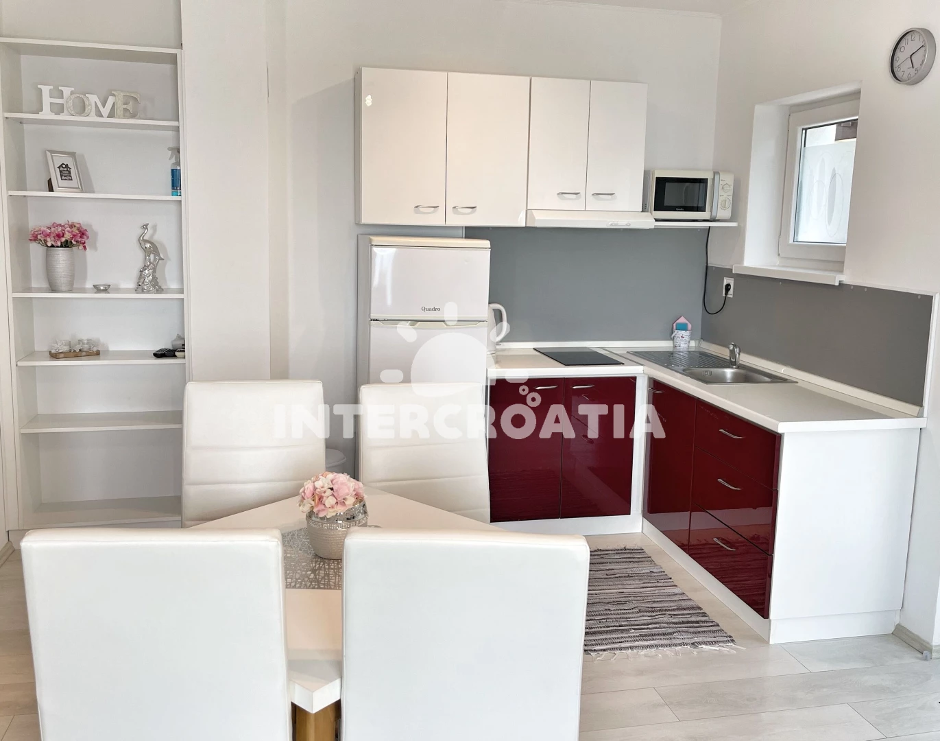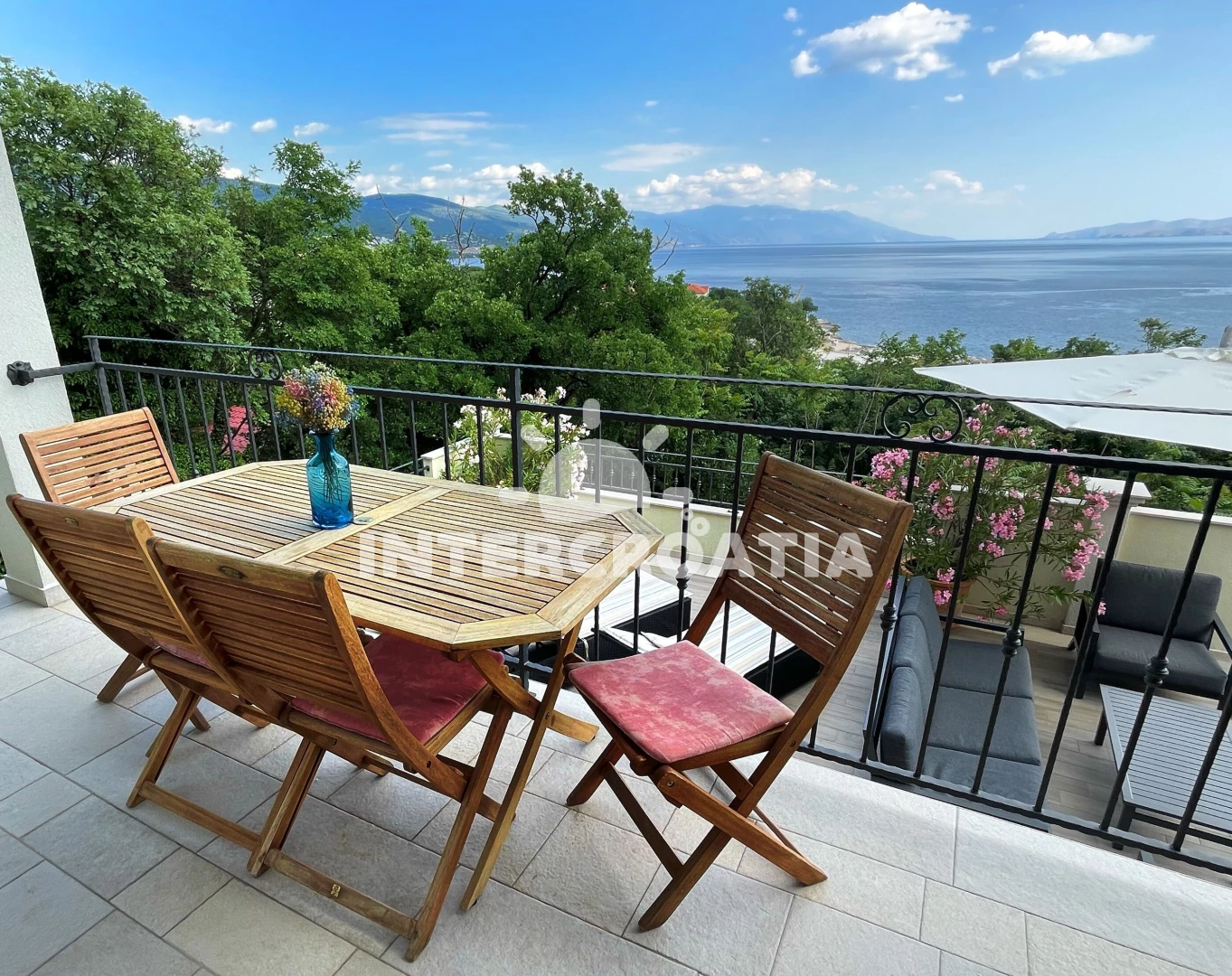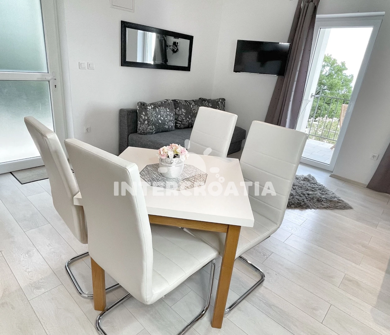 Apartmán (36 m2) typu studio s terasou, posezením a výhledem na moře. Obývací místnost je spojena s kuchyní. Kuchyňská linka je vybavena dvouplotýnkovým vařičem, digestoří, mikrovlnnou troubou, rychlovarnou konvicí, nádobím a lednicí s mrazákem. Obývací místnost s jídelním stolem, pohovkou, televizí, dvoulůžkem, klimatizací a vstupem na terasu. Koupelna se sprchovým koutem, umyvadlem a wc. Hostům je k dispozici parkování u objektu zdarma.