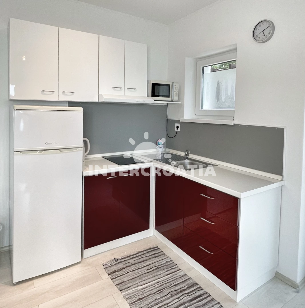 Apartmán (36 m2) typu studio s terasou, posezením a výhledem na moře. Obývací místnost je spojena s kuchyní. Kuchyňská linka je vybavena dvouplotýnkovým vařičem, digestoří, mikrovlnnou troubou,…