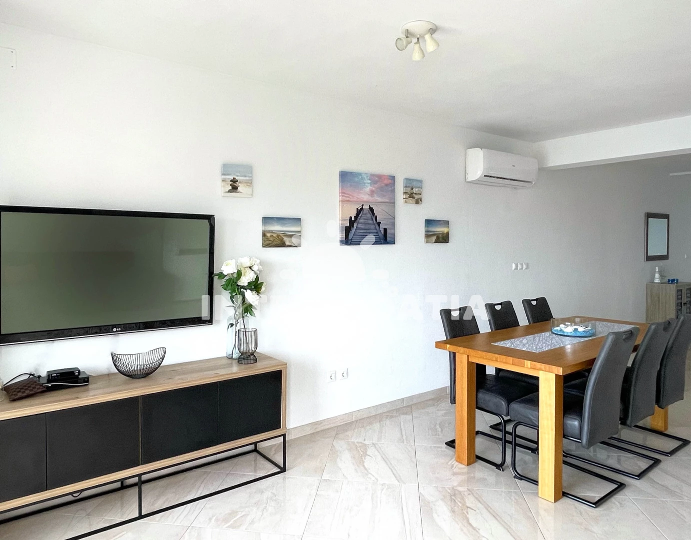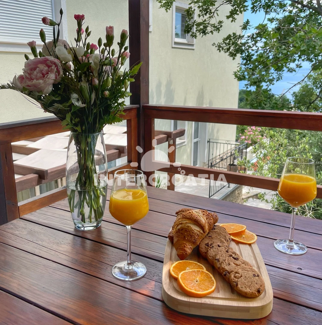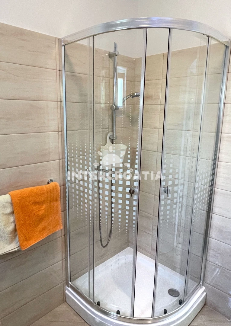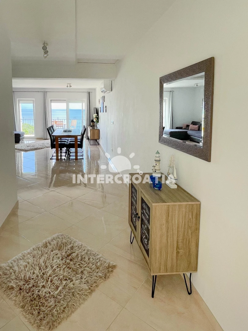 Nádherný apartmán (70 m2) s terasou, posezením a výhledem na moře. Obývací pokoj je spojený s kuchyní. Kuchyňská linka je vybavena sklokeramickou varnou deskou, digestoří, vestavěnou troubou, myčkou na nádobí, mikrovlnnou troubou, rychlovarnou konvicí, kávovarem, nádobím a lednicí s mrazákem. Obývací pokoj s jídelním stolem, pohovkou, televizí, klimatizací a vstupem na terasu. Ložnice s dvoulůžkem. Koupelna se sprchovým koutem, umyvadlem, pračkou a wc. Hostům je k dispozici parkování u objektu zdarma.