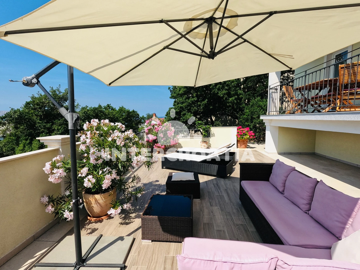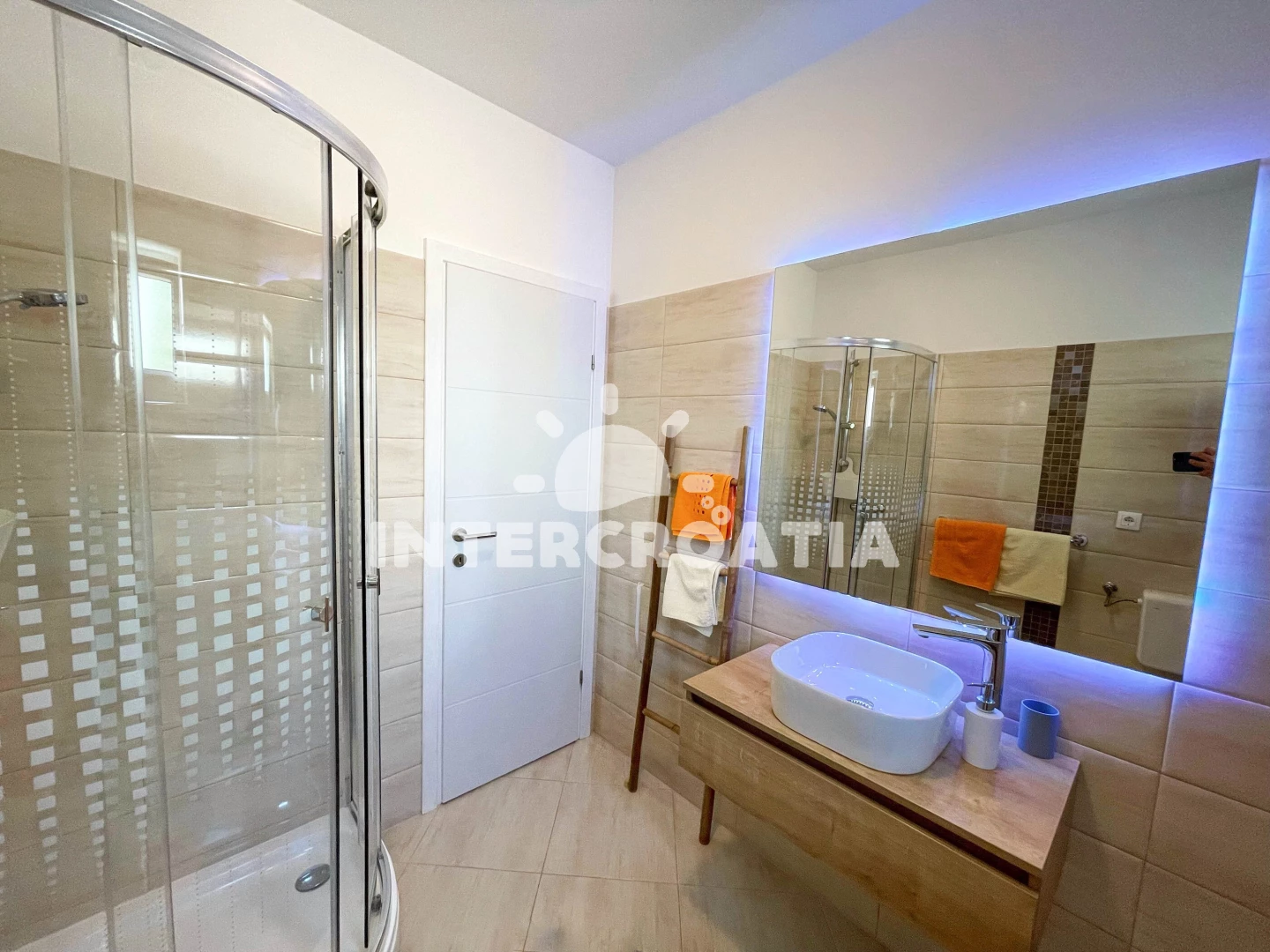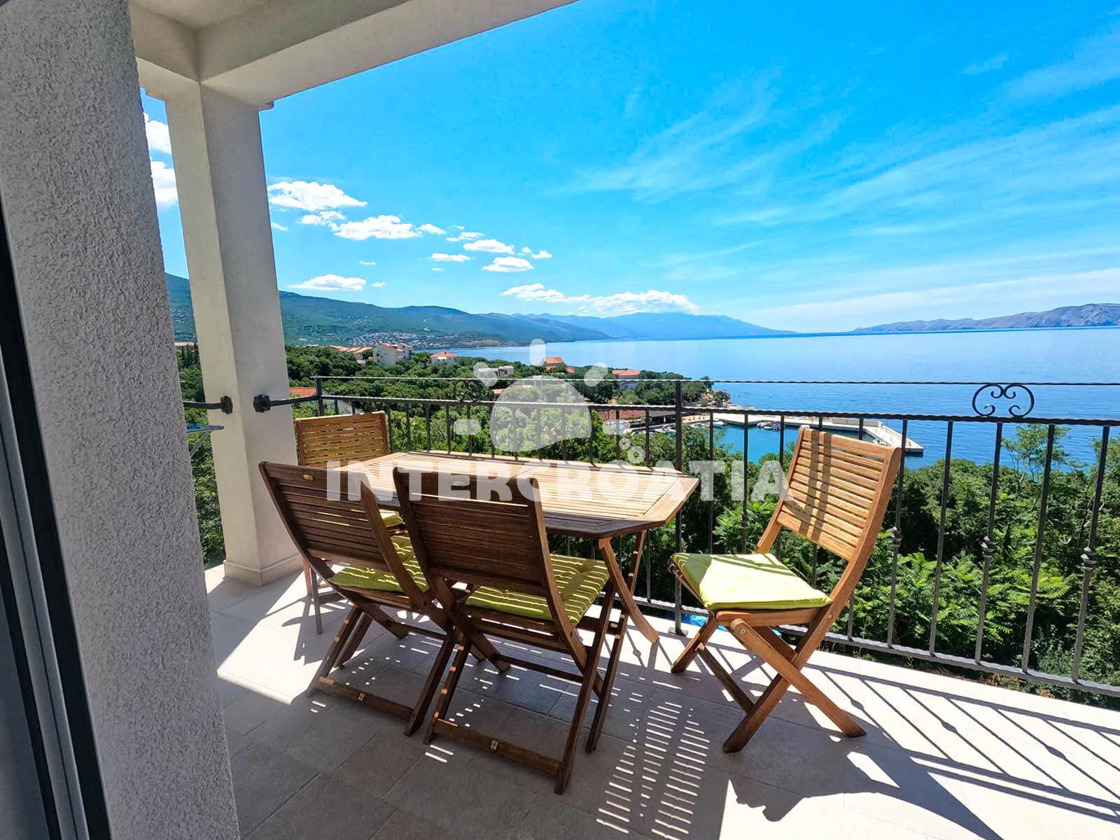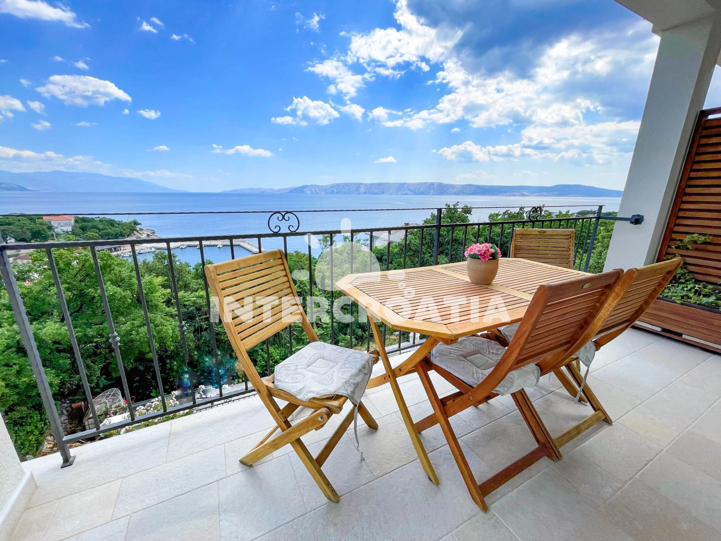 Nádherný apartmán (70 m2) s terasou, posezením a výhledem na moře. Obývací pokoj je spojený s kuchyní. Kuchyňská linka je vybavena sklokeramickou varnou deskou, digestoří, vestavěnou troubou, myčkou na nádobí, mikrovlnnou troubou, rychlovarnou konvicí, kávovarem, nádobím a lednicí s mrazákem. Obývací pokoj s jídelním stolem, pohovkou, televizí, klimatizací a vstupem na terasu. Ložnice s dvoulůžkem. Koupelna se sprchovým koutem, umyvadlem, pračkou a wc. Hostům je k dispozici parkování u objektu zdarma.