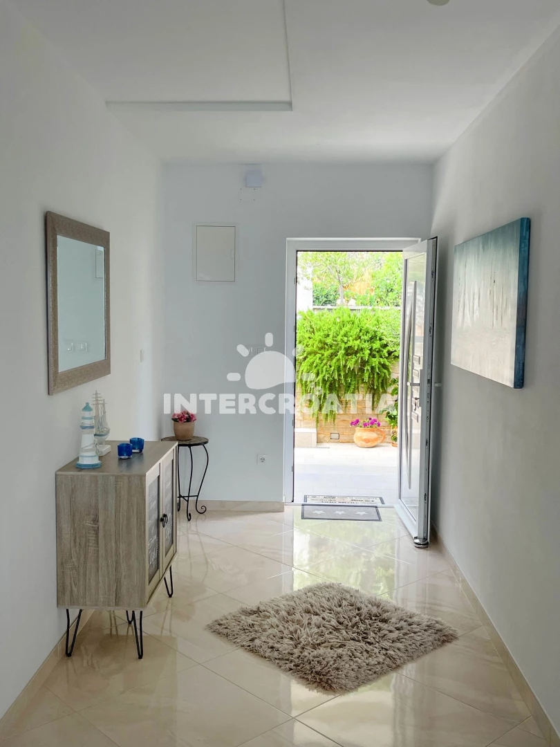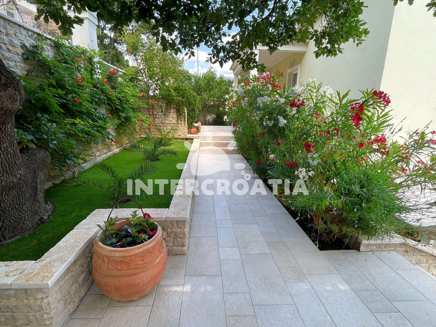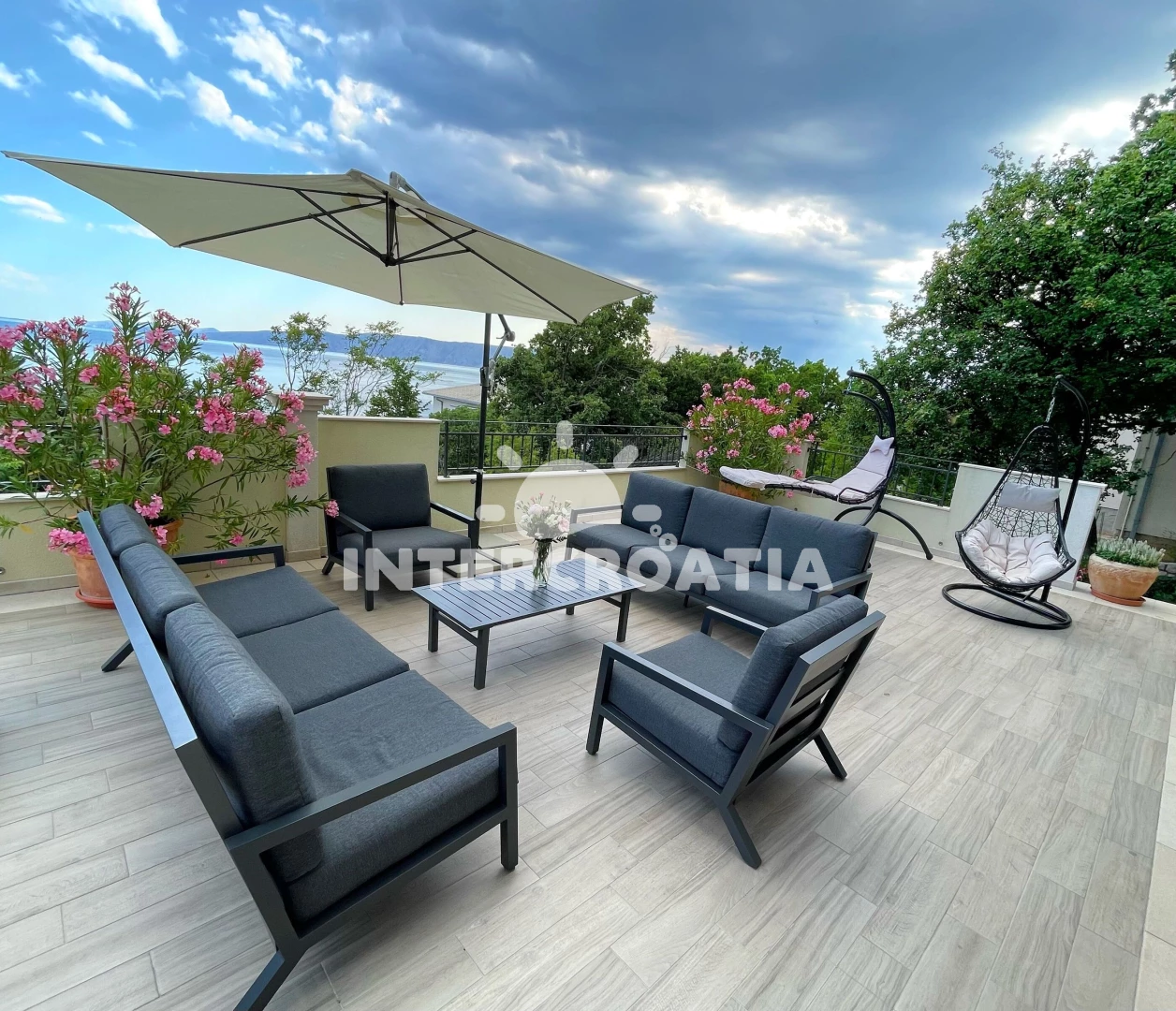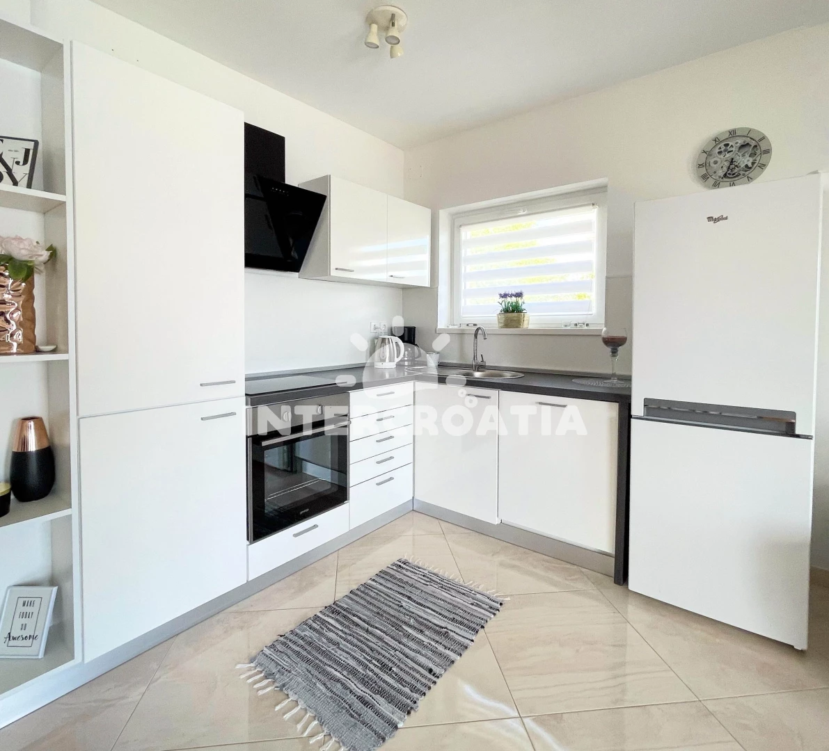 Nádherný apartmán (70 m2) s terasou, posezením a výhledem na moře. Obývací pokoj je spojený s kuchyní. Kuchyňská linka je vybavena sklokeramickou varnou deskou, digestoří, vestavěnou troubou, myčkou na nádobí, mikrovlnnou troubou, rychlovarnou konvicí, kávovarem, nádobím a lednicí s mrazákem. Obývací pokoj s jídelním stolem, pohovkou, televizí, klimatizací a vstupem na terasu. Ložnice s dvoulůžkem. Koupelna se sprchovým koutem, umyvadlem, pračkou a wc. Hostům je k dispozici parkování u objektu zdarma.