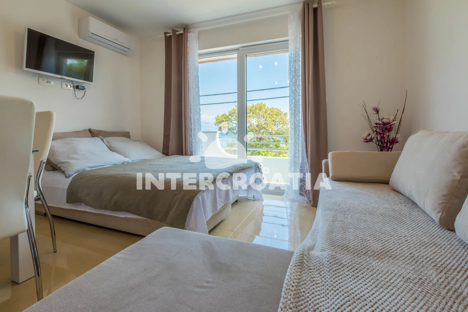 Apartmán (40 m2) s terasou, s balkonem, a výhledem na moře. Nachází se v 1. patře objektu. Apartmán má 1 ložnici a je vhodný pro až 2 osoby. Kuchyňská linka je vybavena varnou deskou, toustovačem, kávovarem, troubou, mikrovlnnou troubou, rychlovarnou konvicí, nádobím, lednicí, mrazákem. K dispozici televize se satelitním programem, žehlička. Koupelna se sprchovým koutem, umyvadlem, fénem a WC.