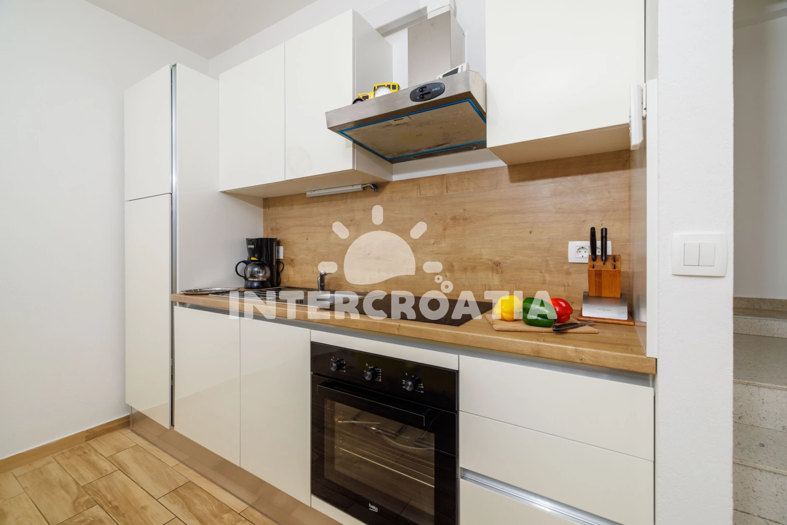 Apartmán (80 m2) s terasou, a výhledem na moře. Nachází se v přízemí objektu. Apartmán má 2 ložnice a je vhodný pro až 6 osob. Kuchyňská linka je vybavena varnou deskou, troubou, kávovarem,…