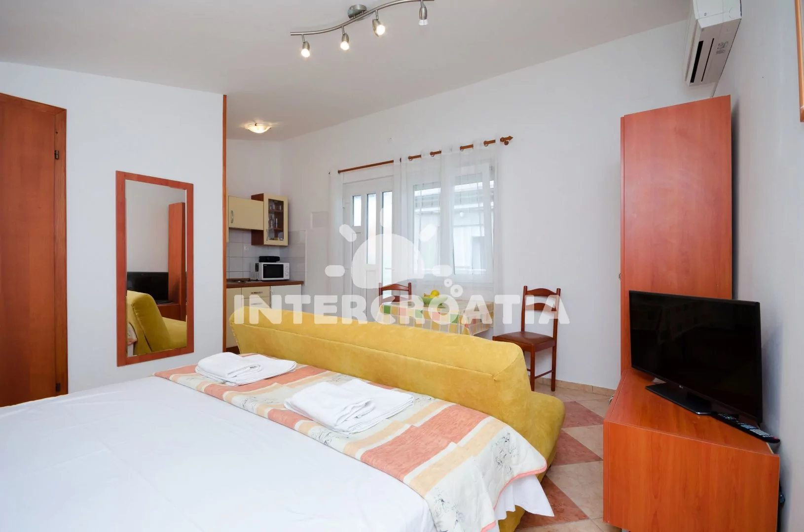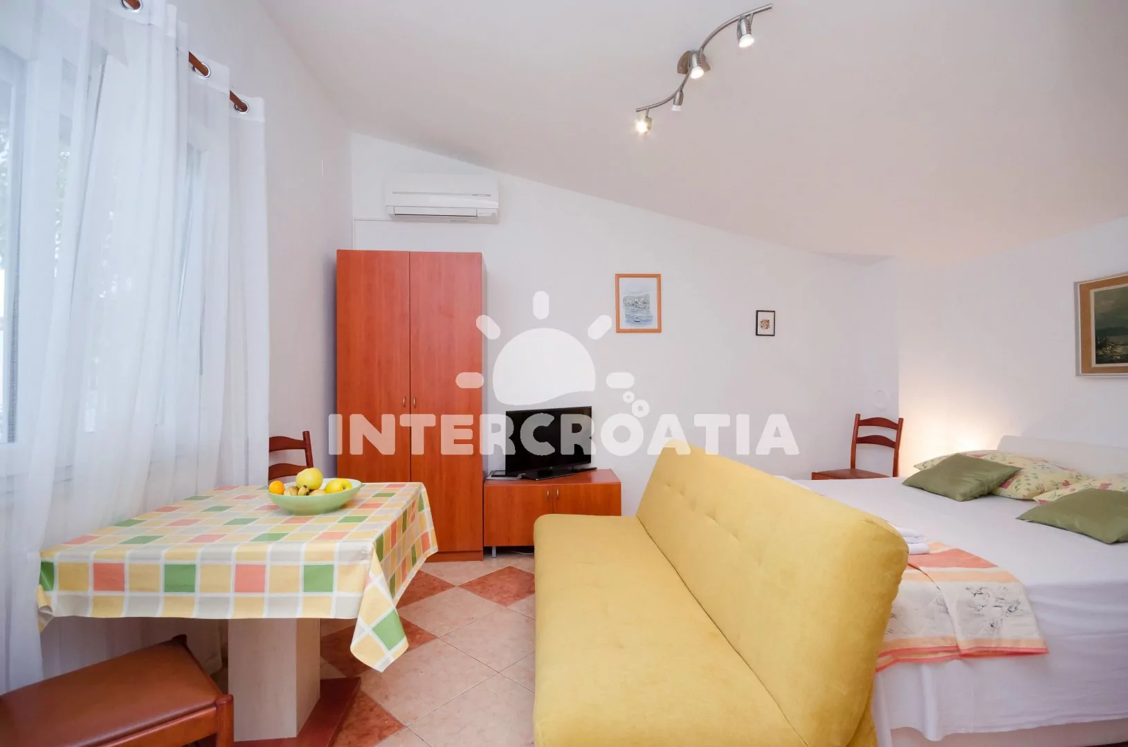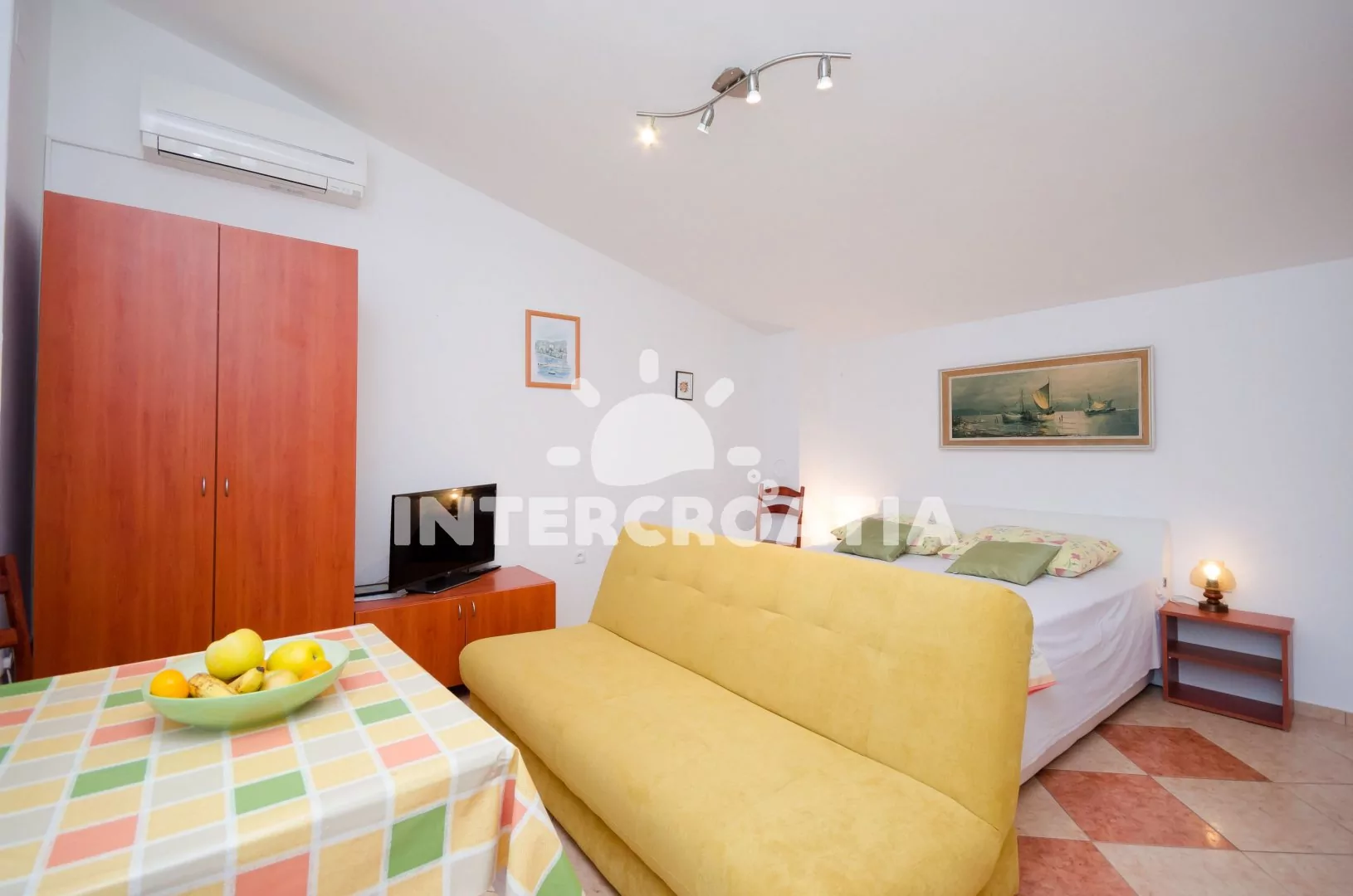 Apartmán typu studio se nachází v prvním patře domu a je vhodný pro 2 až 3 osoby. Obývací pokoj je spojený s kuchyní. Kuchyňská linka s elektrickým dvouplotýnkovým sporákem, mikrovlnnou troubou, rychlovarnou konvicí, kávovarem, nádobím a lednicí s mrazákem. Obývací pokoj s jídelním stolem pro 3 osoby, televizí se satelitním programem, klimatizací, jedním dvoulůžkem a rozkládací pohovkou (extra lůžko pro 1 osobu). Koupelna se sprchovým koutem, umyvadlem a wc. Hostům je k dispozici balkon s posezením a parkování u objektu zdarma.