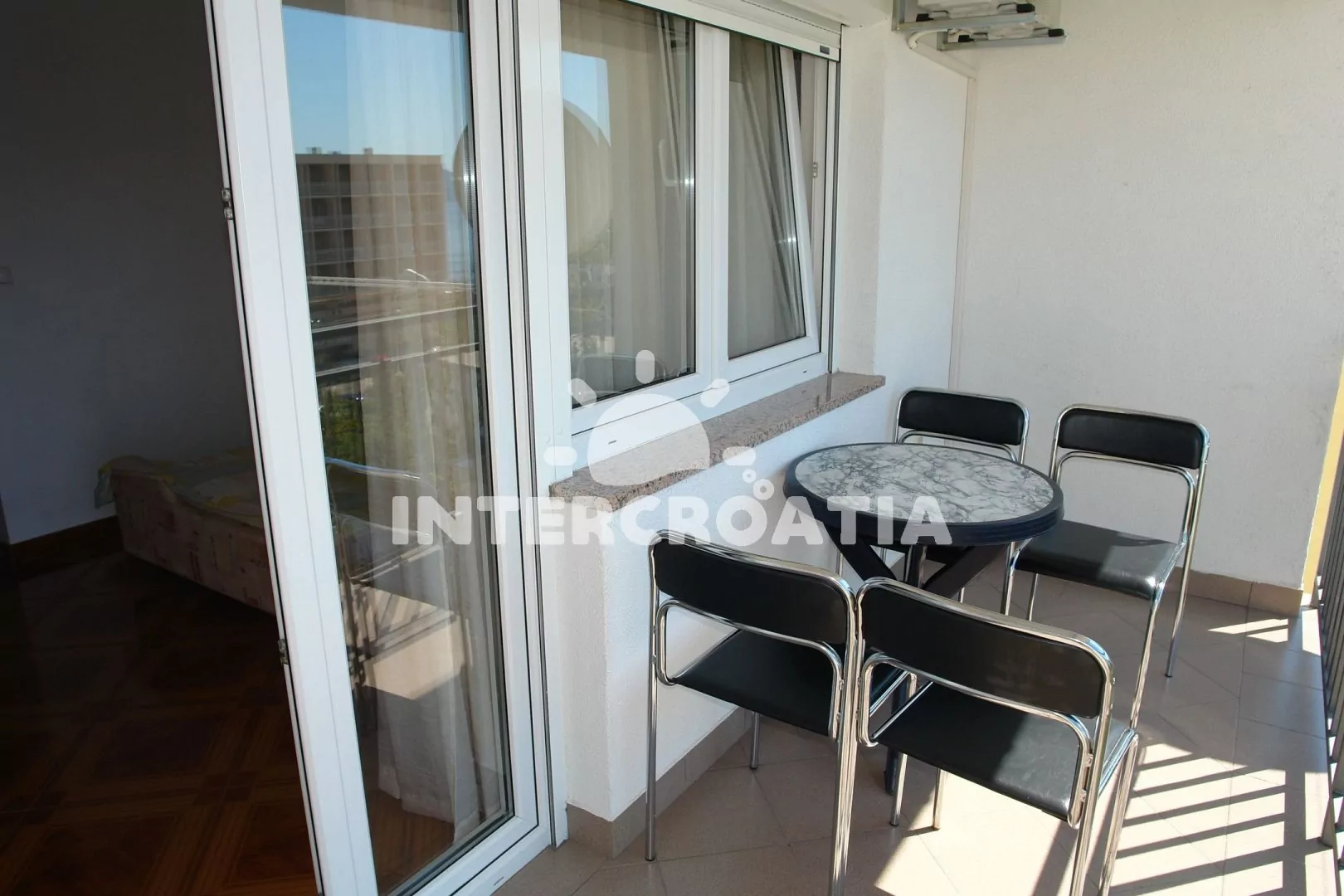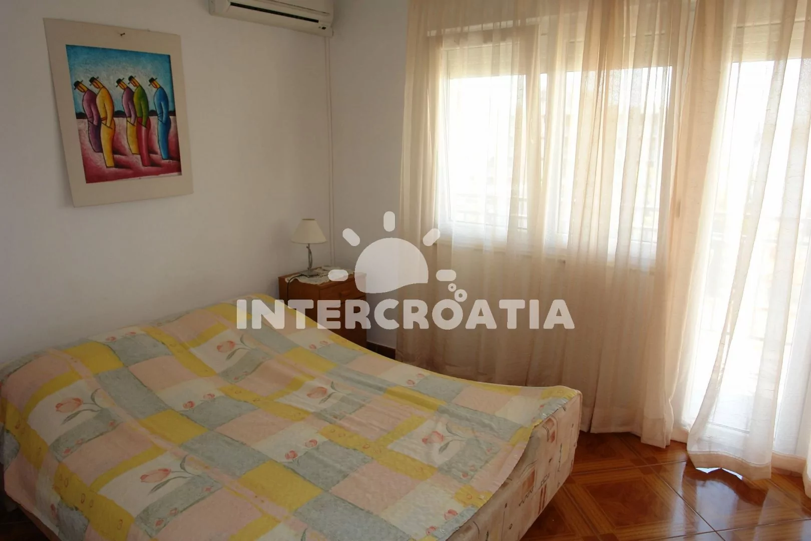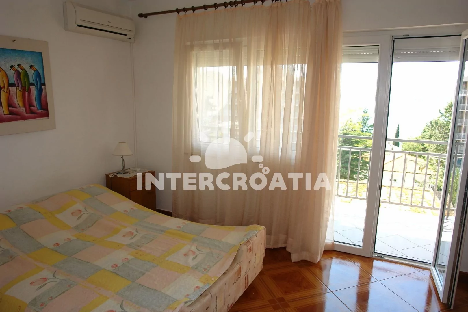 Apartmán s lodžií a výhledem na moře se nachází v druhém patře domu. Vstup: kuchyň s jídelním stolem pro 4 osoby, televizí se satelitním programem, kuchyňskou linkou s dvouplotýnkovým sporákem, kávovarem, nádobím a lednicí. První ložnice s dvoulůžkem, pohovkou (rozložitelná na extra lůžko pro 1 osobu), klimatizací a vstupem na balkon. Druhá ložnice s dvěma jednolůžky. Koupelna se sprchovým koutem, umyvadlem a wc. Hostům je k dispozici parkování u objektu zdarma.