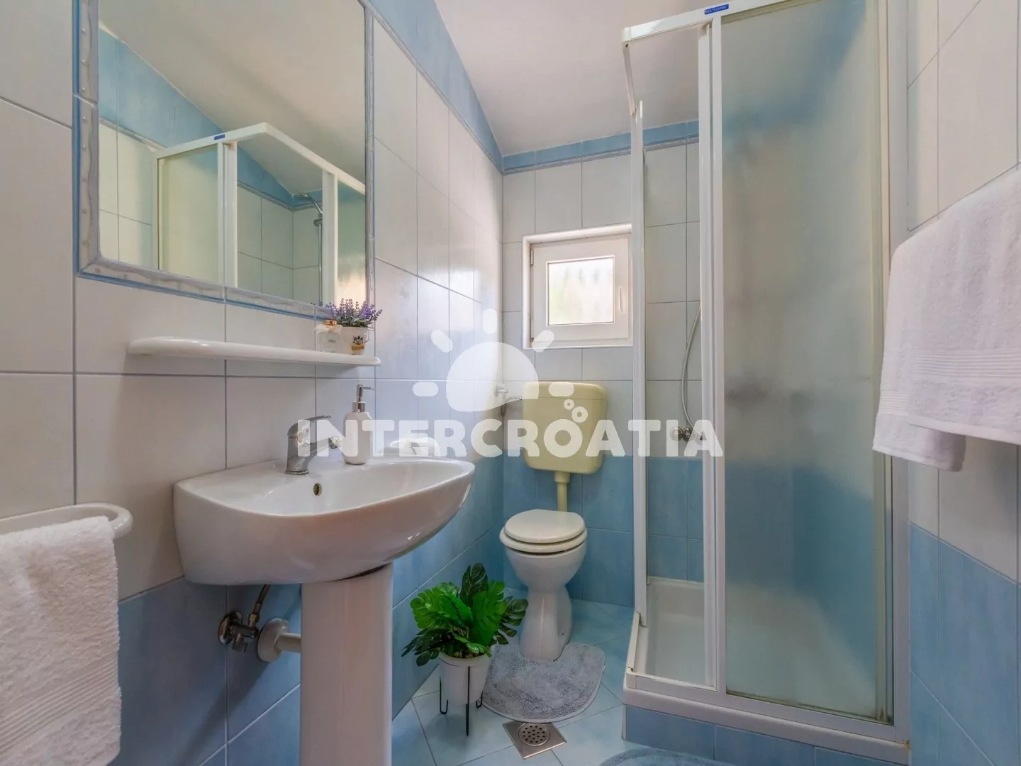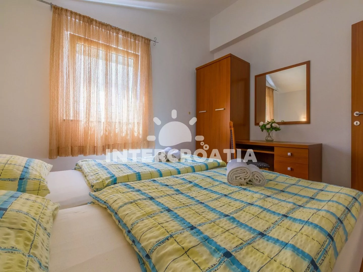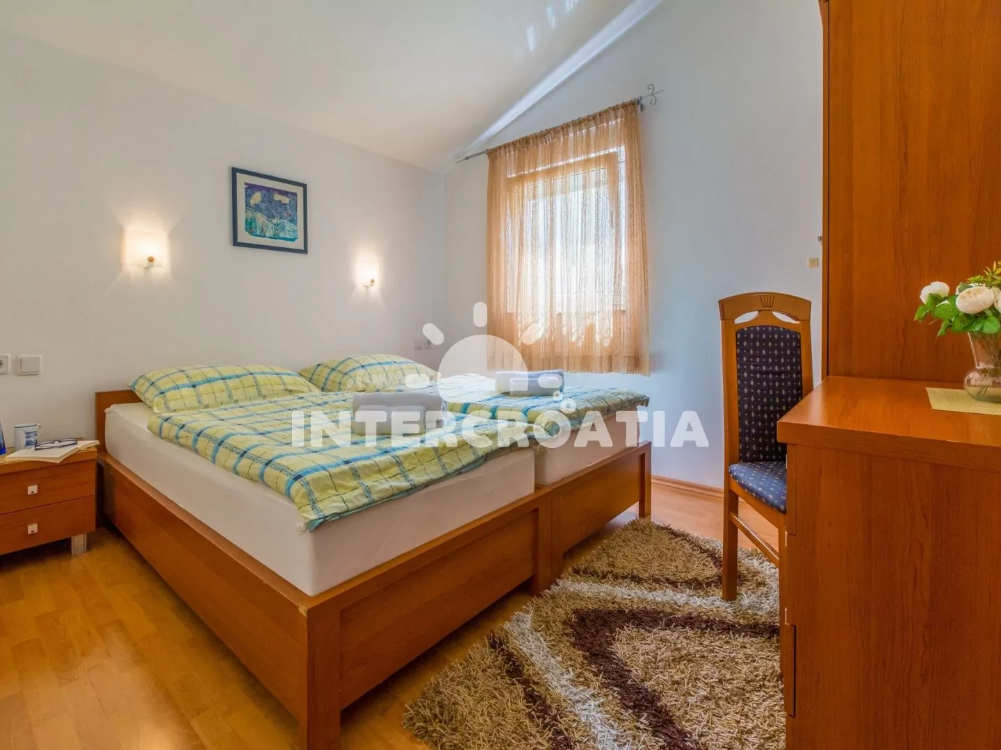 Apartmán s výhledem na moře a vlastní terasou se nachází v třetím patře domu. Obývací pokoj je spojený s kuchyní. Kuchyňská linka je vybavena varnou deskou, mikrovlnnou troubou, myčkou na nádobí, rychlovarnou konvicí, kávovarem, toustovačem, nádobím a lednicí s mrazákem. Obývací pokoj s jídelním stolem pro 3 osoby, pohovkou (rozložitelná na extra lůžko pro 2 osoby), televizí se satelitním programem, klimatizací a vstupem na terasu. Ložnice s dvoulůžkem. Koupelna se sprchovým koutem, umyvadlem, fénem, pračkou a wc. Hostům je k dispozici parkování u objektu zdarma.