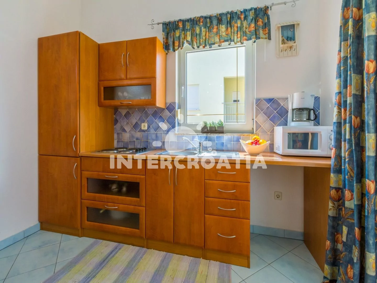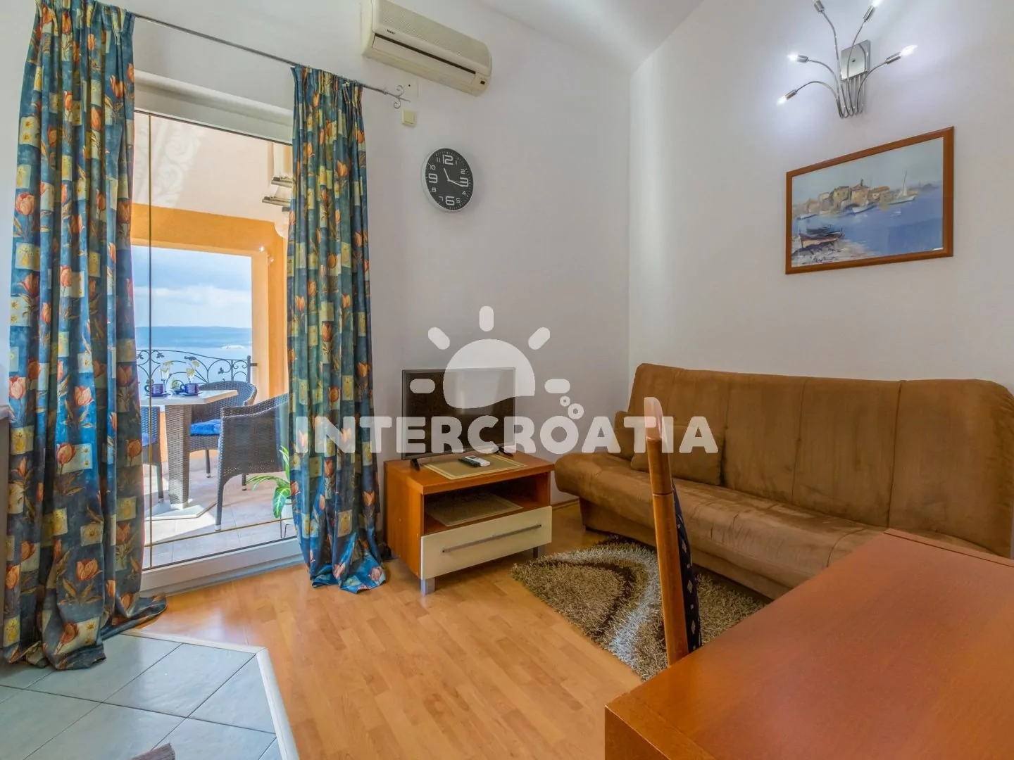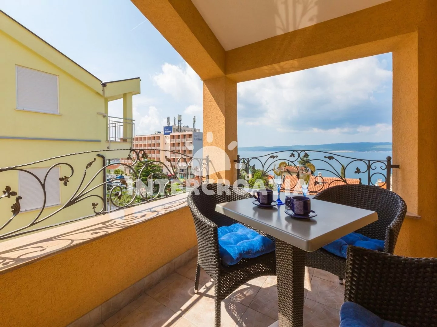Apartmán s výhledem na moře a vlastní terasou se nachází v třetím patře domu. Obývací pokoj je spojený s kuchyní. Kuchyňská linka je vybavena varnou deskou, mikrovlnnou troubou, myčkou na nádobí,…