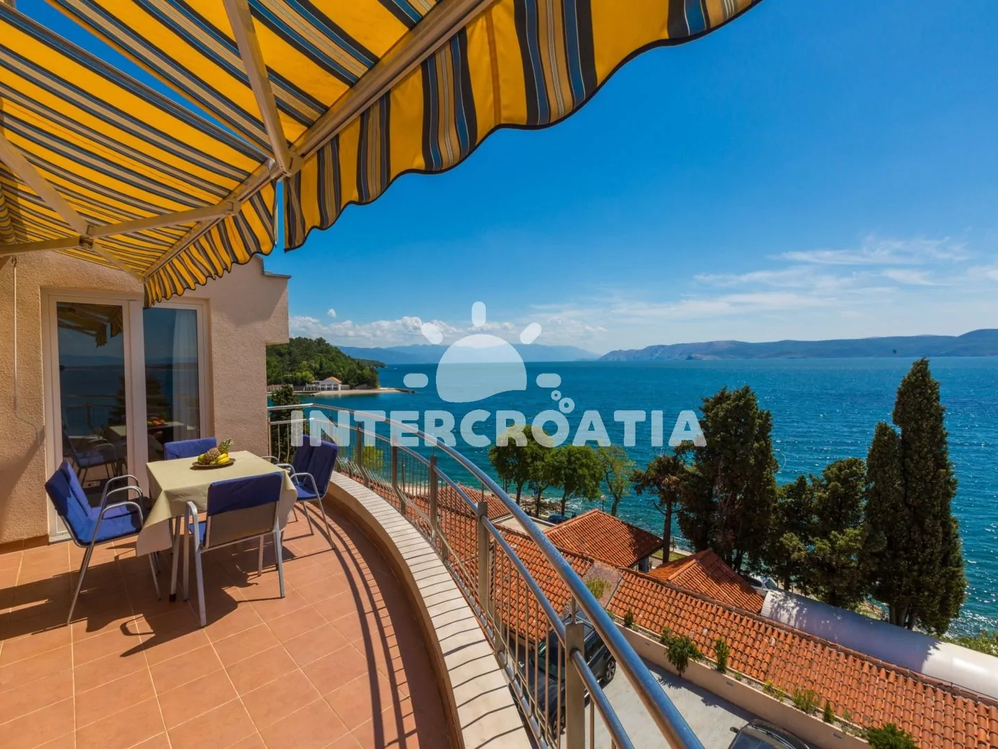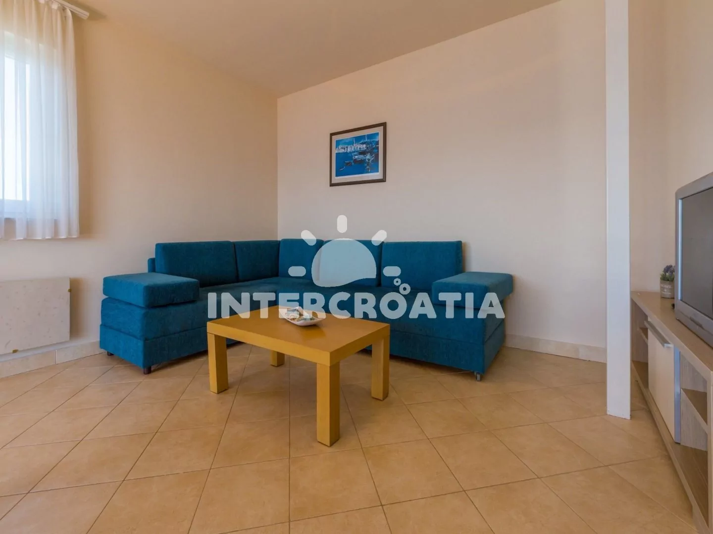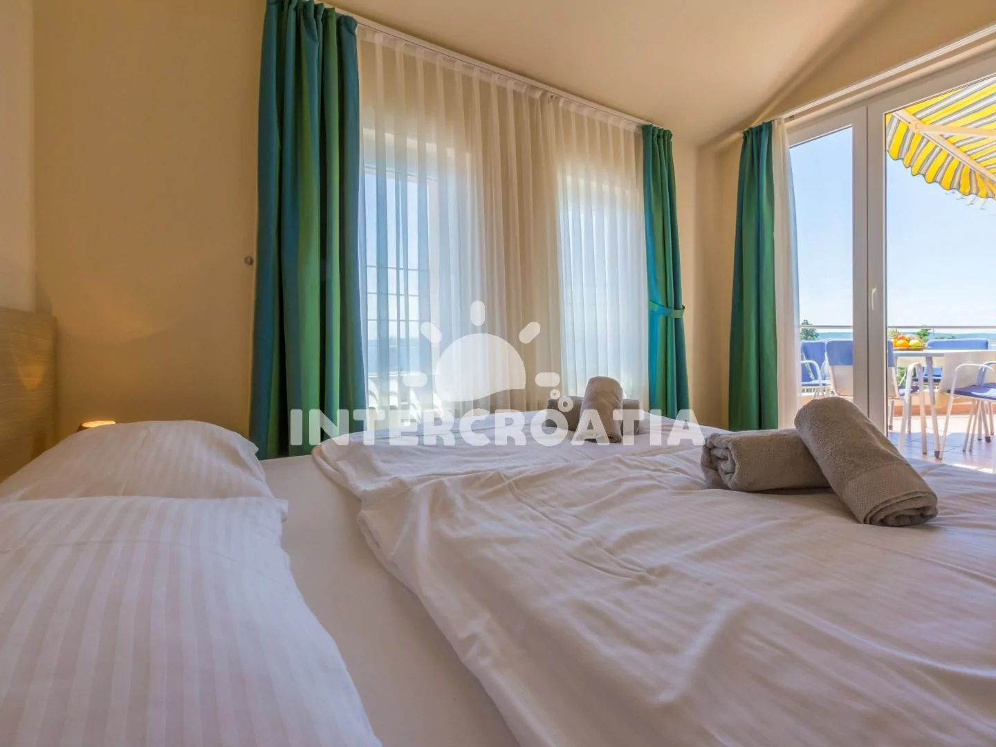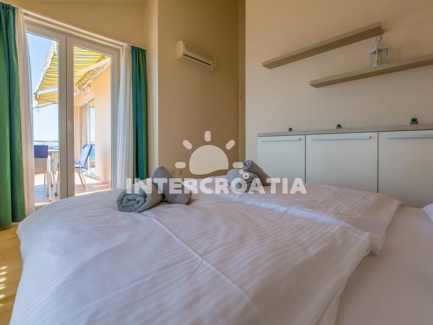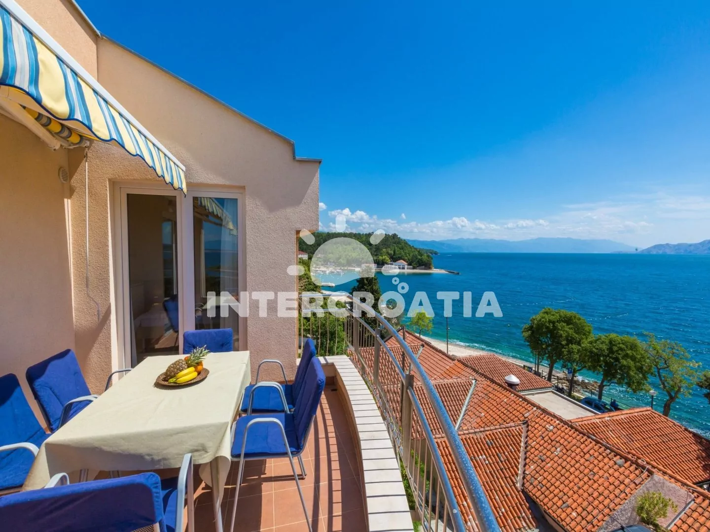 Apartmán (65 m2) s terasou a výhledem na moře, se nachází v 3. patře domu. Apartmán má 3 pokoje a je vhodný pro 4 až 6 osob. Obývací pokoj je spojený s kuchyní. Kuchyňská linka je vybavena sklokeramickou varnou deskou, digestoří, vestavěnou troubou, rychlovarnou konvicí, kávovarem, toustovačem, nádobím a lednicí s mrazákem. Obývací pokoj s jídelním stolem pro 5 osob, rohovou pohovkou (rozložitelná na extra lůžko pro 2 osoby), televizí se satelitním programem, klimatizací a vstupem na terasu. První ložnice s dvoulůžkem, klimatizací a vstupem na terasu. Druhá ložnice s dvěma jednolůžky (patrová postel). Koupelna se sprchovým koutem, umyvadlem, fénem a wc. Hostům je k dispozici parkování u objektu zdarma.