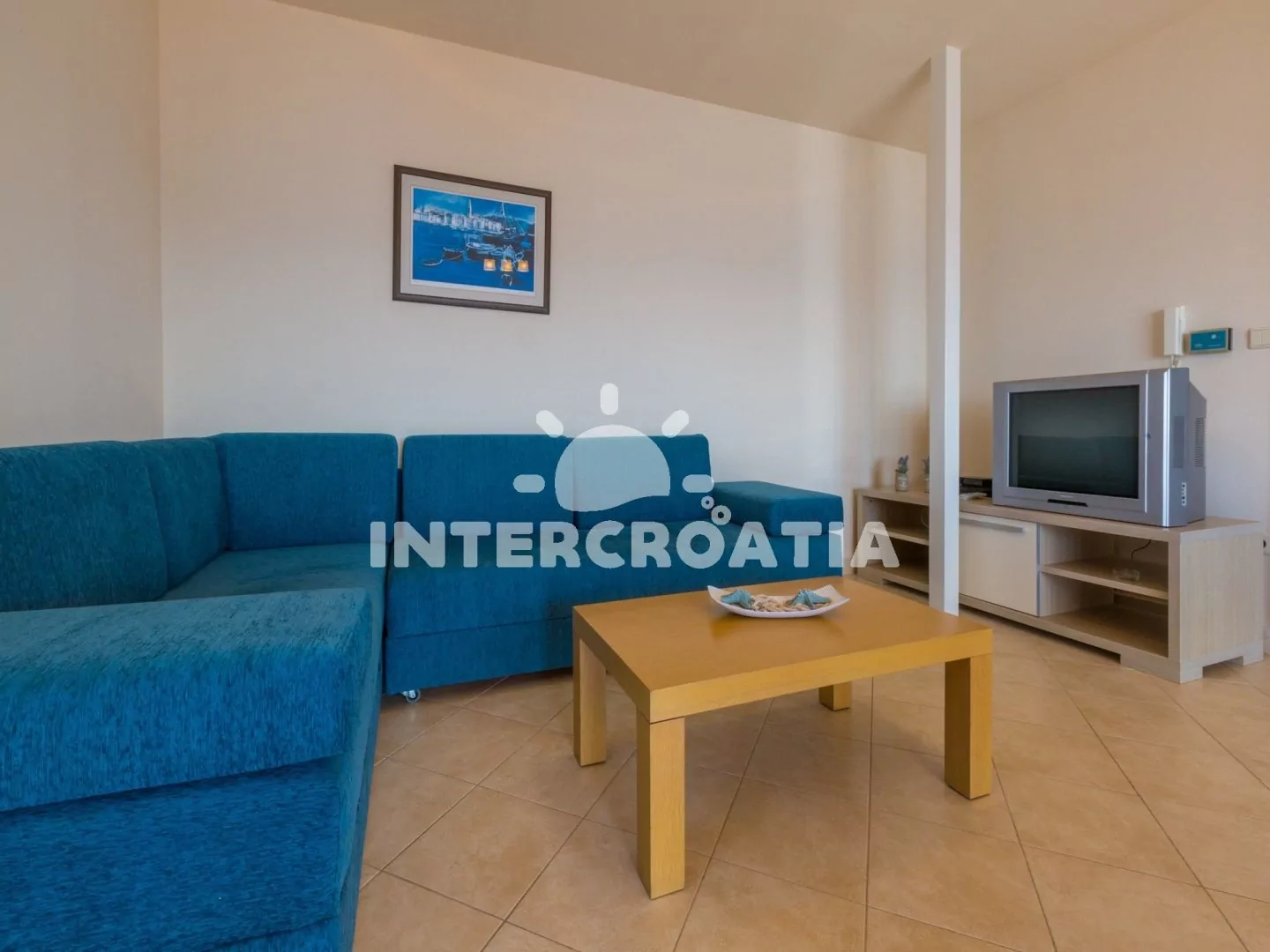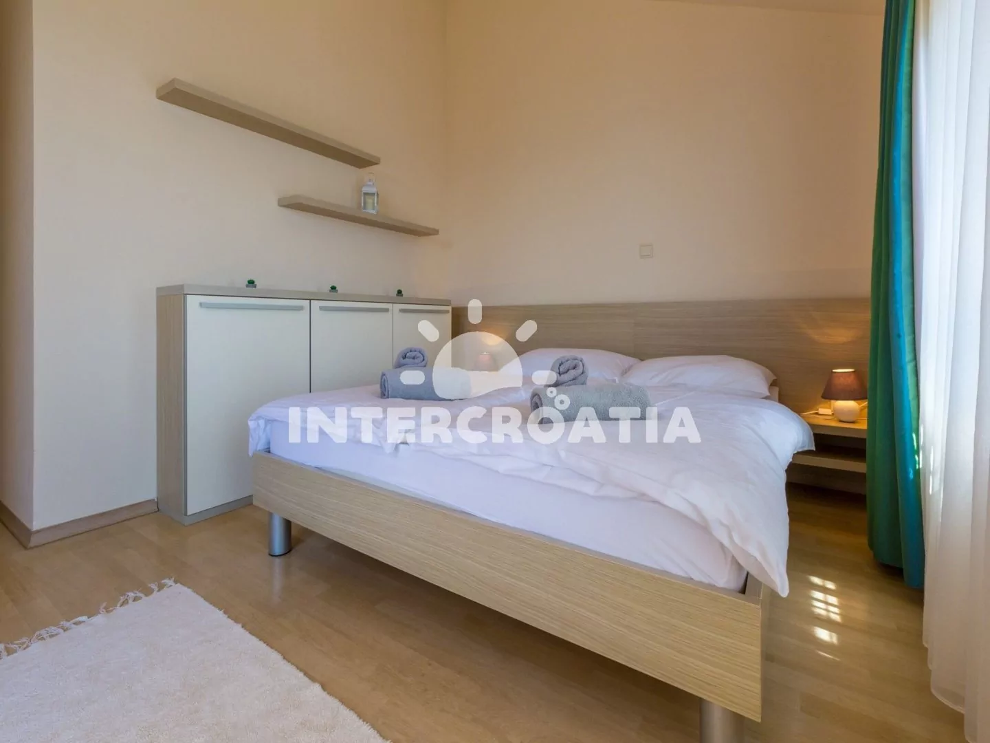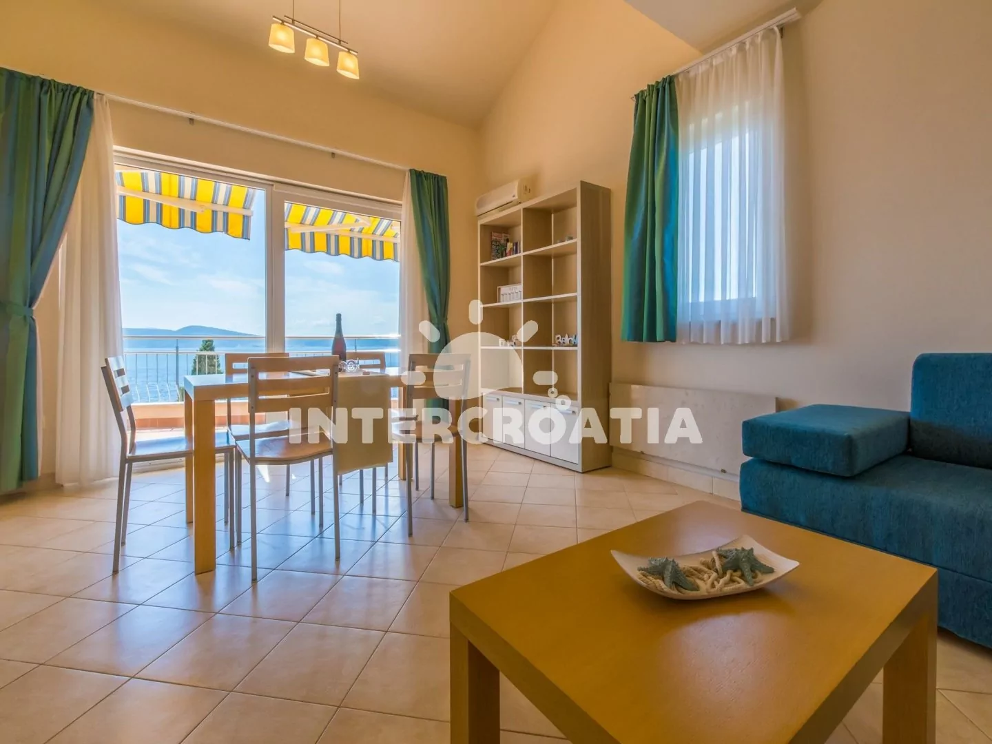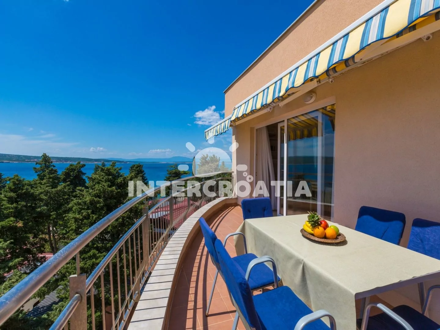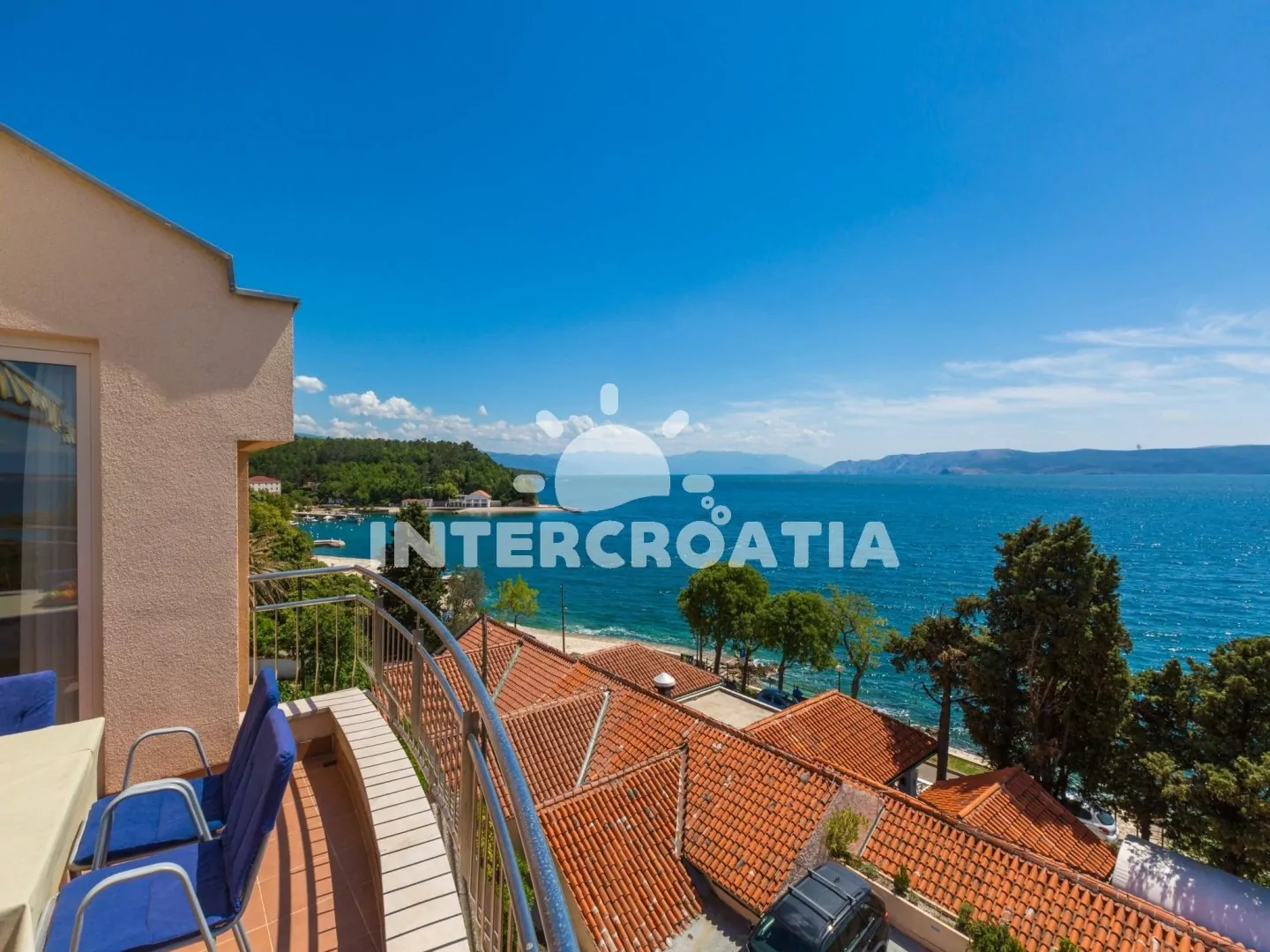 Apartmán (65 m2) s terasou a výhledem na moře, se nachází v 3. patře domu. Apartmán má 3 pokoje a je vhodný pro 4 až 6 osob. Obývací pokoj je spojený s kuchyní. Kuchyňská linka je vybavena sklokeramickou varnou deskou, digestoří, vestavěnou troubou, rychlovarnou konvicí, kávovarem, toustovačem, nádobím a lednicí s mrazákem. Obývací pokoj s jídelním stolem pro 5 osob, rohovou pohovkou (rozložitelná na extra lůžko pro 2 osoby), televizí se satelitním programem, klimatizací a vstupem na terasu. První ložnice s dvoulůžkem, klimatizací a vstupem na terasu. Druhá ložnice s dvěma jednolůžky (patrová postel). Koupelna se sprchovým koutem, umyvadlem, fénem a wc. Hostům je k dispozici parkování u objektu zdarma.