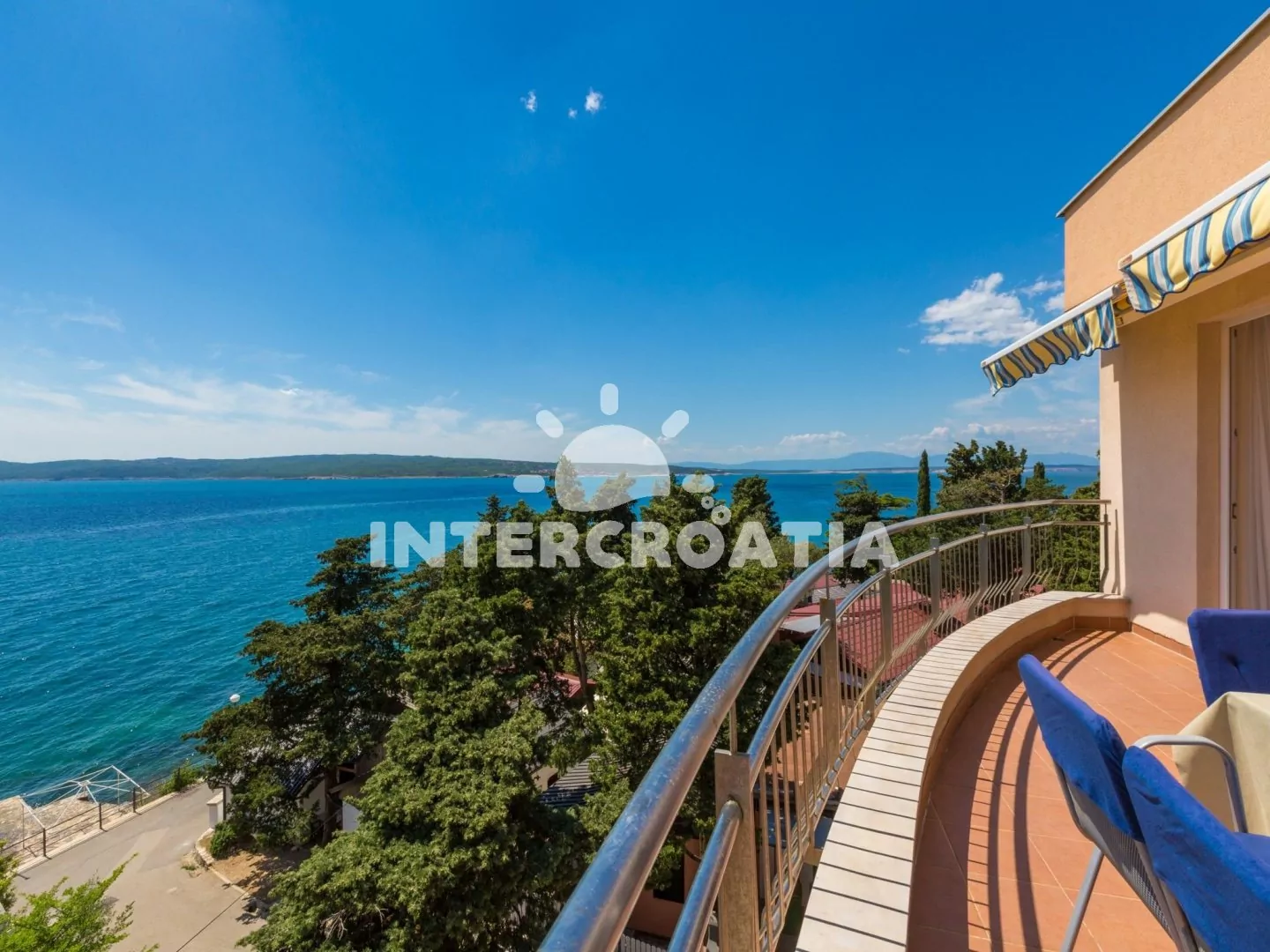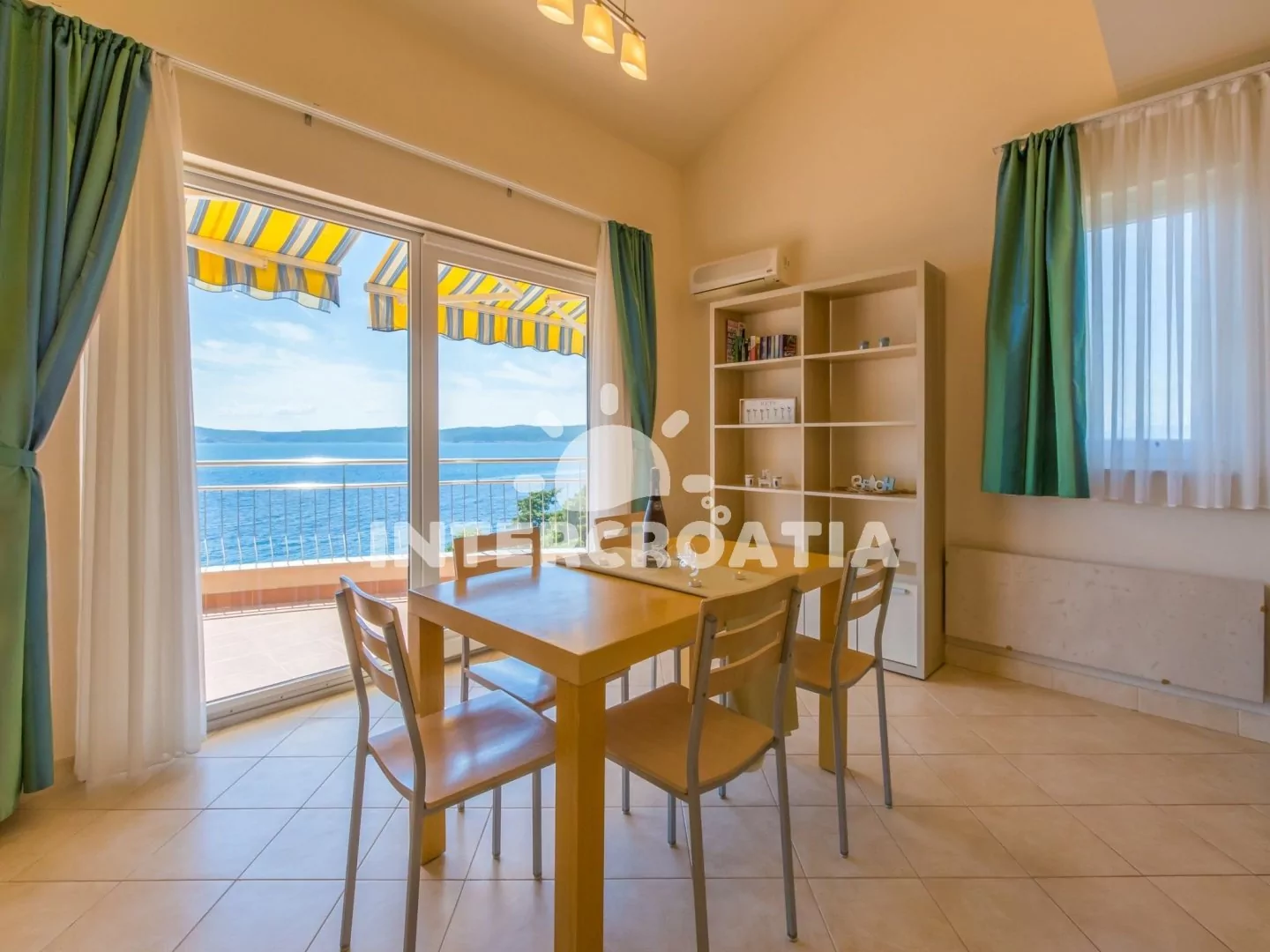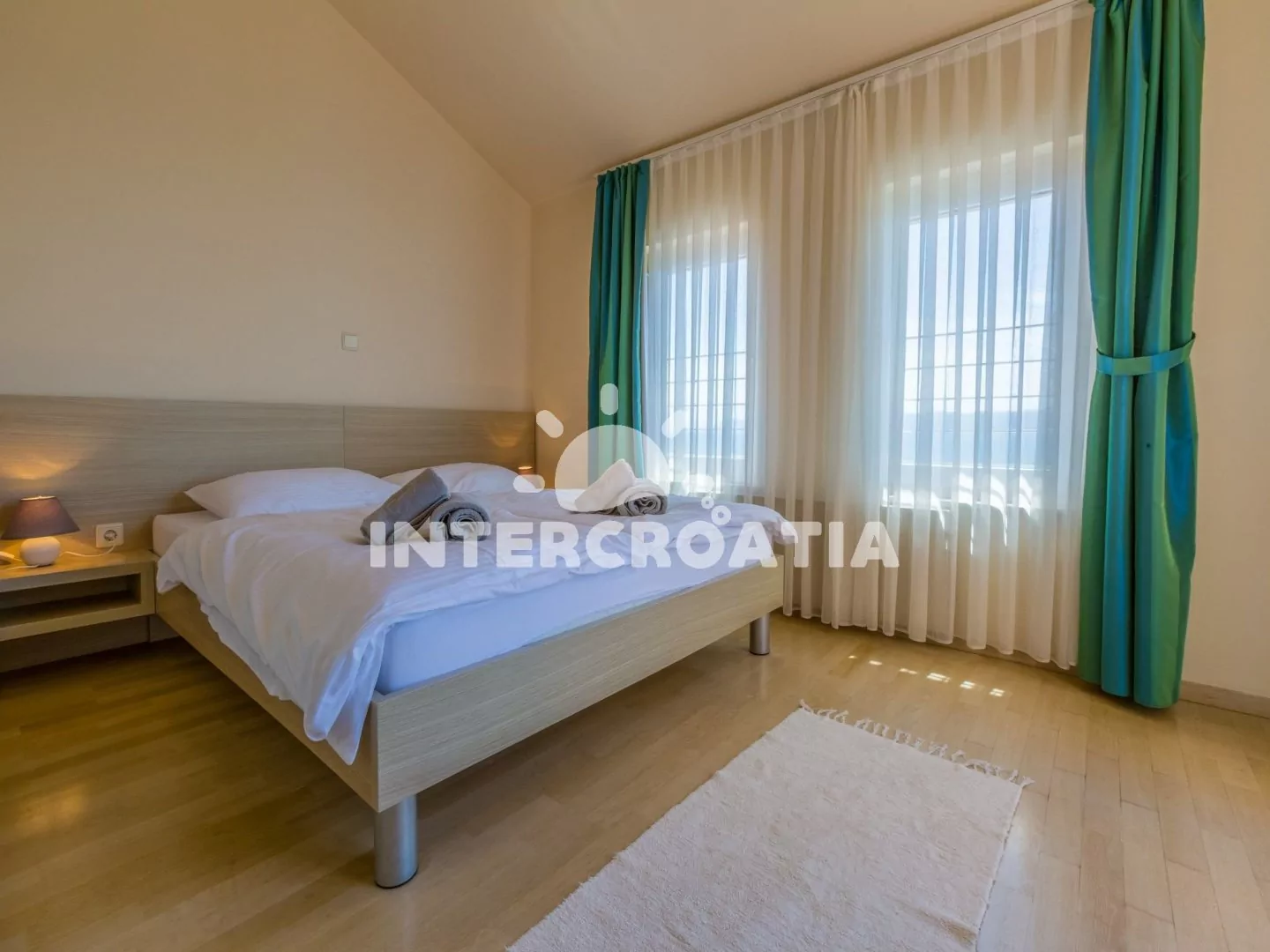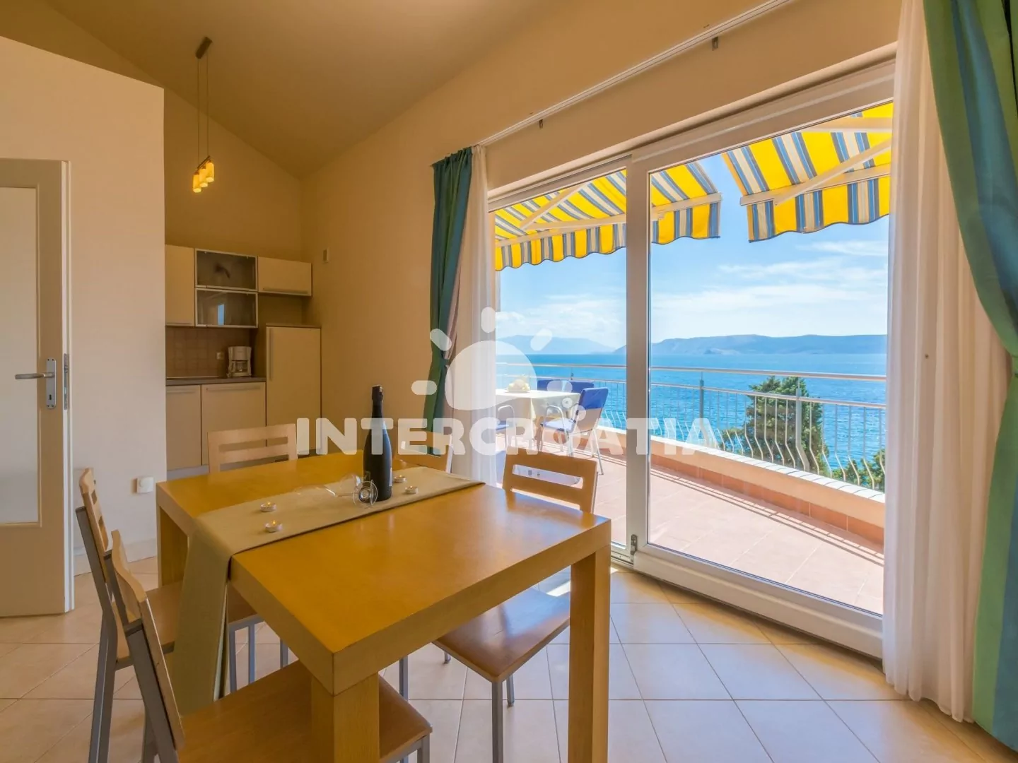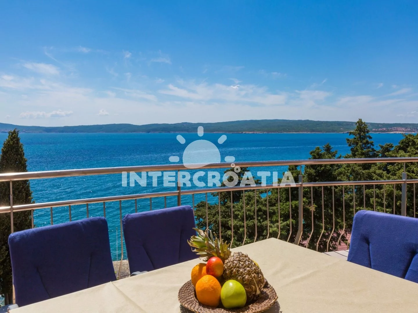 Apartmán (65 m2) s terasou a výhledem na moře, se nachází v 3. patře domu. Apartmán má 3 pokoje a je vhodný pro 4 až 6 osob. Obývací pokoj je spojený s kuchyní. Kuchyňská linka je vybavena sklokeramickou varnou deskou, digestoří, vestavěnou troubou, rychlovarnou konvicí, kávovarem, toustovačem, nádobím a lednicí s mrazákem. Obývací pokoj s jídelním stolem pro 5 osob, rohovou pohovkou (rozložitelná na extra lůžko pro 2 osoby), televizí se satelitním programem, klimatizací a vstupem na terasu. První ložnice s dvoulůžkem, klimatizací a vstupem na terasu. Druhá ložnice s dvěma jednolůžky (patrová postel). Koupelna se sprchovým koutem, umyvadlem, fénem a wc. Hostům je k dispozici parkování u objektu zdarma.